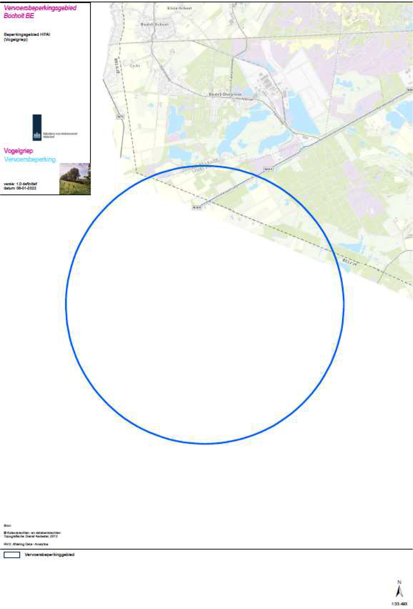 10 km rond de besmette inrichting in Bocholt. Een deel van de beperkingszone
