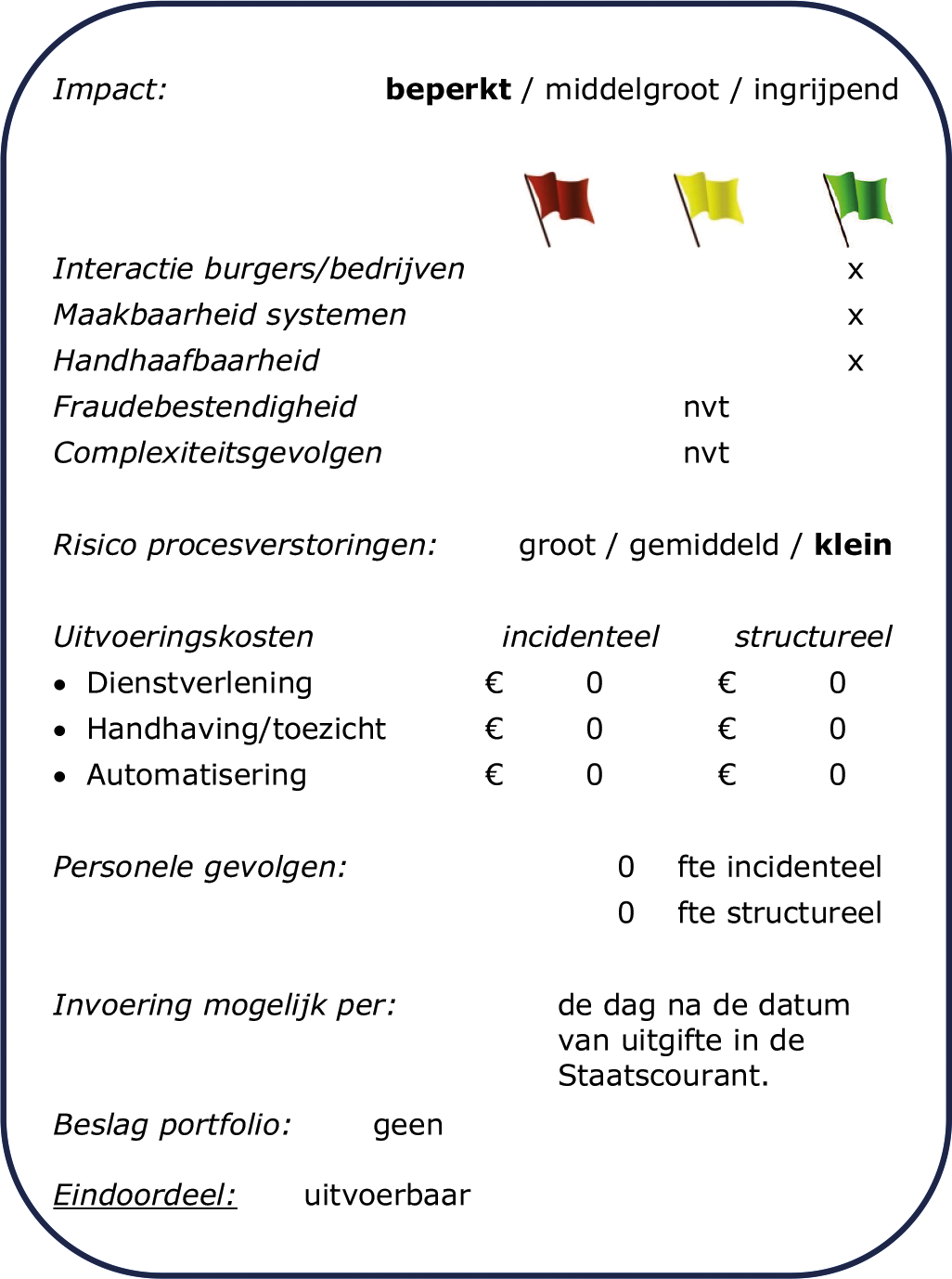 De wijzigingen leiden niet tot een lastenverzwaring voor het bedrijfsleven. Een van de wijzigingen wordt toegevoegd op verzoek van het bedrijfsleven, zodat aangiften sneller kunnen worden behandeld door de Douane en goederen eerder kunnen worden vrijgegeven. Dit betekent de facto dan ook een vermindering van de regeldruk voor het bedrijfsleven.