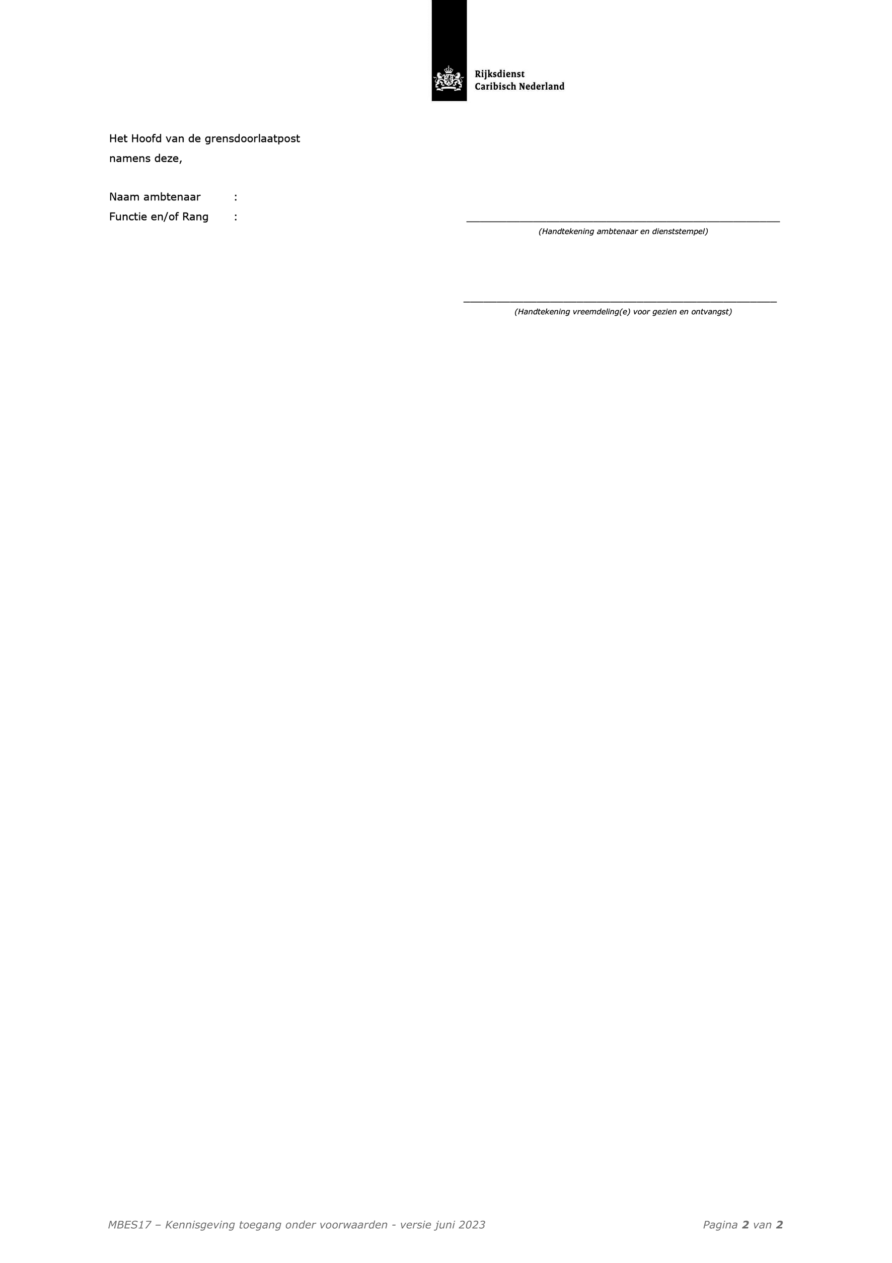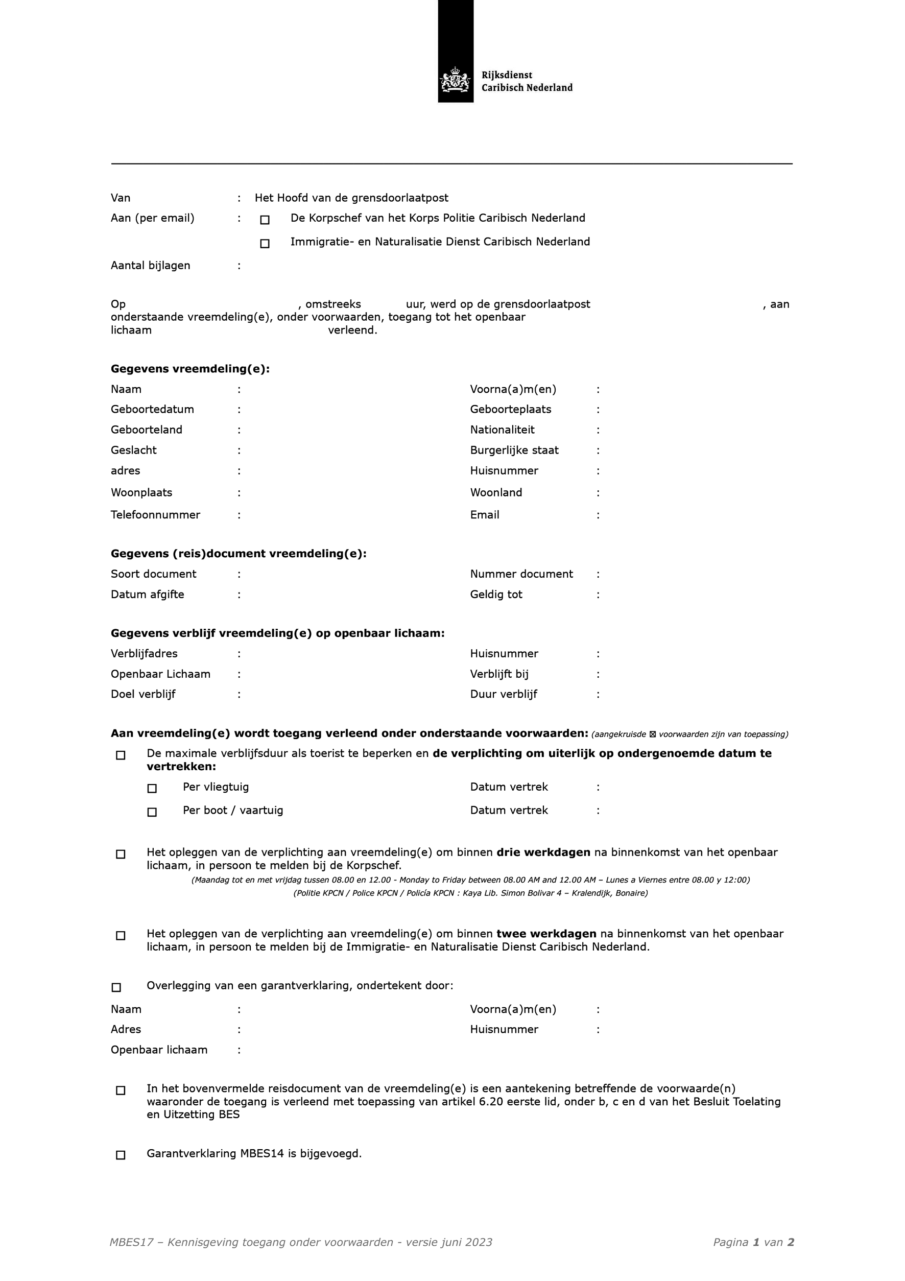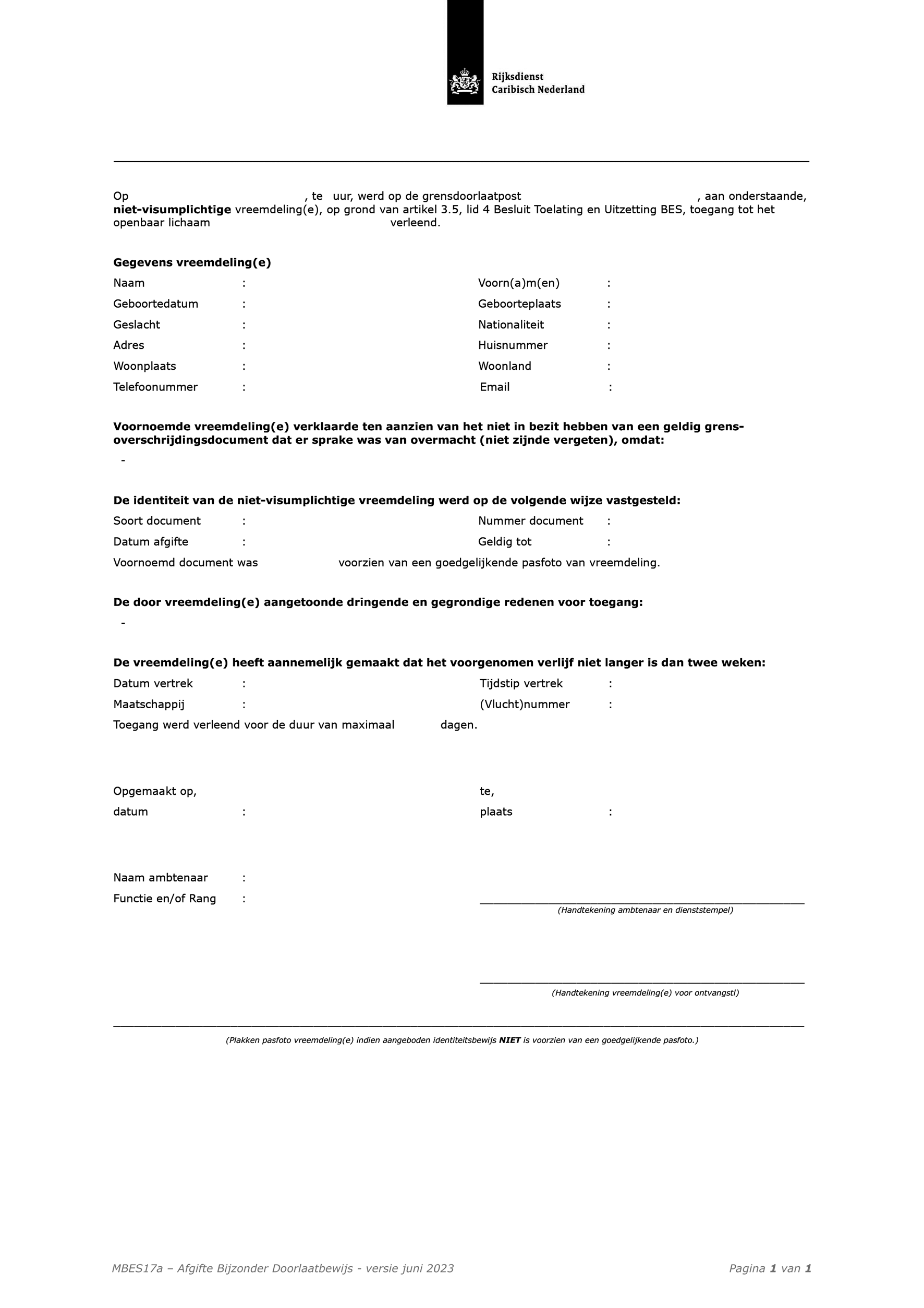 Aan niet-visumplichtige vreemdelingen (voor de visum wet- en regelgeving: zie de Rijksvisumwet) die bij binnenkomst niet beschikken over het vereiste document voor grensoverschrijding kan aan de grens, met het oog op kort verblijf, een bijzonder doorlaatbewijs worden afgegeven. Dit doorlaatbewijs is als model opgenomen in de RTU-BES. Dit doorlaatbewijs is als model MBES17a opgenomen in de CTU. Dit bijzonder doorlaatbewijs wordt na afgifte hiervan aangemerkt als een geldig document voor grensoverschrijding.