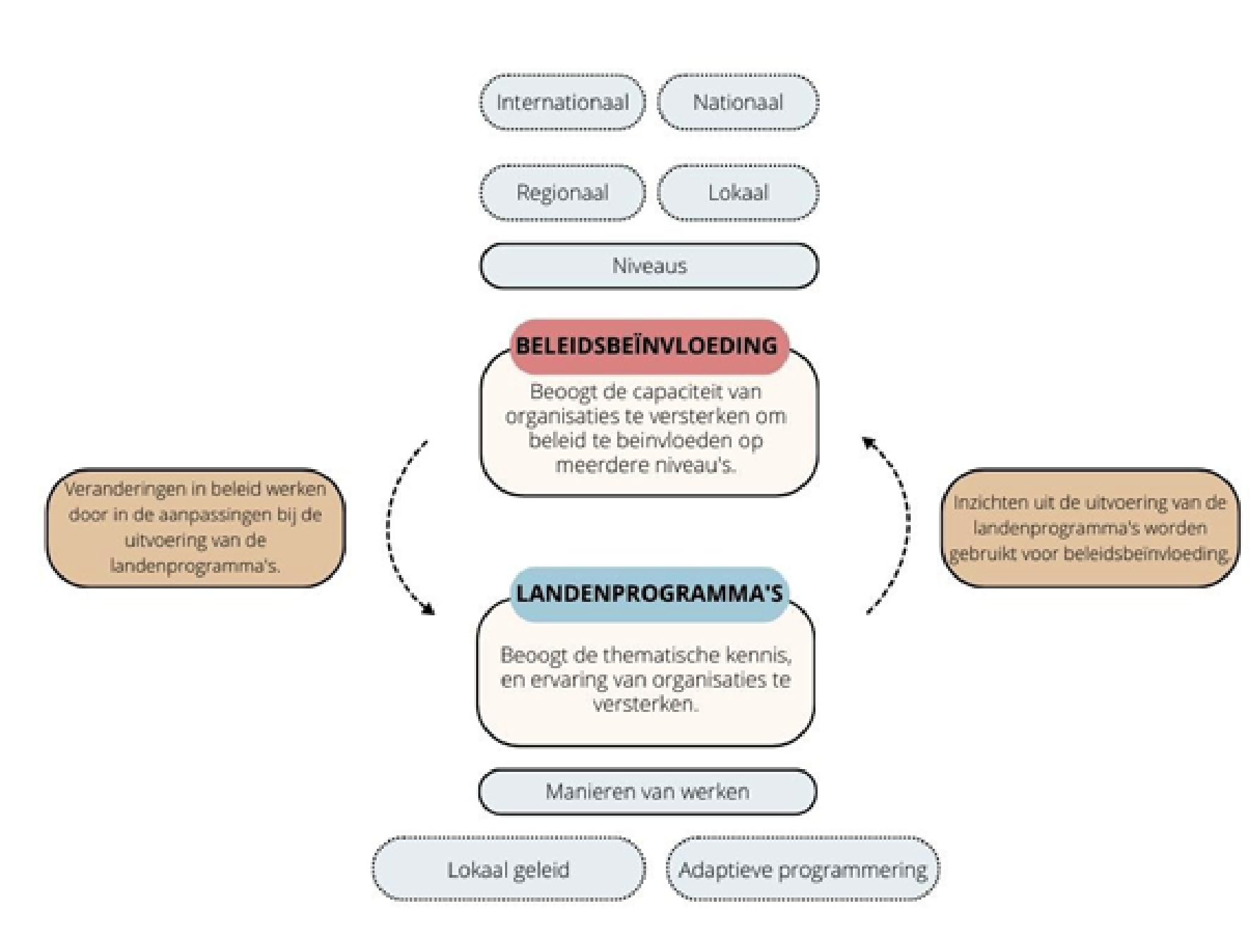 • Gericht op het langduriger ondersteunen van organisaties die gespecialiseerd zijn op de relevante beleidsthema’s, waarbij vertrouwen in de kennis en kunde van de organisaties voorop staat (sturing op outcome niveau); • Nadruk op inzet waarin leren en het tussentijds bijsturen van de inzet centraal staat (adaptief programmeren); • Nadruk op lokaal geleide inzet, zowel qua ontwikkeling van de inzet (design) als qua uitvoering; • Nadruk op het versterken van beleidsbeïnvloeding gebaseerd op inzichten die voortkomen uit de uitvoering van activiteiten op landenniveau (learning loop tussen beleid en resultaten van programmering); • Nadruk op resultaten die het landenniveau overstijgen (geen sturing op landenniveau); • Nadruk op resultaten die binnen de span of control van de aanvragers ligt (bescheidenheid en realisme). |