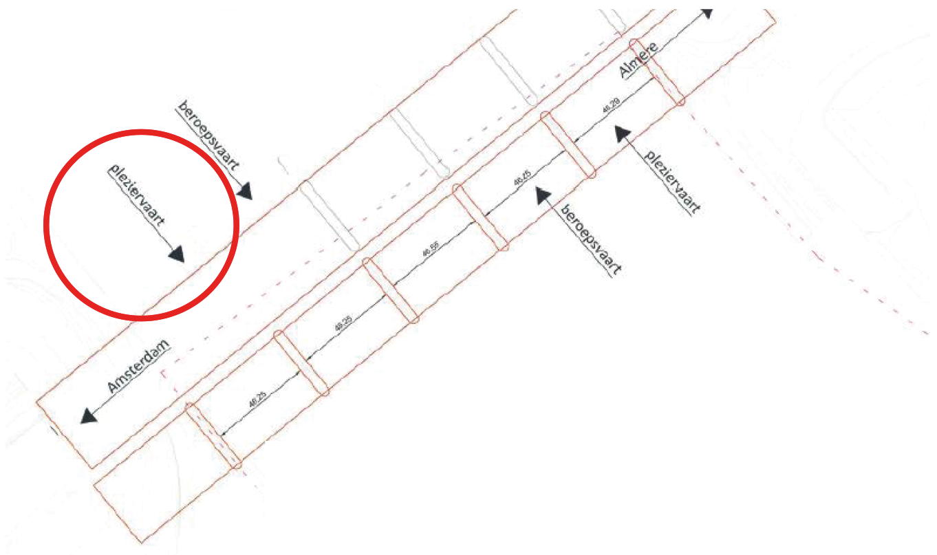 In het rood de afgesloten doorvaart voor de pleziervaart. De pleziervaart kan hier gebruik maken van de geul voor de beroepsvaart.