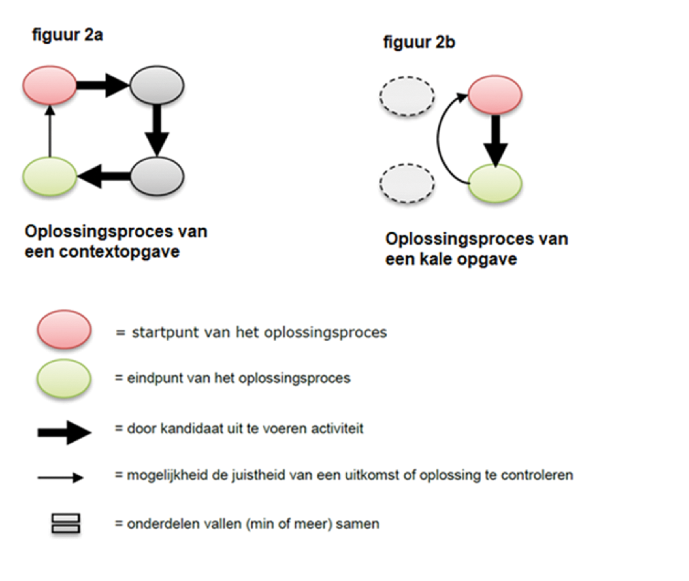 Bij een contextopgave wordt de probleemoplossingscyclus van figuur 1 volledig doorlopen. Dit is schematisch weergegeven in figuur 2a. Een kale opgave is een opgave zonder benoemde getallen en waarbij alleen stap 4 van het oplossingsproces wordt doorlopen (zie ook figuur 2b). Onder kale opgaven worden ook omzettingen in het metriek stelsel verstaan die alleen rechtstreeks via stap 4 worden opgelost.