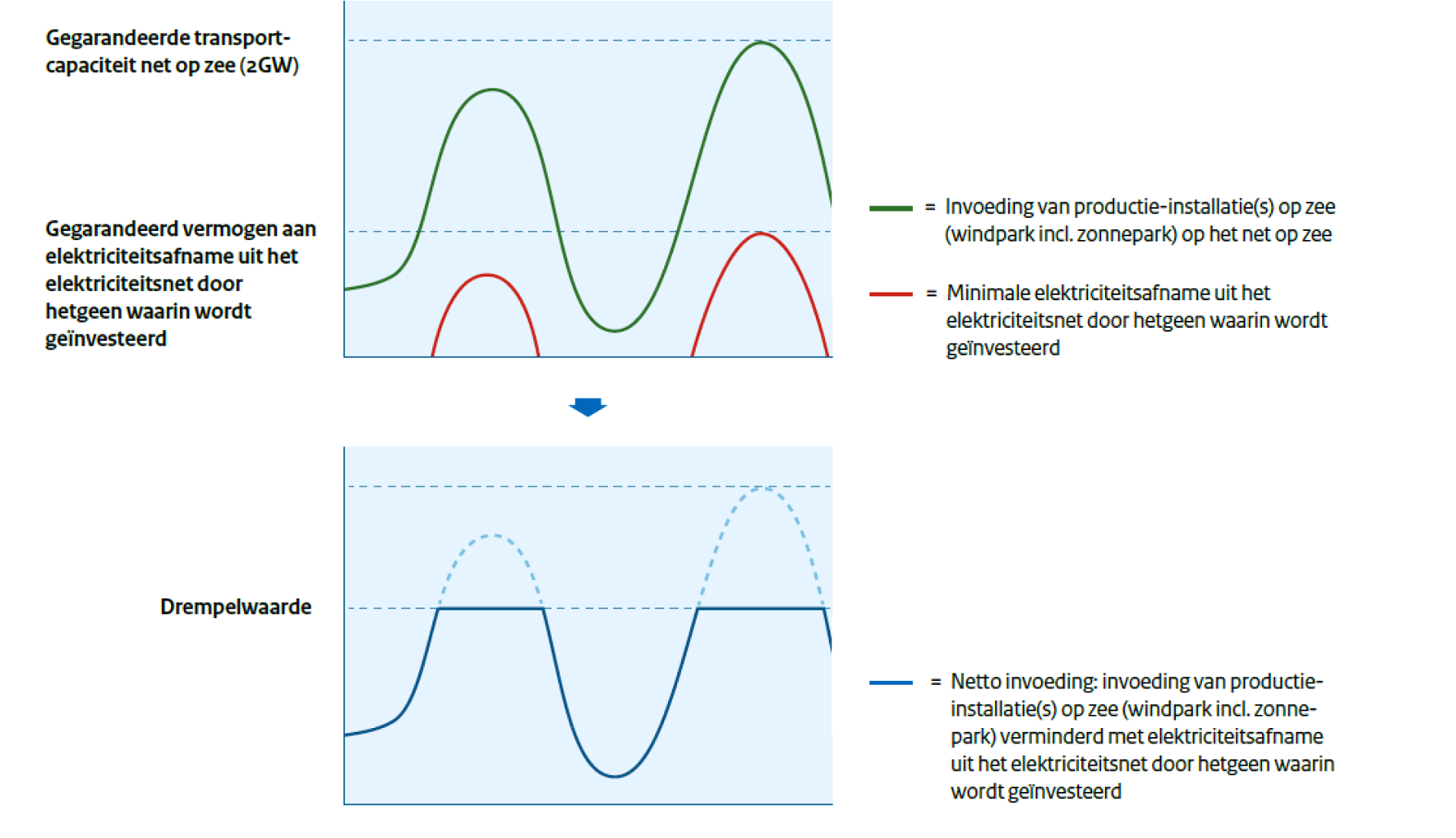 Invoeding van productie-installatie(s) (windpark incl. zonnepark) op het net op zee – minimale elektriciteitsafname uit het elektriciteitsnet door hetgeen waarin wordt geïnvesteerd ≤ Transportcapaciteit net op zee – gegarandeerd vermogen aan elektriciteitsafname uit het elektriciteitsnet door hetgeen waarin wordt geïnvesteerd (die onderbouwd mee kan worden geteld) |