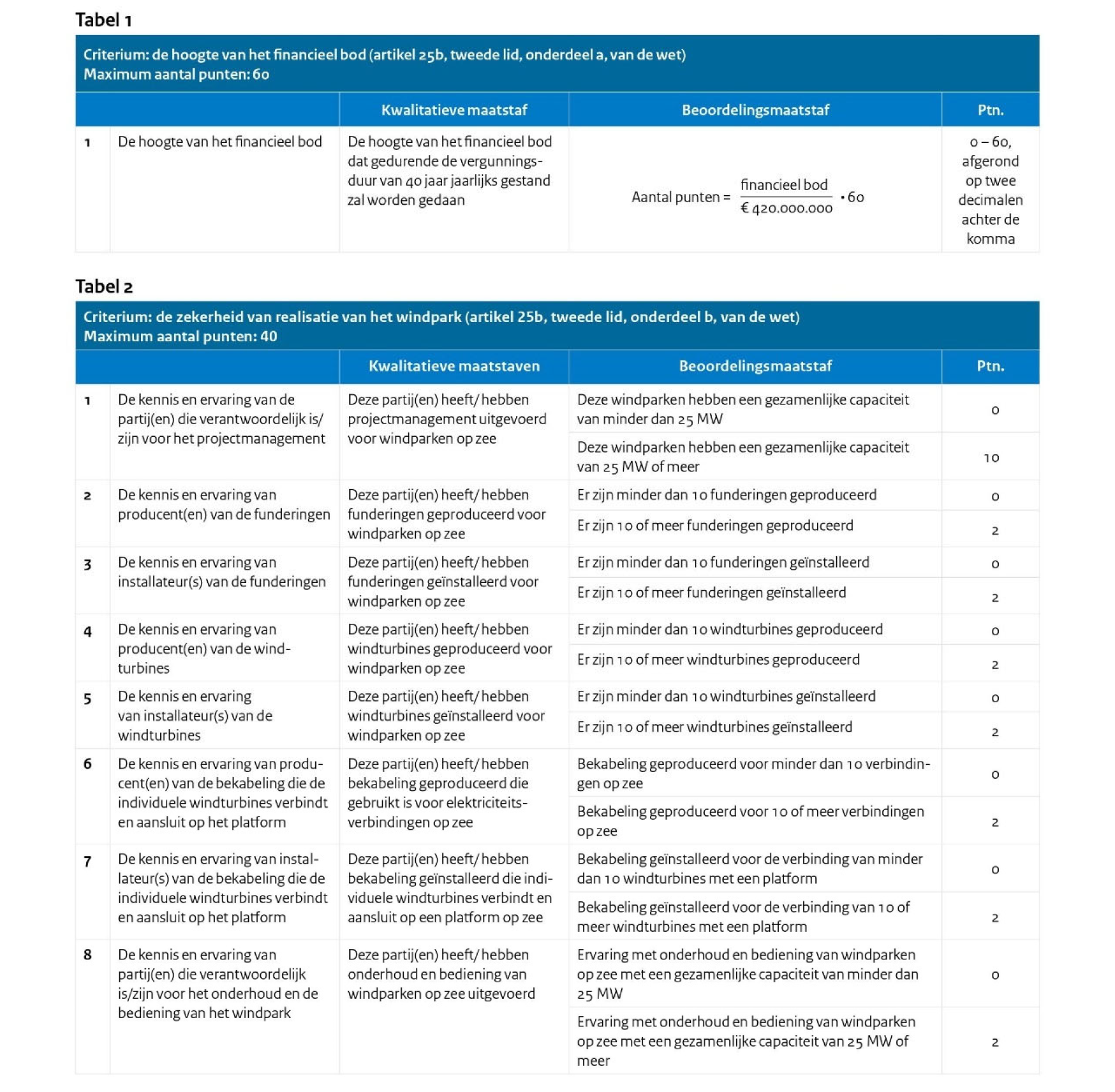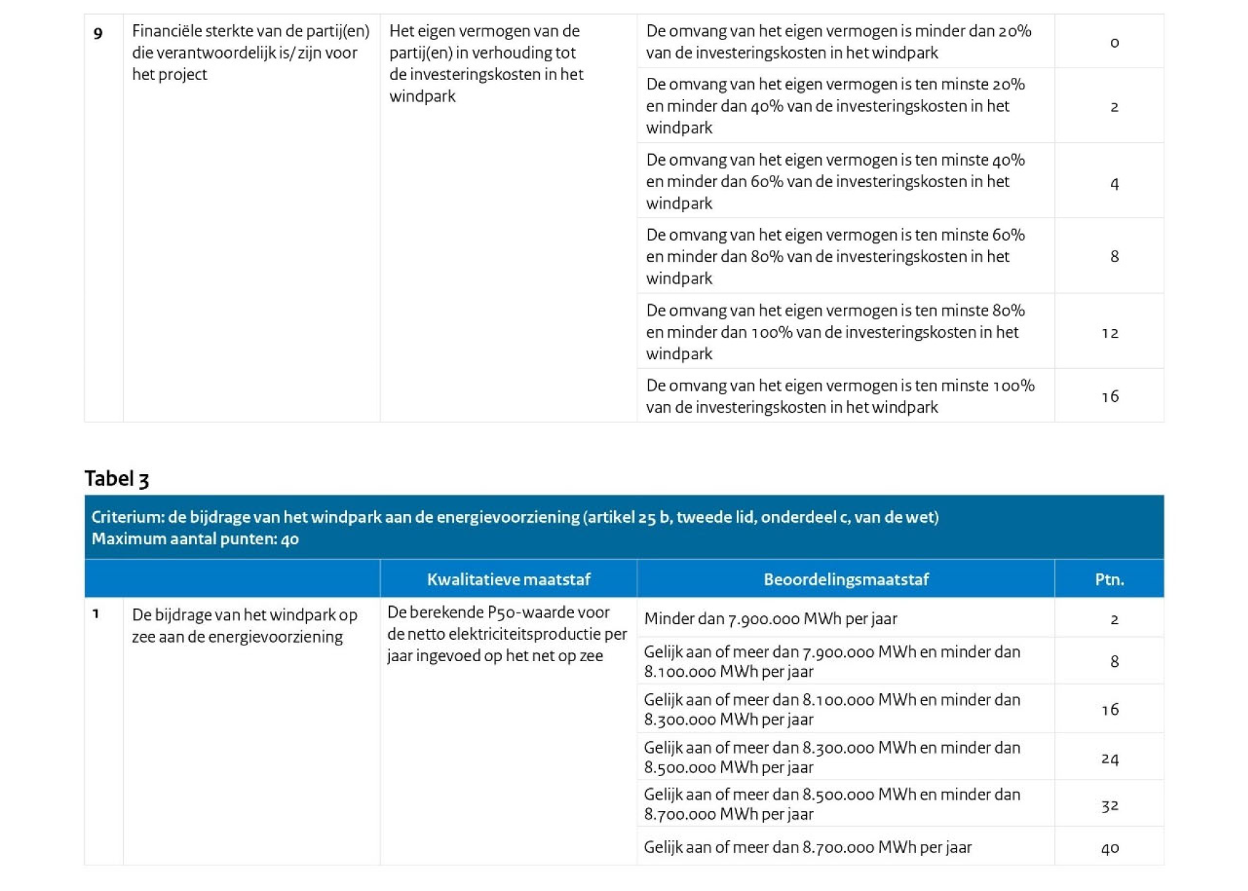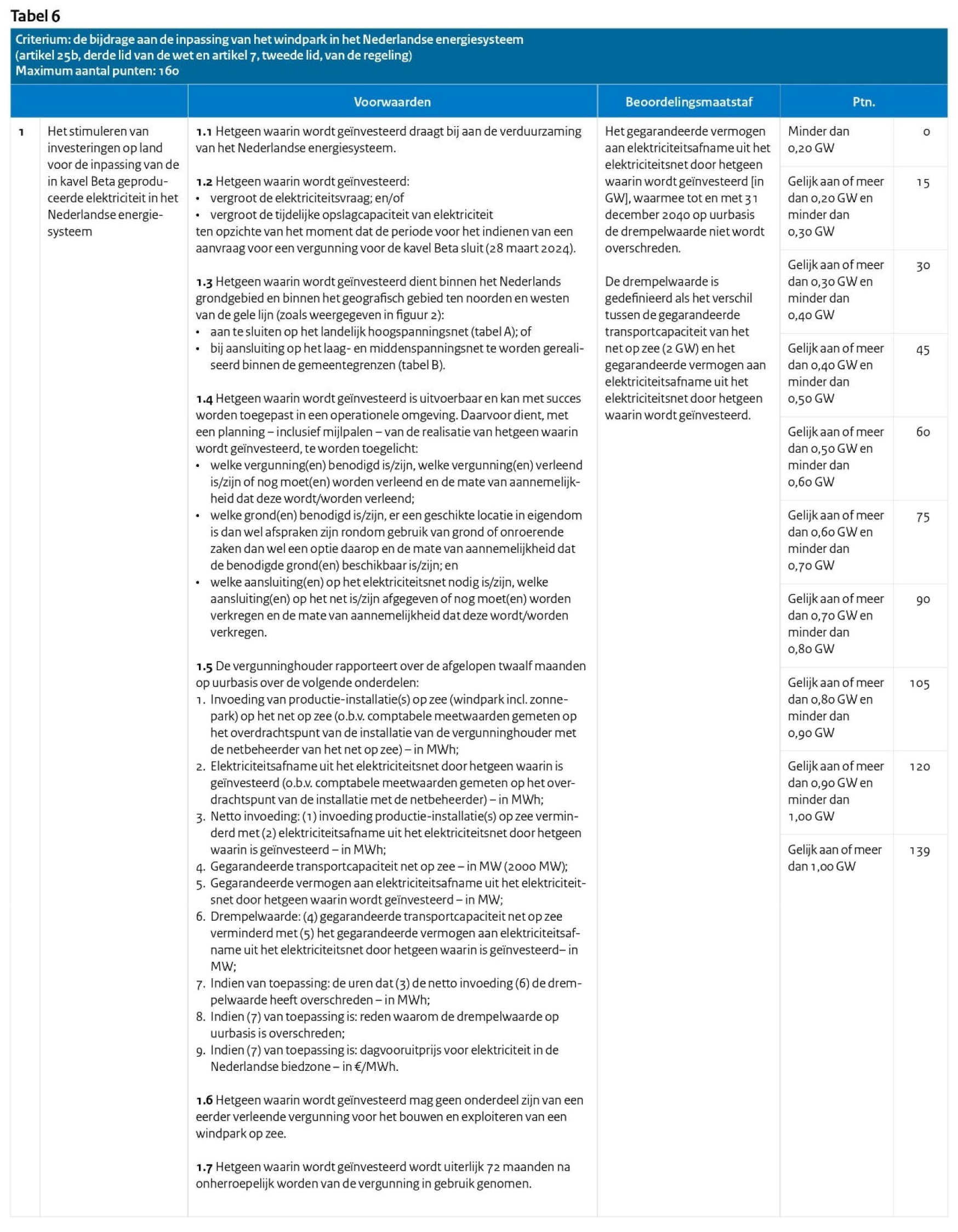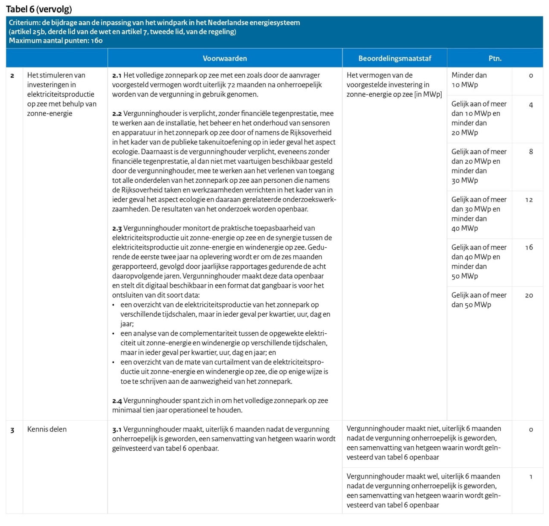 Tabel 6 ‘de bijdrage aan de inpassing van het windpark in het Nederlandse energiesysteem’ is aangepast. Zo is onder meer verduidelijkt dat tijdelijke opslag van elektriciteit onderdeel kan uitmaken van de aanvraag en dat het moet gaan om nieuwe investeringen ten opzichte van het moment van het sluiten van de aanvraagperiode. Daarnaast is de termijn waarin de aangeboden investering in gebruik moet worden genomen aangepast van 60 naar 72 maanden en wordt er beoordeeld op basis van het gegarandeerde vermogen aan elektriciteitsafname in plaats van de capaciteit van de investeringen. Tot slot is de capaciteit van de voorgestelde investering in zonne-energie op zee aangepast van 100 MWp naar 50 MWp.