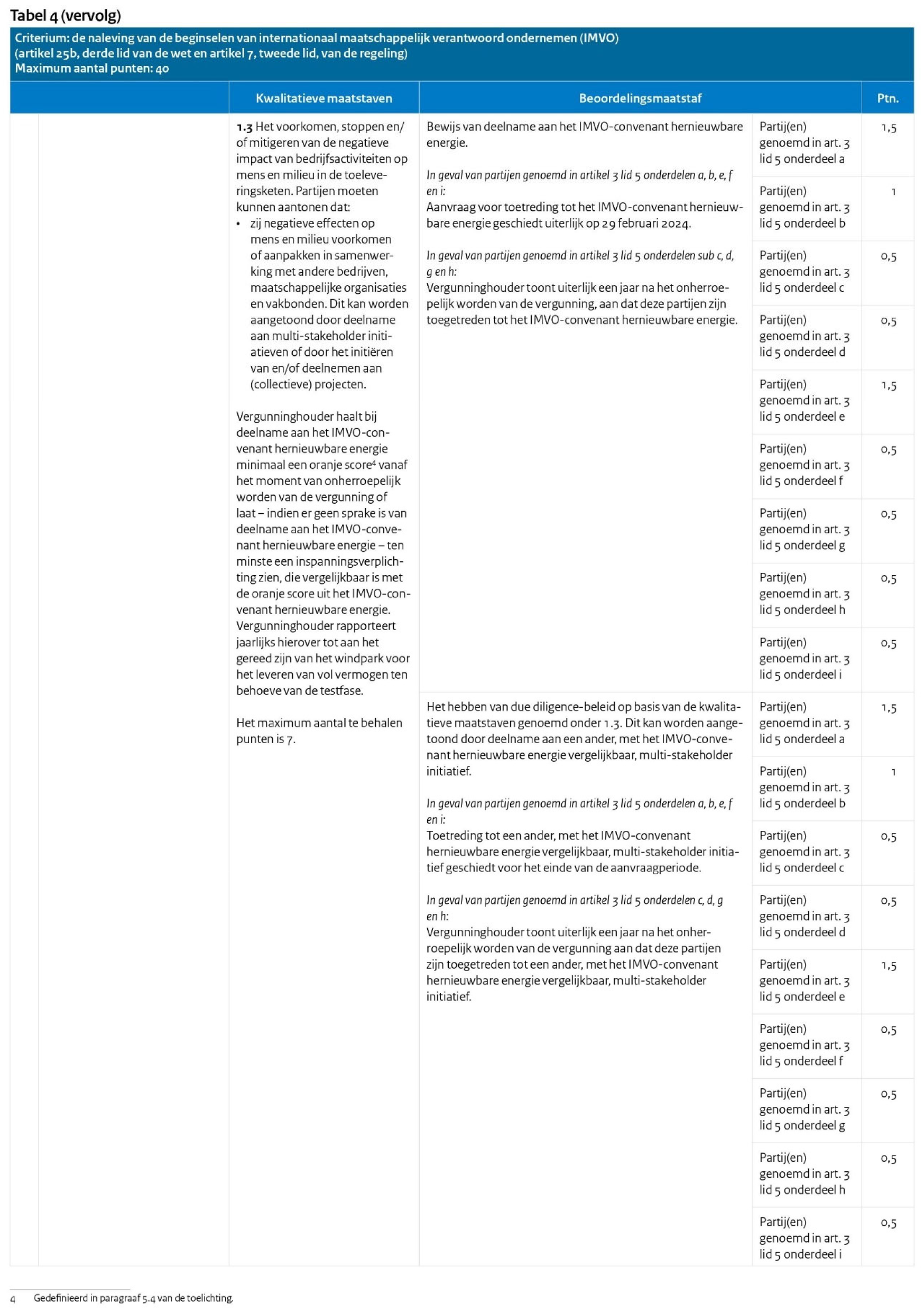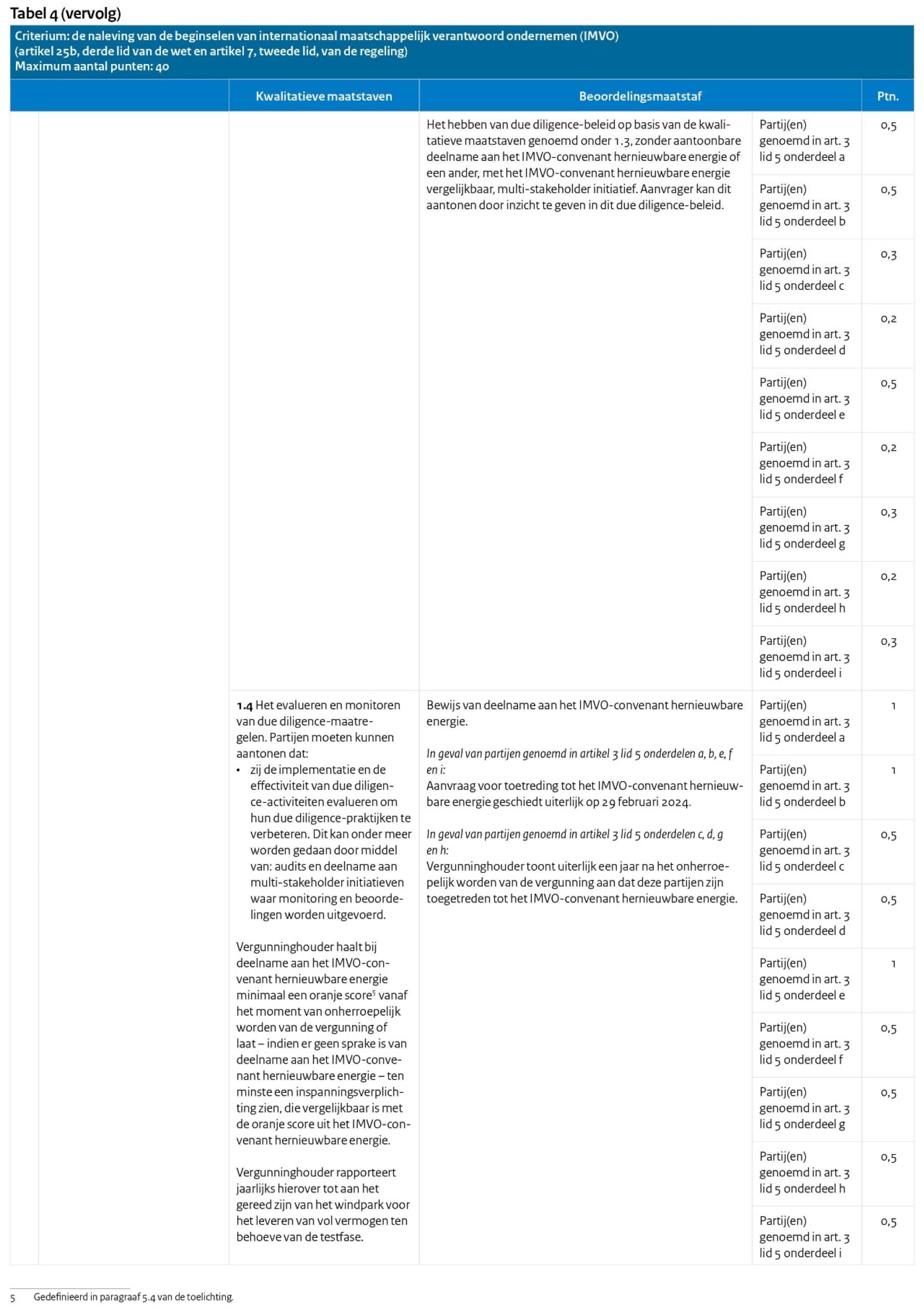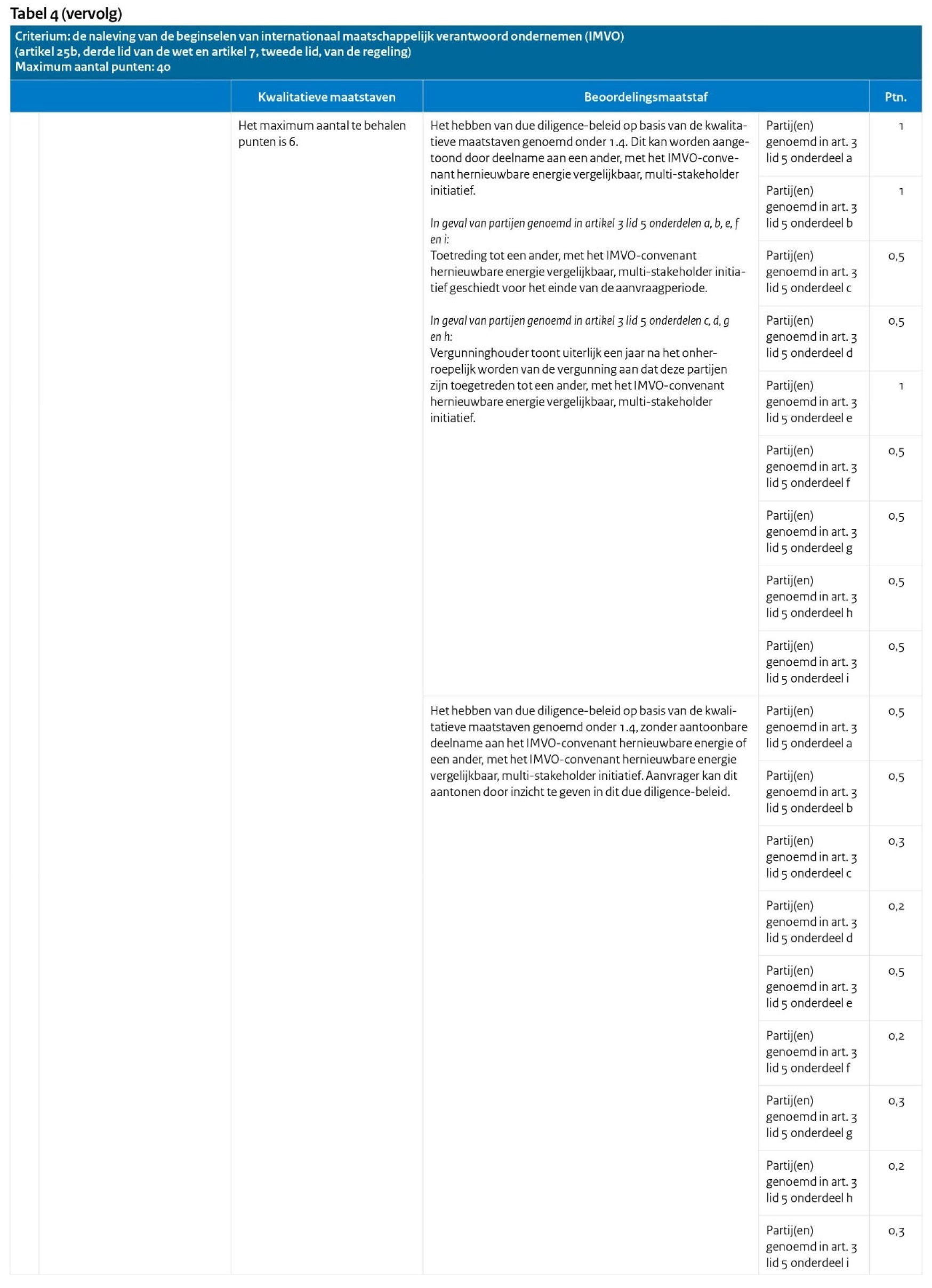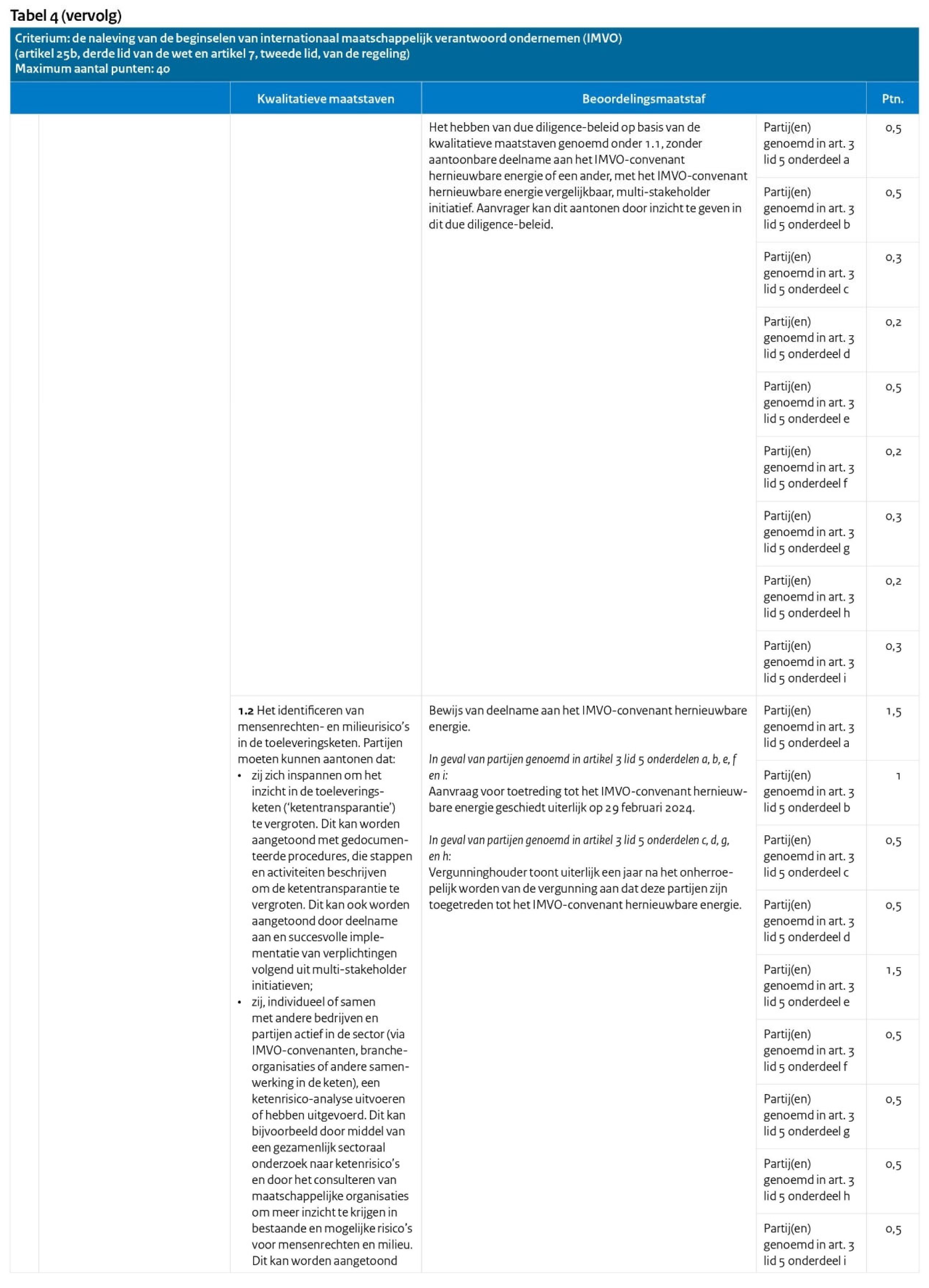In tabel 4 ‘de naleving van de beginselen van internationaal maatschappelijk verantwoord ondernemen’ zijn de partijen waarop het IMVO-criterium van toepassing is, zoals genoemd in artikel 3 lid 5, opgesplitst op basis van het moment van toetreding. De partijen onder artikel 3 lid 5 sub a, b, e, f en i zullen voorafgaand aan het indienen van hun aanvraag moeten deelnemen aan het IMVO-convenant hernieuwbare energie of een met het IMVO-convenant hernieuwbare energie vergelijkbaar multi-stakeholder initiatief om het maximaal aantal punten te kunnen krijgen. Uiterlijk een jaar na het onherroepelijk worden van de vergunning, toont de vergunninghouder aan dat de partijen onder artikel 3 lid 5 sub c, d, g en h zijn toegetreden tot het IMVO-convenant hernieuwbare energie of een met het IMVO-convenant hernieuwbare energie vergelijkbaar multi-stakeholder initiatief om het maximaal aantal punten voor deze partijen te kunnen krijgen. Het moment van toetreding van deze partijen verschilt om enerzijds de regeldruk voor de desbetreffende partijen in verband met het toetreden tot het IMVO-convenant hernieuwbare energie te beperken en anderzijds de regeldruk naar aanleiding van de beoordeling van deze aanvragen voor de SER te beperken.