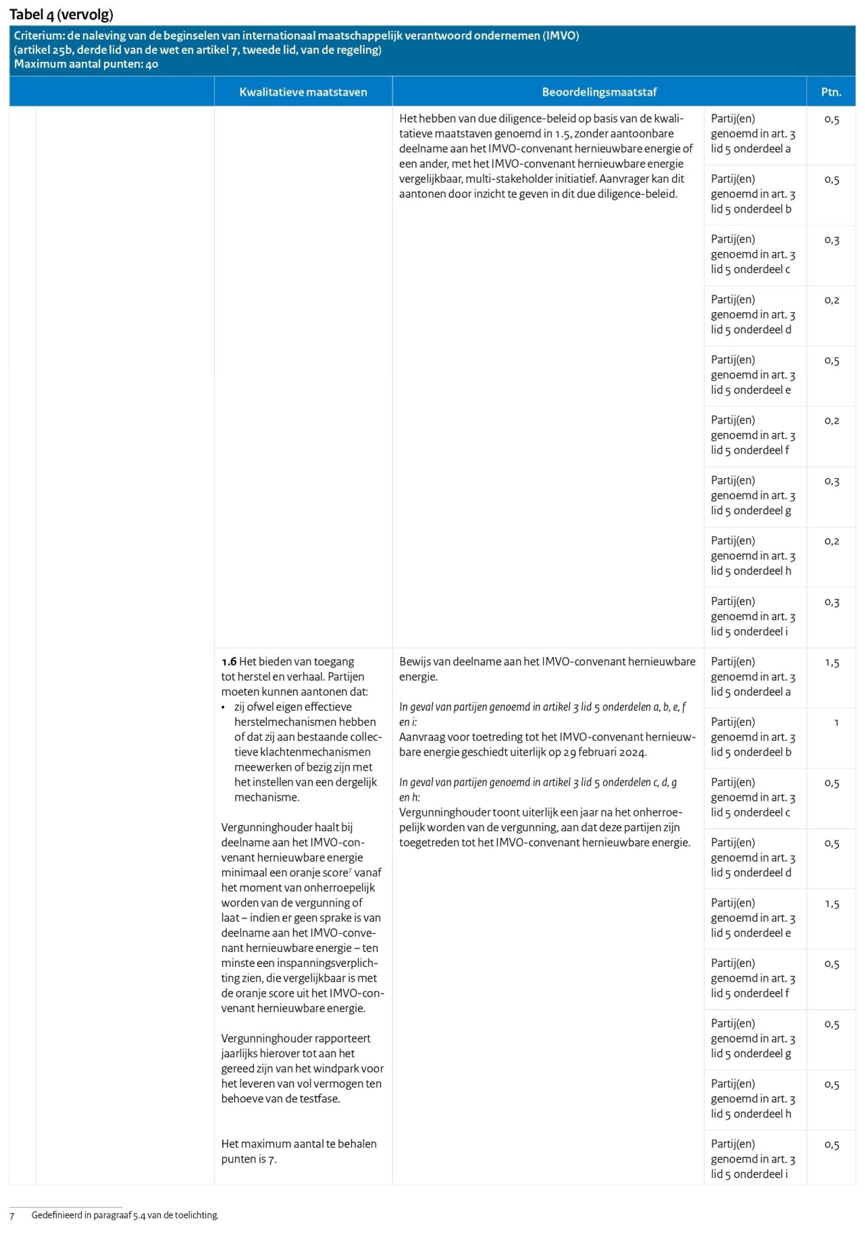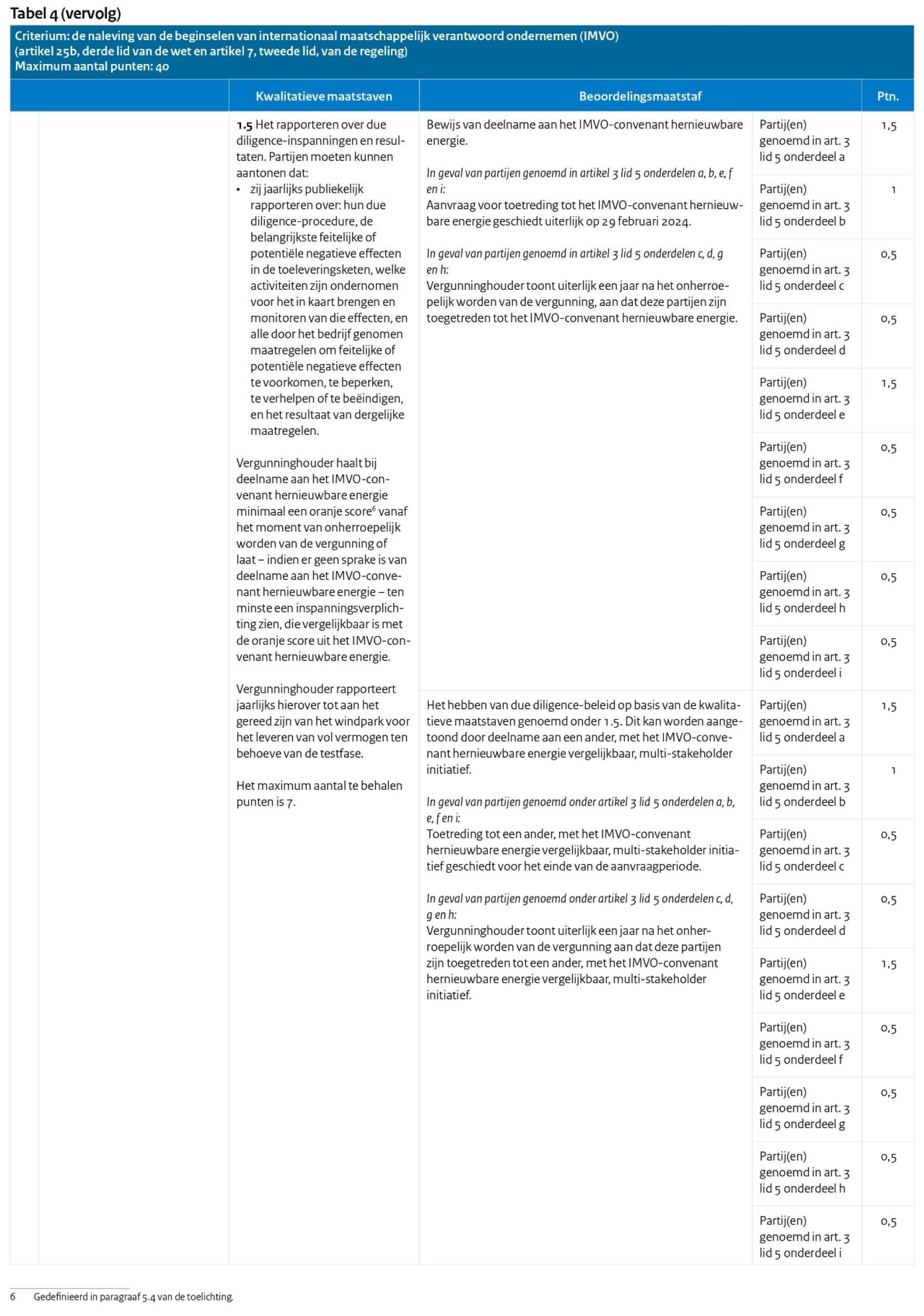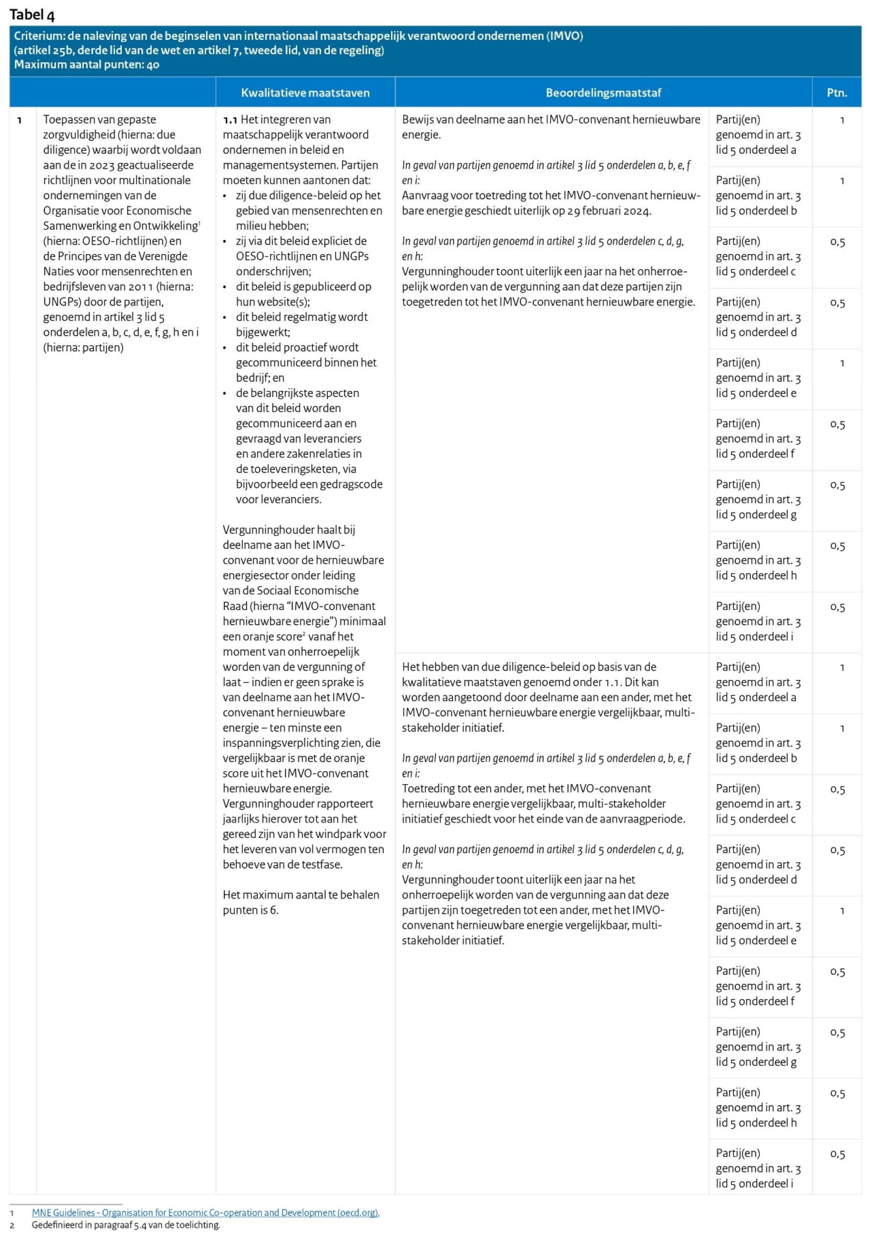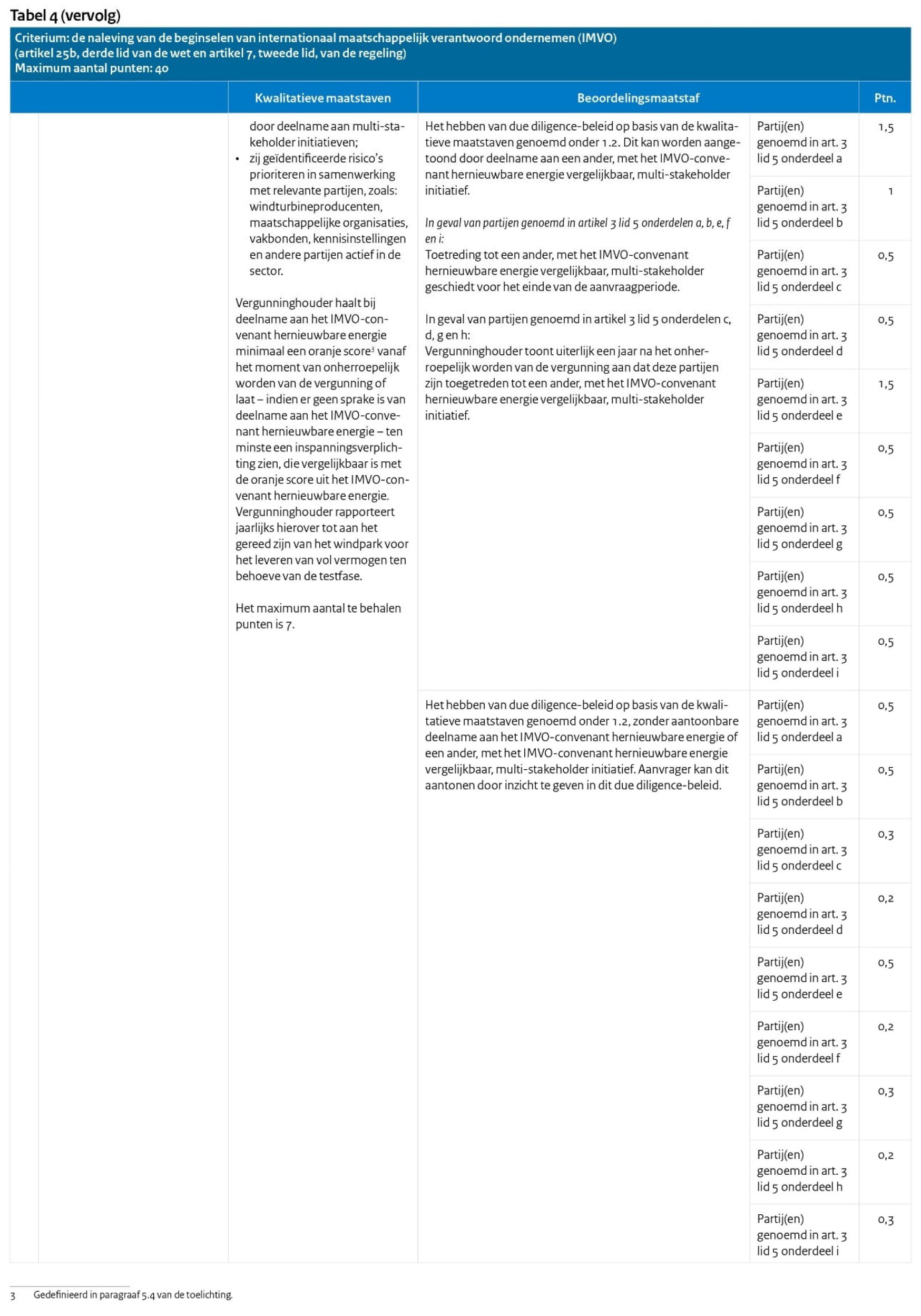 In tabel 4 ‘de naleving van de beginselen van internationaal maatschappelijk verantwoord ondernemen’ zijn de partijen waarop het IMVO-criterium van toepassing is, zoals genoemd in artikel 3 lid 5, opgesplitst op basis van het moment van toetreding. De partijen onder artikel 3 lid 5 sub a, b, e, f en i zullen voorafgaand aan het indienen van hun aanvraag moeten deelnemen aan het IMVO-convenant hernieuwbare energie of een met het IMVO-convenant hernieuwbare energie vergelijkbaar multi-stakeholder initiatief om het maximaal aantal punten te kunnen krijgen. Uiterlijk een jaar na het onherroepelijk worden van de vergunning, toont de vergunninghouder aan dat de partijen onder artikel 3 lid 5 sub c, d, g en h zijn toegetreden tot het IMVO-convenant hernieuwbare energie of een met het IMVO-convenant hernieuwbare energie vergelijkbaar multi-stakeholder initiatief om het maximaal aantal punten voor deze partijen te kunnen krijgen. Het moment van toetreding van deze partijen verschilt om enerzijds de regeldruk voor de desbetreffende partijen in verband met het toetreden tot het IMVO-convenant hernieuwbare energie te beperken en anderzijds de regeldruk naar aanleiding van de beoordeling van deze aanvragen voor de SER te beperken.