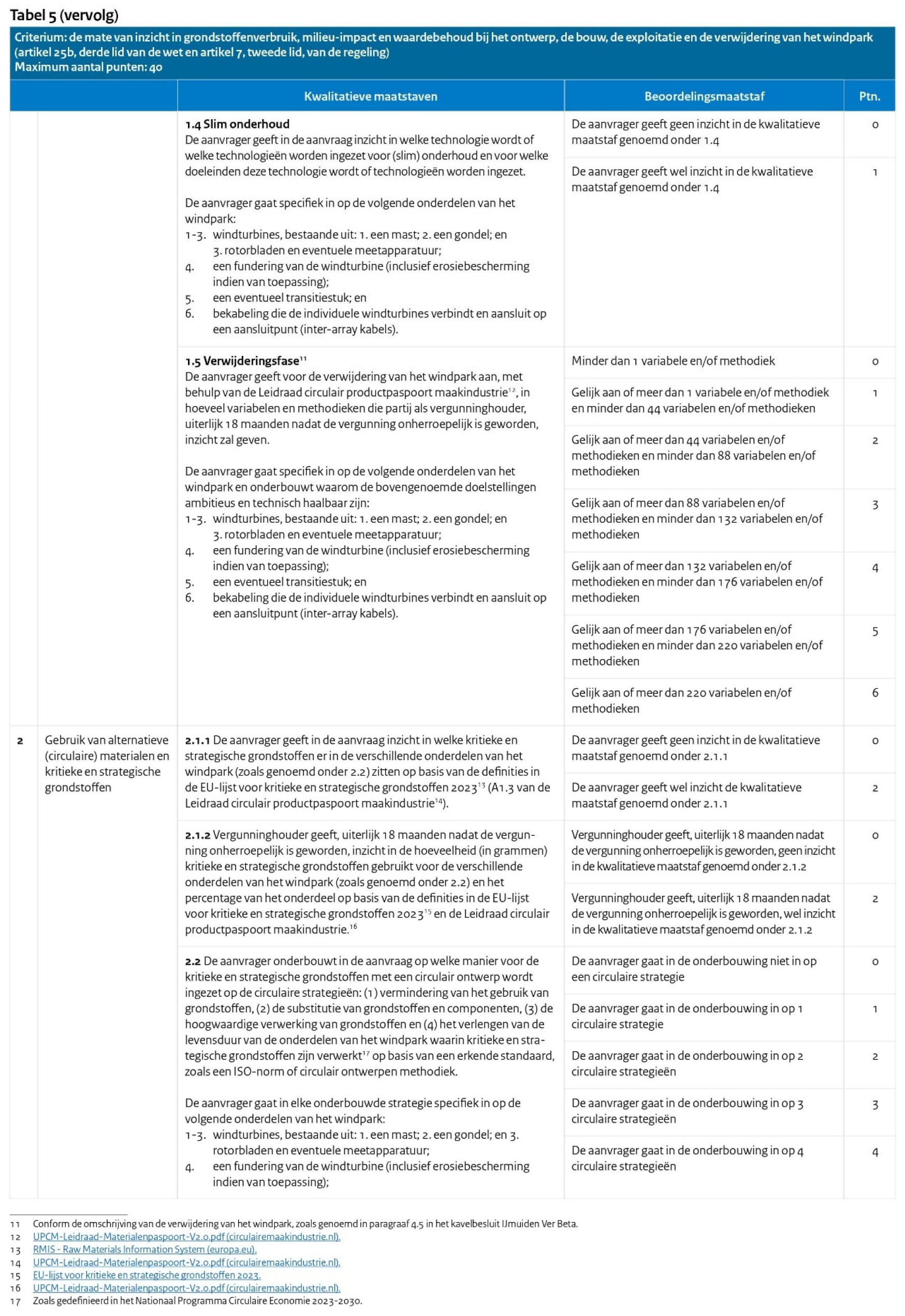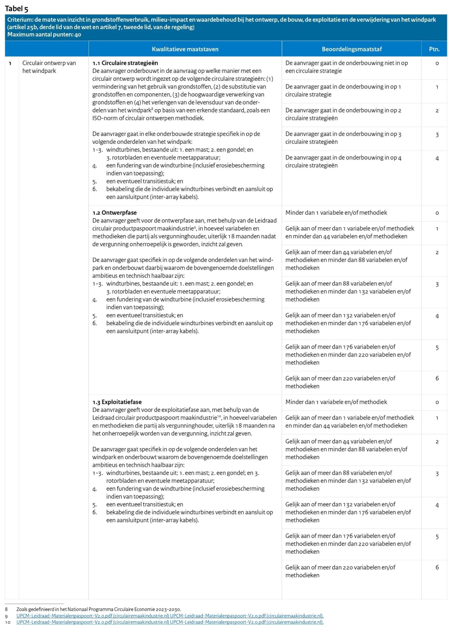 In tabel 5 ‘de mate van inzicht in grondstoffenverbruik, milieu-impact en waardebehoud bij het ontwerp, de bouw, de exploitatie en de verwijdering van het windpark’ wordt de aanvrager gevraagd aan te geven over welke variabelen en methodieken, op basis van de leidraad circulair productpaspoort maakindustrie, deze partij als vergunninghouder uiterlijk 18 maanden na het onherroepelijk worden van de vergunning informatie kan verstrekken. Daarnaast kan de aanvrager hoger worden gerangschikt door toe te zeggen welke informatie deze partij uiterlijk 18 maanden na het verkrijgen van de vergunning inzicht zal geven. Op deze manier is het niet meer noodzakelijk om voor het doen van de aanvraag al contracten af te sluiten met de toeleveringsketen.