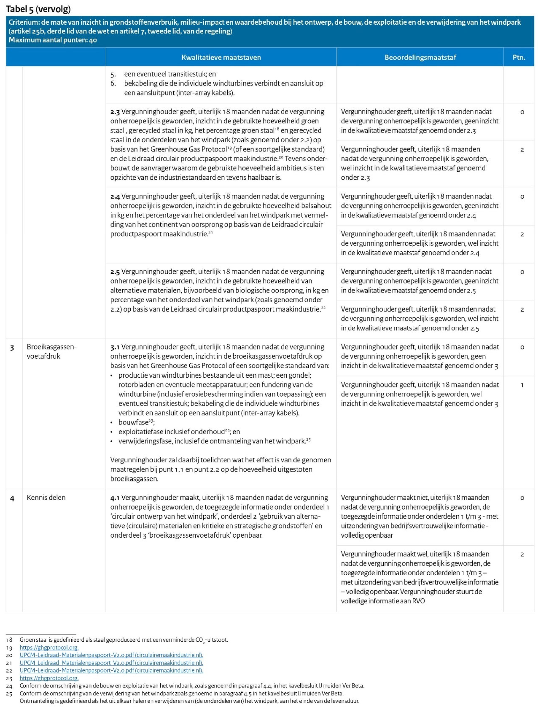 Onderdeel 3 van tabel 5 richt zich op inzicht krijgen in de broeikasgassenvoetafdruk van de productie van de onderdelen van het windpark, de bouwfase, exploitatiefase inclusief onderhoud en de verwijderingsfase van het windpark. De aanvrager krijgt het maximaal aantal punten toegekend, indien deze partij als vergunninghouder zowel inzicht geeft in de broeikasgassenvoetafdruk als toelicht welk effect de genomen maatregelen onder onderdelen 1.1 en 2.2 van deze tabel hierop hebben. De vergunninghouder mag hierbij gebruik maken van het Greenhouse Gas Protocol17 of een soortgelijke standaard.