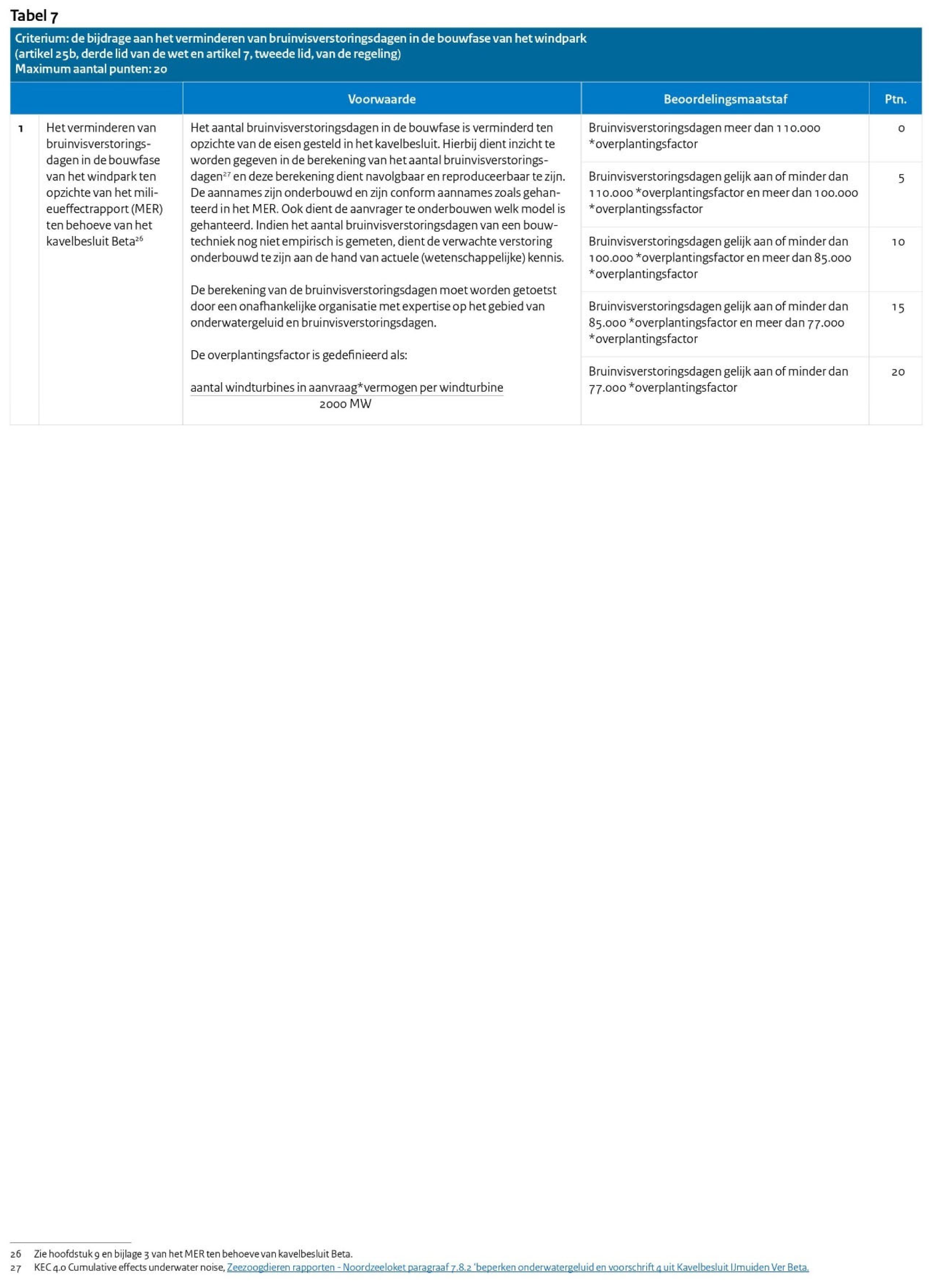 In lijn met het Kader Ecologie en Cumulatie (KEC) 4.024 en afspraken 5.6 en 5.7 uit het Noordzeeakkoord25 worden ontwikkelaars gestimuleerd om drukfactoren op bruinvissen te verminderen. Bij het criterium ‘de bijdrage aan het verminderen van bruinvisverstoringsdagen in de bouwfase van het windpark’ (tabel 7 van de bijlage) wordt een aanvraag hoger gerangschikt naarmate het aantal bruinvisverstoringsdagen tijdens de bouwfase wordt teruggebracht ten opzichte van het maximum in het kavelbesluit.26 Voor de toekomstige uitrol van windenergie op zee is het essentieel om technieken te blijven ontwikkelen om het aantal bruinvisverstoringsdagen te verminderen. Verschillende activiteiten, zoals mitigerende maatregelen, geluidsvermindering, vermindering van het aantal turbines en innovatieve bouwtechnieken, kunnen hiertoe worden ingezet. Met dit criterium worden ontwikkelaars daartoe gestimuleerd, bovenop de eisen in het kavelbesluit.