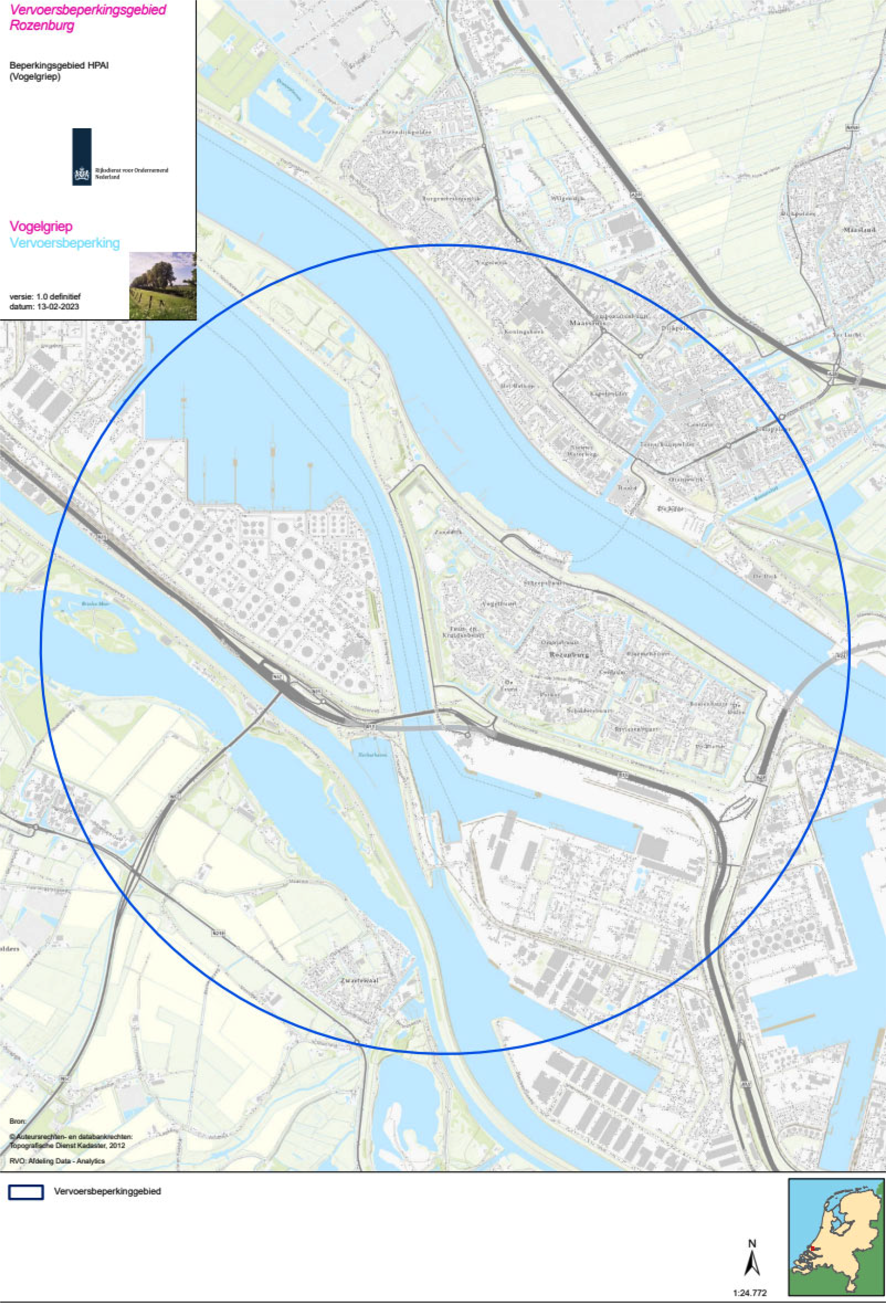 Eén van die maatregelen is het instellen van een beperkingszone die bestaat uit een beschermings- en bewakingszone rond de besmette inrichting in Rozenburg. In deze gebieden gelden diverse maatregelen. De verboden zijn in beide zones gelijk; verordening 2020/687 voorziet voor de bewakingszone in verhoudingsgewijs meer ruimte voor de bevoegde autoriteit om uitzonderingen op de verboden te verlenen in vergelijking met de beschermingszone. Dit vereist maatwerk door middel van ontheffingverlening.
