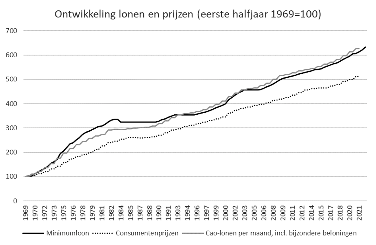 Onderstaand figuur toont de ontwikkeling van het bruto wettelijk minimumloon, de ontwikkeling van de cao-lonen per maand incl. bijzondere beloning, en de inflatie (consumentenprijsindex) sinds de invoering van het wettelijk minimumloon in 1969 als indexcijfer van de niveaus in dat jaar (eerste halfjaar 1969=100). Hieruit blijkt dat het wettelijk minimumloon in de periode tussen de invoering en 1983 meer steeg dan de cao-loonontwikkeling. In het eerste halfjaar van 1984 is het wettelijk minimumloon eenmalig verlaagd (van omgerekend € 929,70 naar € 901,98). In de perioden juli 1983-december 1989, januari 1993-december 1995 en januari 2004-december 2005 is het wettelijk minimumloon niet geïndexeerd. Indien het wettelijk minimumloon de cao-loonontwikkeling sinds 1969 een-op-een had gevolgd was het wettelijk minimumloon per juli 2021 € 35,62 bruto per maand hoger geweest, dit komt neer op 2,1%. Over de afgelopen 20 jaar (periode eerste half jaar 2002-laatste halfjaar 2021) zijn het wettelijk minimumloon, de inflatie en de cao-lonen met respectievelijk 40,8%, 37,0% en 40,9% toegenomen. Hieruit blijkt dat het wettelijk minimumloon en de cao-lonen vrijwel even hard zijn gegroeid en beiden harder dan de inflatie.