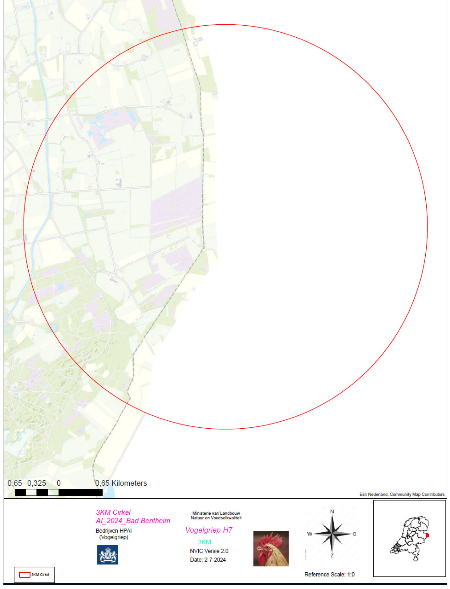 De beschermingszone en bewakingszone zijn respectievelijk het gebied met een straal van 3 en 10 kilometer rond de besmette inrichting, voor zover gelegen in Nederland. Ze zijn aan de hand van een plattegrond aangeduid in bijlagen 1 en 2. Een inzoombare, gedetailleerde kaart van die zone is beschikbaar op de website van de Rijksdienst voor Ondernemend Nederland (RVO) (https://www.rvo.nl/dierziektenviewer/).