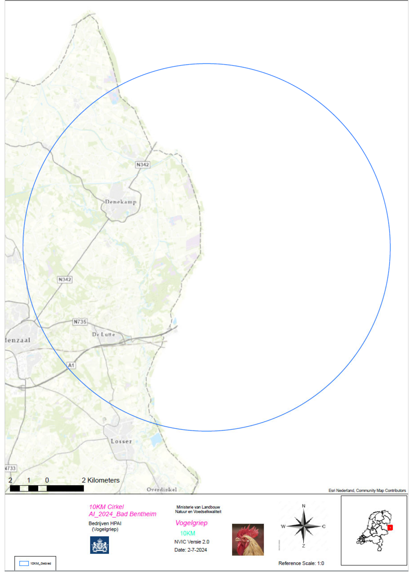 Op een inrichting in Bad Bentheim in Duitsland is een uitbraak geconstateerd van hoogpathogene aviaire influenza (HPAI), ofwel vogelgriep. HPAI is een besmettelijke dierziekte, die tot hoge sterftecijfers kan leiden bij vogels en kan worden overgedragen op mensen (een zogenoemde zoönose). Het isoleren van de gevonden besmettingshaard en het voorkomen van verdere verspreiding van de ziekte is daarom van het grootste belang.