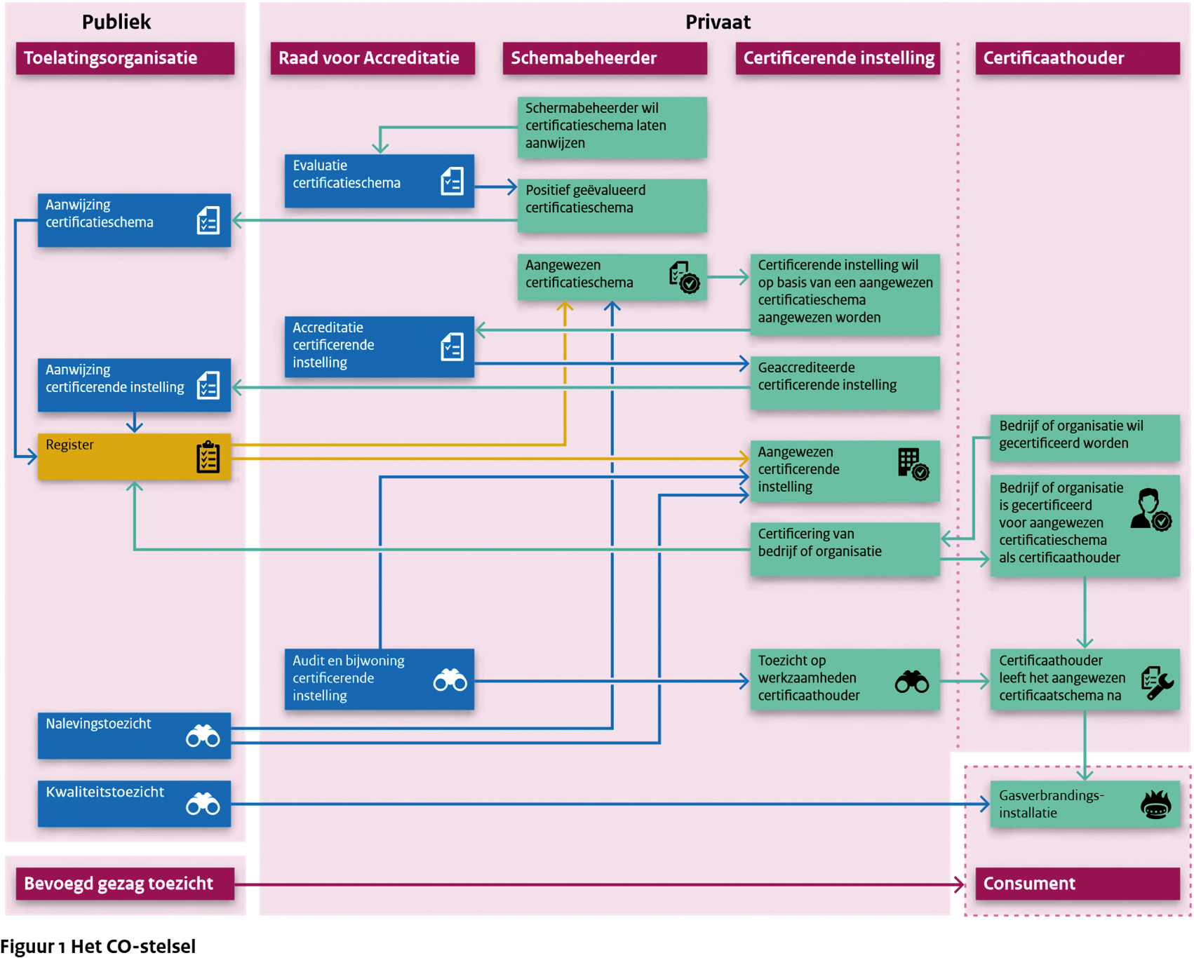 – Nalevingstoezicht bij de schemabeheerder en certificerende instelling met als doel vast te stellen dat zowel de schemabeheerder, de certificerende instelling, als de certificaathouder het aangewezen certificatieschema naleven. – Kwaliteitstoezicht op de werking van het CO-stelsel als geheel.