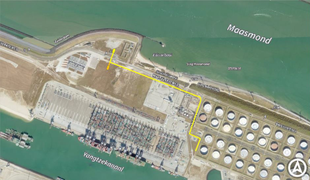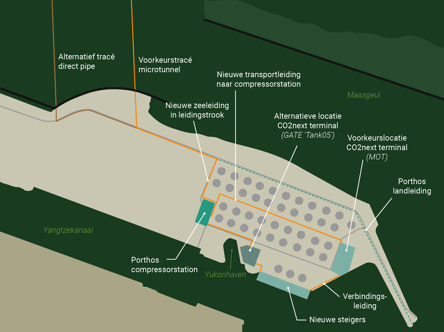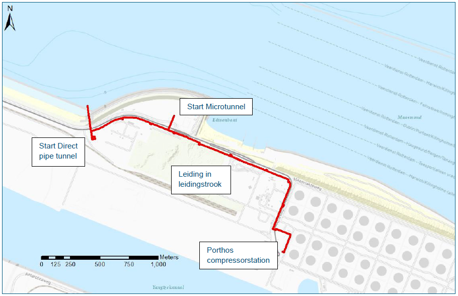 3. Ten behoeve van de realisatie en facilitatie van het transport van de CO2 vanaf het compressorstation wordt voorzien in een CO2-leiding op land met een diameter van circa 0,8 meter. Ter hoogte van de kruising met de zeewering en de Maasgeul ligt de leiding op minimaal 25 meter diepte. Ter hoogte van de kruising met de Maasgeul wordt een sleuf aangebracht waar de leiding in geplaatst wordt.