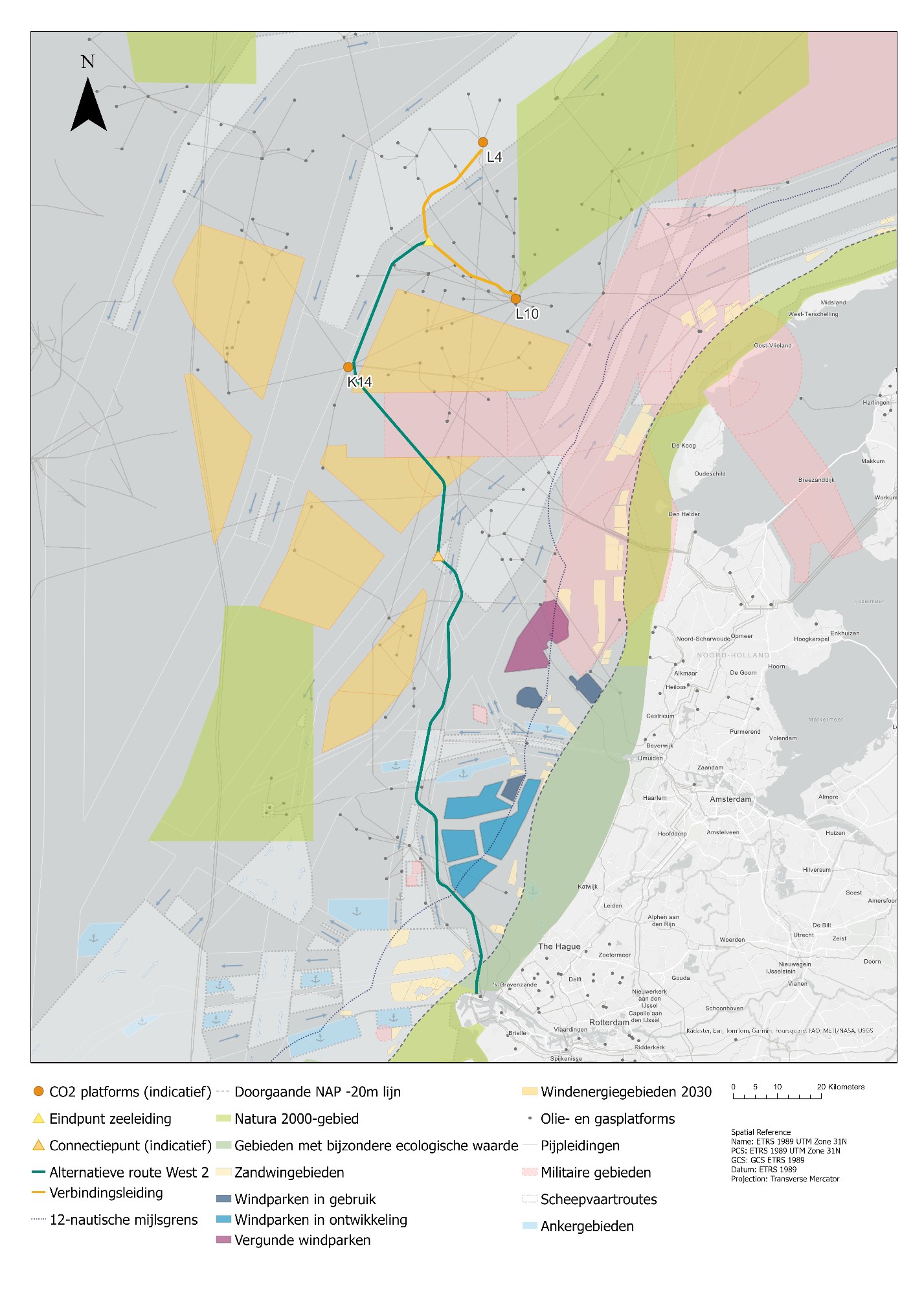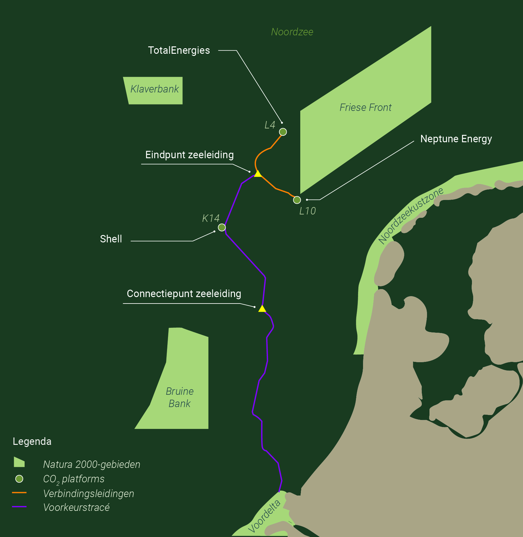 5. Ten behoeve van het transport van de CO2 naar het eindpunt op de Noordzee wordt een CO2-leiding op zee met een diameter van circa 0,8 meter aangelegd (inclusief connectiepunten en eindpunt). Het eindpunt van de zeeleiding wordt een distributiepunt waarop verschillende platforms met verbindingsleidingen kunnen aansluiten.