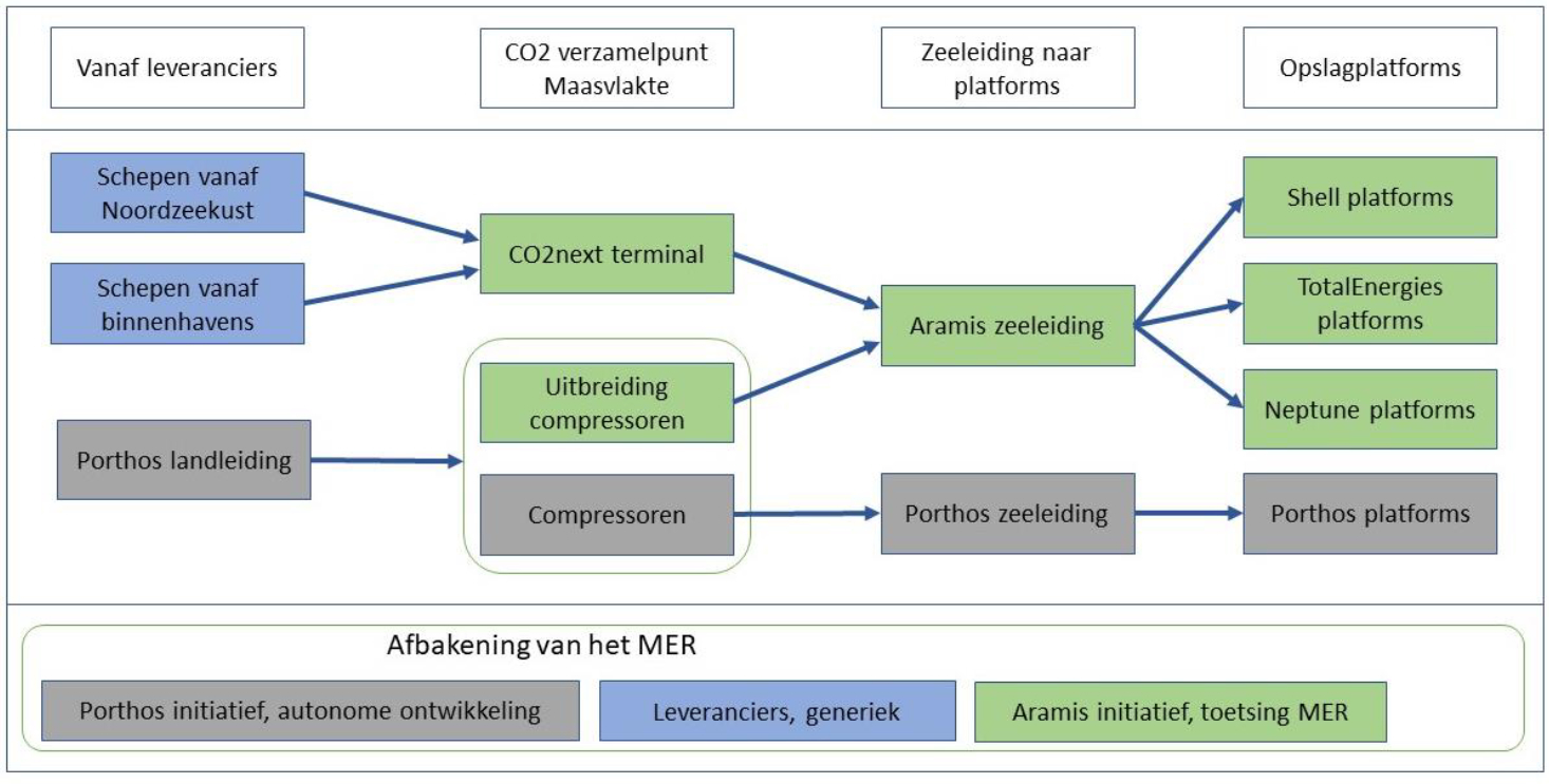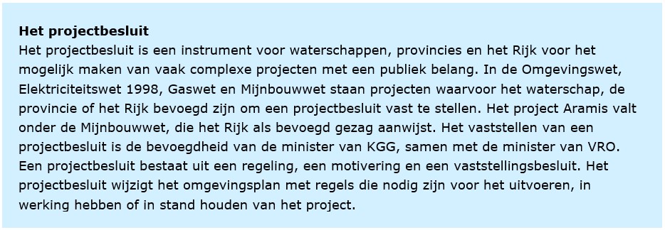 Met dit projectbesluit wordt het project Aramis mogelijk gemaakt. De Minister van Klimaat en Groene Groei (KGG) en de Minister van Volkshuisvesting en Ruimtelijke Ordening (VRO) zijn bevoegd gezag voor het projectbesluit. Daar waar in dit projectbesluit de ministers worden genoemd, worden voornoemde ministers bedoeld. Onder de naam Aramis nemen TotalEnergies, Shell, Energie Beheer Nederland (EBN) en Gasunie – in samenwerking met Neptune Energy, CCS Porthos en CO2next – het initiatief voor het aanleggen van een grootschalige open infrastructuur voor het transport van afgevangen CO2 naar leeg geproduceerde gasvelden onder de Noordzee voor opslag. Een impressie van de ligging van de infrastructuur van Aramis is opgenomen in figuur 1.1 (gedeelte op land) en in figuur 1.2 (gedeelte op zee).