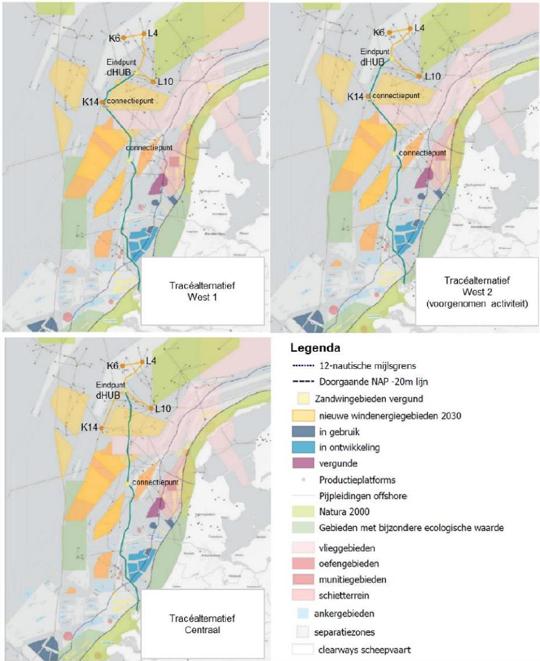 Het leidingtracé op zee is zo gekozen dat het zoveel mogelijk bestaande leidingen volgt en gevoelige gebieden en andere bestaande en toekomstige gebruiksfuncties zo min mogelijk belemmert. Om dit te bewerkstelligen, is overleg gevoerd met betrokken partijen. Onder voorwaarden kunnen mogelijk de veiligheidszones rondom bestaande olie- en gasplatforms worden gebruikt, zodat deze ruimte meervoudig gebruikt wordt. Met parallel lopende andere leidingen en kabels wordt rekening gehouden door tenminste 500 meter tot hoogspanningskabels (waaronder van TenneT) en 100 meter tot andere leidingen zoals de Porthosleiding aan te houden (volgens NEN 3656).