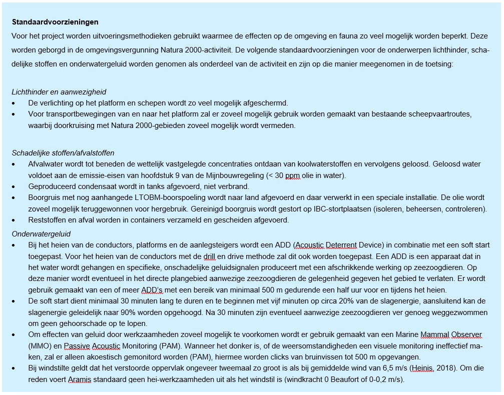 Bij het heien van de conductors, platforms en de aanlegsteigers wordt een ADD (Acoustic Deterrent Device) in combinatie met een soft start toegepast. Voor het heien van de conductors met de drill en drive methode zal dit ook worden toegepast. Een ADD is een apparaat dat in het water wordt gehangen en specifieke, onschadelijke geluidsignalen produceert met een afschrikkende werking op zeezoogdieren. Op deze manier wordt eventueel in het directe plangebied aanwezige zeezoogdieren de gelegenheid gegeven het gebied te verlaten. Er wordt gebruik gemaakt van een of meer ADD’s met een bereik van minimaal 500 m gedurende een half uur voor en tijdens het heien.