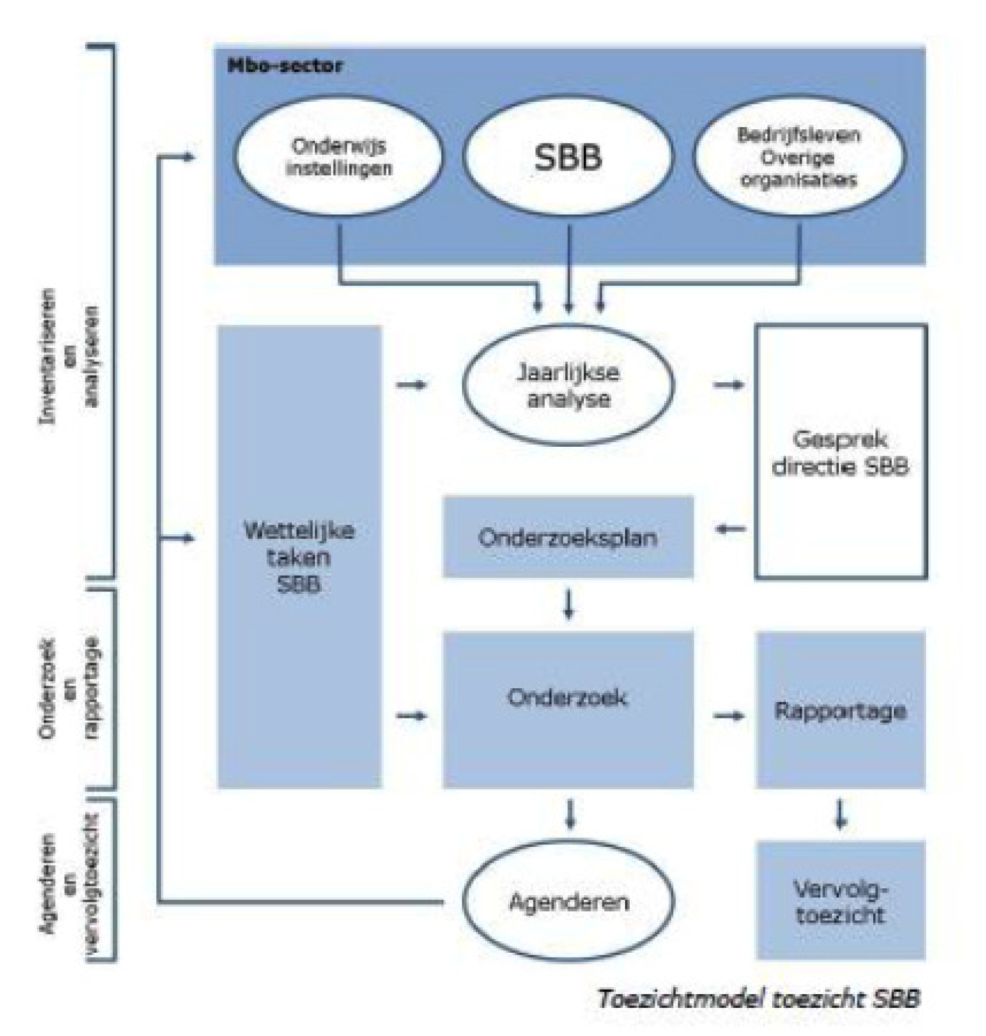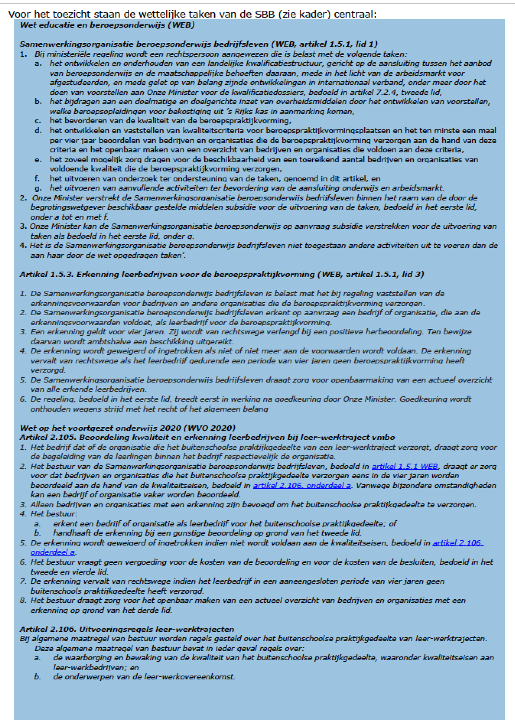 Naast het toezicht op de onderwijsinstellingen is de inspectie eveneens belast met het toezicht op SBB als bedoeld in artikel 1.5.1 van de Wet educatie en beroepsonderwijs (WEB) en in samenhang daarmee de artikelen 2.105, 2.106 en 2.107 van de Wet voortgezet onderwijs 2020 (WVO 2020). Met ingang van 1 augustus 2016 bestaat er een onderzoekskader voor het toezicht op SBB. Als hoofdlijn richt dit toezicht van de inspectie zich op de resultaten van de wettelijke taken van SBB, zoals de erkenning van leerbedrijven door SBB. Het toezicht geeft een oordeel over de kwaliteit van de uitoefening van de wettelijke taken en de borging ervan. Het toezicht is daarbij risicogericht ingericht op basis van actief en passief verkregen informatie vanuit de mbo-sector enerzijds en verantwoording door de SBB anderzijds.