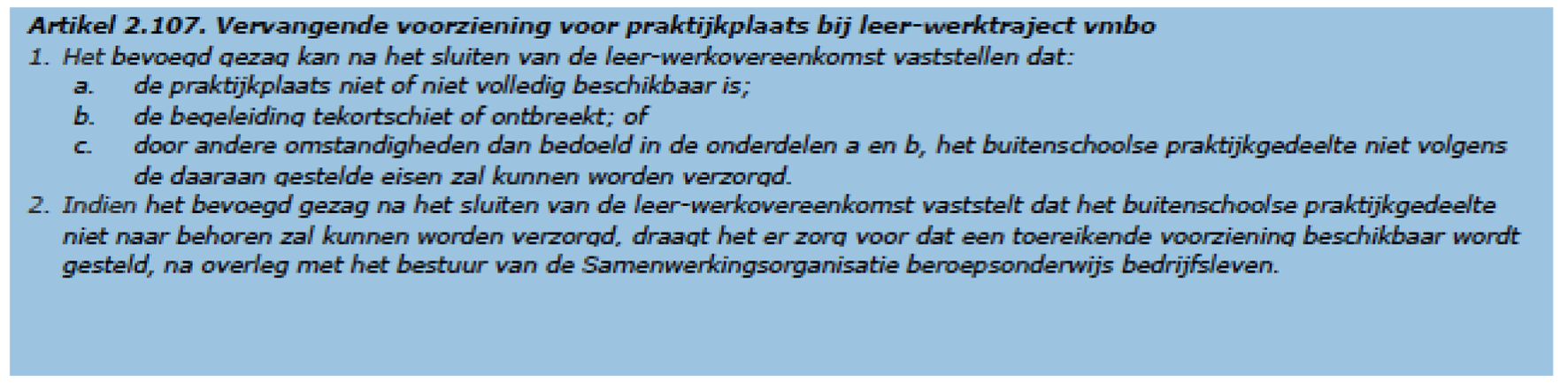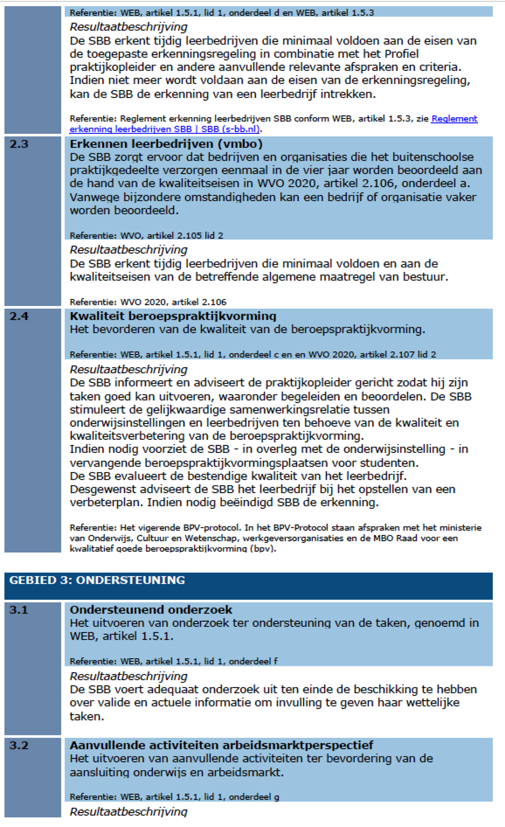 – Gebied 2: Beroepspraktijkvorming – WEB, artikel 1.5.1 lid 1, onderdeel c t/m e, artikel 1.5.3 en WVO 2020, artikel 2.105, 2.106 en 2.107