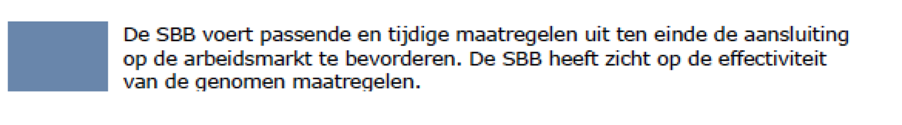 Bij onze oordeelsvorming hanteren we bovengenoemde normering. De mate waarin de praktijk de essentie en bedoeling van de standaard tentoonspreidt is bepalend voor ons oordeel. We beoordelen de naleving van de wettelijke taak altijd in relatie tot wat de standaard beoogt, zoals verwoord in de resultaatbeschrijving. Indien de SBB de wettelijke taak niet naleeft, dan kunnen we de standaard als onvoldoende beoordelen en leggen we afspraken over het vervolgtoezicht vast in het rapport. Als het niet naleven van een wettelijke taak beperkt van invloed is op het resultaat en als het punt op korte termijn kan worden hersteld, dan handhaven we het oordeel voldoende. We maken dan wel afspraken over de hersteltermijn en we leggen dit dan vast in ons rapport.