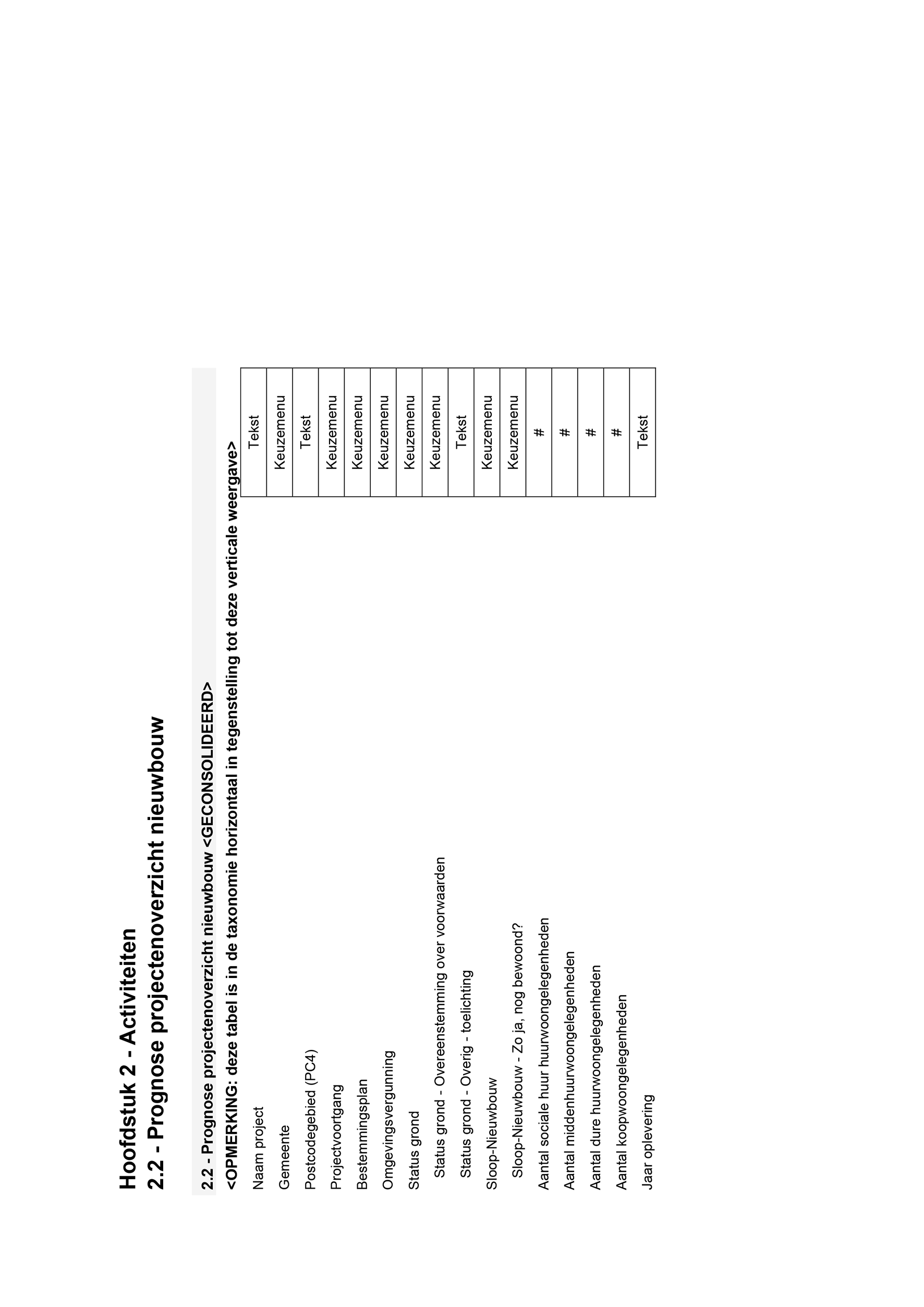In paragraaf 2.2 was in de dPi 2023 het projectenoverzicht nieuwbouw opgenomen, maar uit de datakwaliteitsanalyse blijkt dat de gevraagde statussen niet duidelijk genoeg waren: veel projecten werden hierdoor aangeduid als status ‘overig’. Daarom wordt in de dPi 2024 de vraag opgesplitst in meerdere categorieën, zodat duidelijker wordt wat de status is van een nieuwbouwproject.