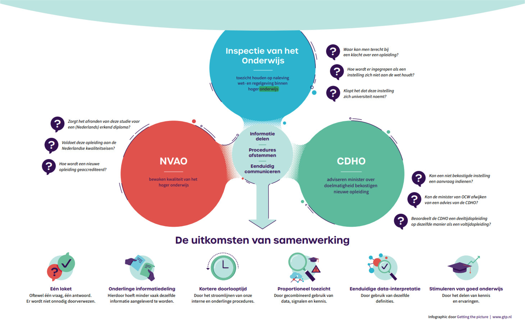 De inspectie, de NVAO en de CDHO beoordelen het hoger onderwijs elk vanuit hun eigen wettelijke rol. De inspectie ziet toe op de naleving van (onderwijs)wet- en regelgeving door aspirant- en bestaande instellingen voor hoger onderwijs en de rechtmatige en doelmatige besteding van de bekostiging en de kwaliteit van het stelsel van hoger onderwijs als geheel (inclusief het accreditatiestelsel). De NVAO accrediteert opleidingen, toetst nieuwe opleidingen en toetst de kwaliteitszorg van instellingen voor hoger onderwijs. De CDHO adviseert over de macrodoelmatigheid van het door de overheid bekostigde (nieuwe) opleidingsaanbod. Over hun bevindingen en adviezen rapporteren de inspectie, NVAO en CDHO zowel op het niveau van individuele instellingen voor hoger onderwijs als het stelsel als geheel.