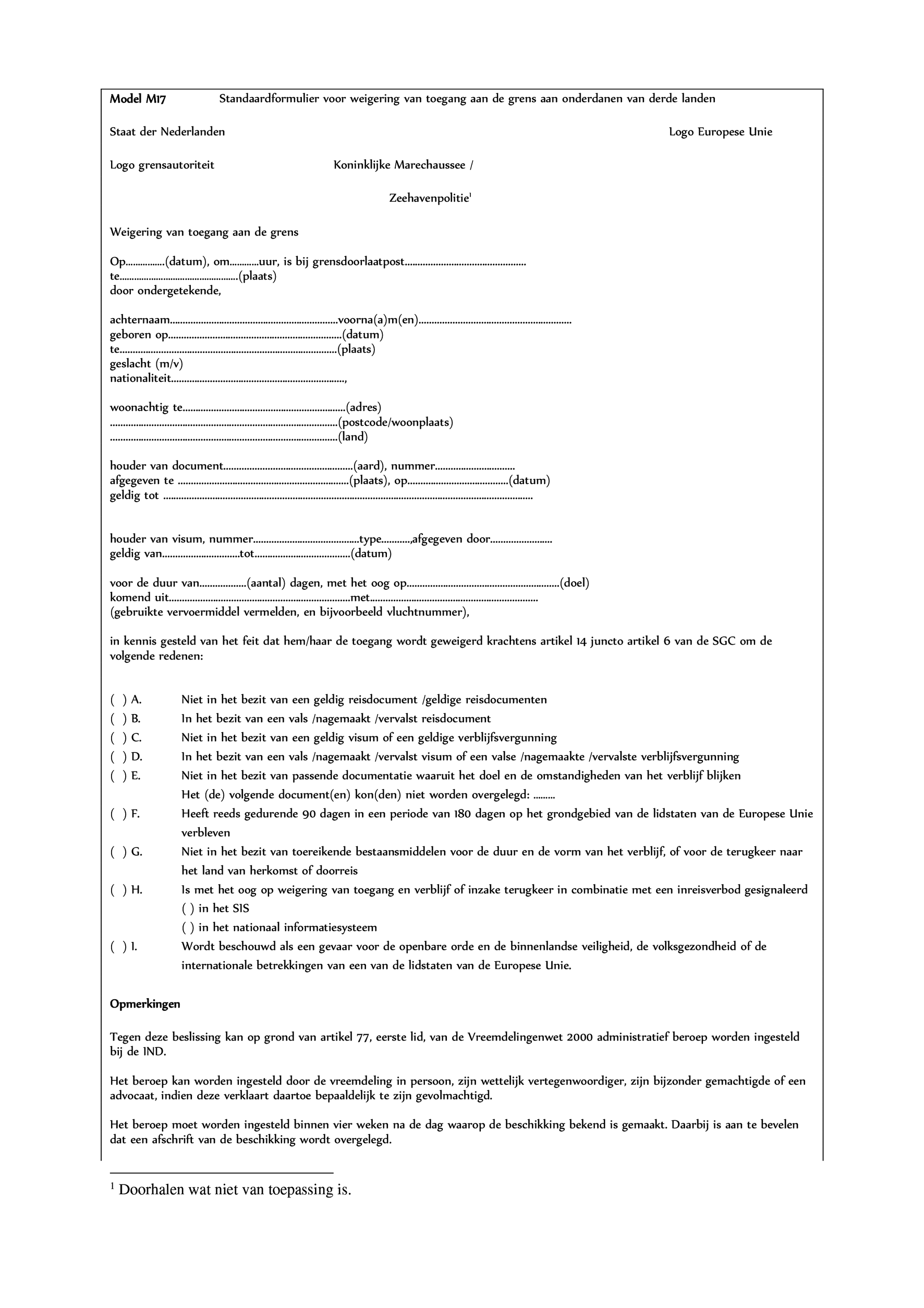 Model M17: Standaardformulier voor weigering van toegang aan de grens aan onderdanen van derde landen