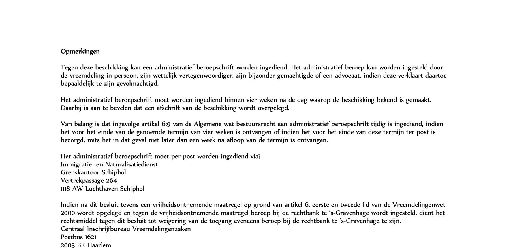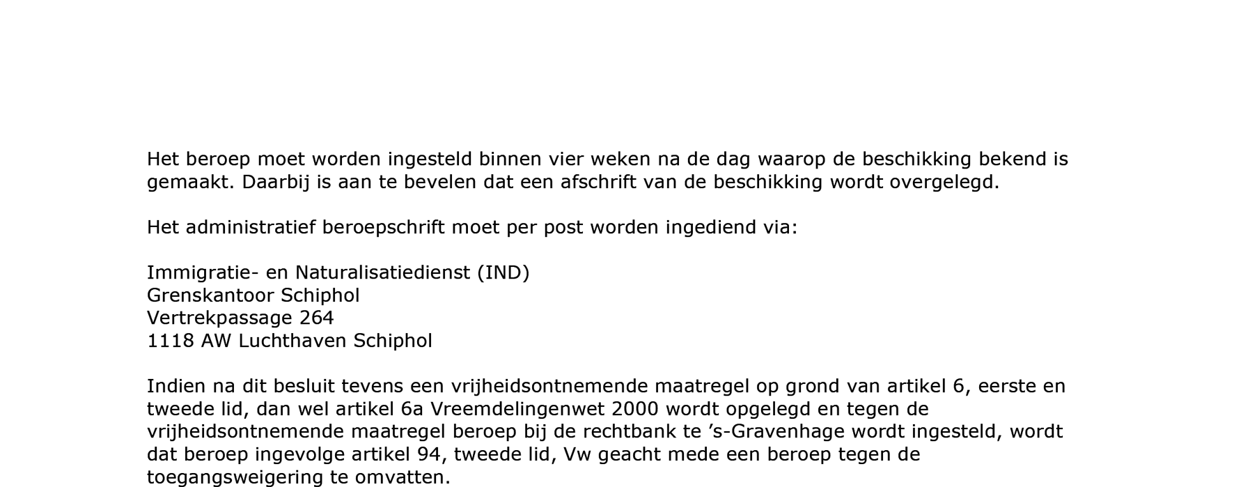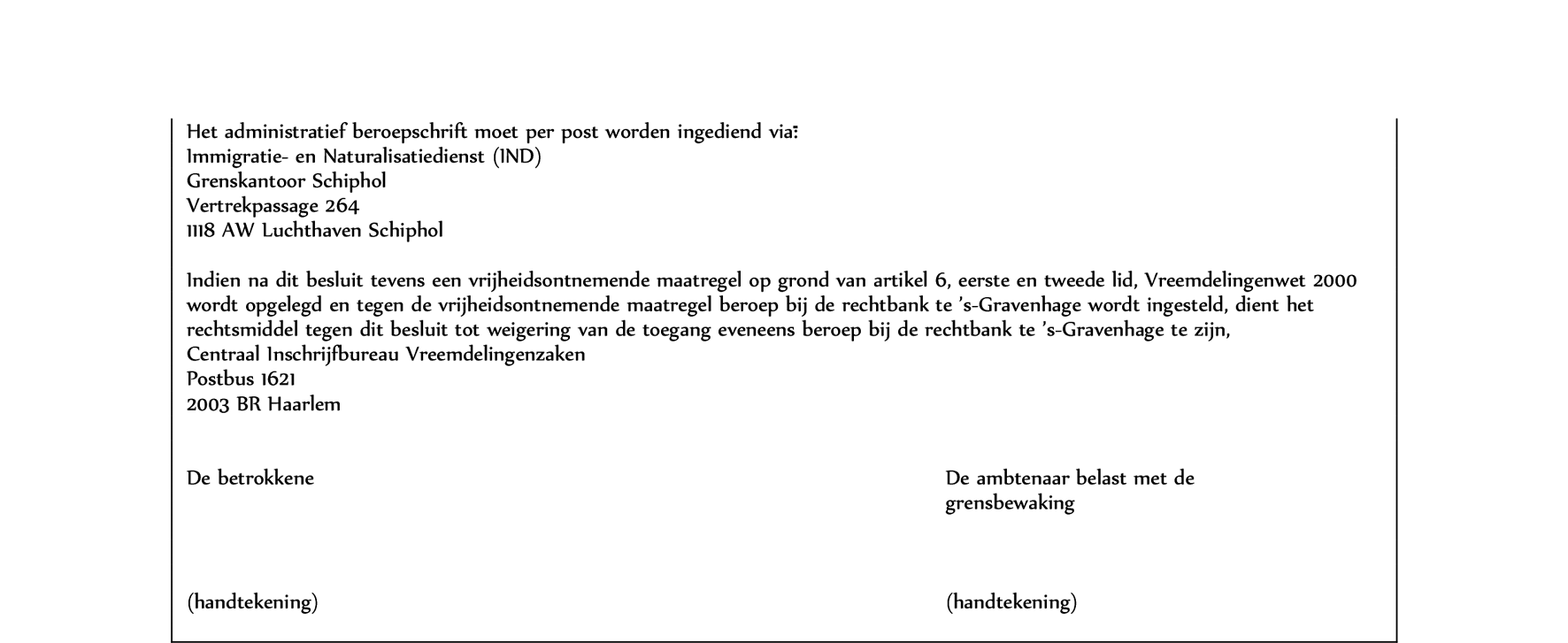 Ook zijn de modellen M17 (Standaardformulier voor weigering van toegang aan de grens aan onderdanen van derde landen), M17A (Formulier voor het weigeren van toegang aan de grens aan onderdanen van derde landen na afhandeling van de asielaanvraag in de grensprocedure) en M18 (Beschikking weigering toegang personen die vallen onder het EU-recht inzake vrij verkeer (artikel 8.8 of 8.5 Vreemdelingenbesluit 2000) aangepast. Voor het indienen van het administratief beroepschrift door de vreemdeling en/of zijn gemachtigde wordt binnen voornoemde modellen voortaan enkel verwezen naar de postadresgegevens van de IND.