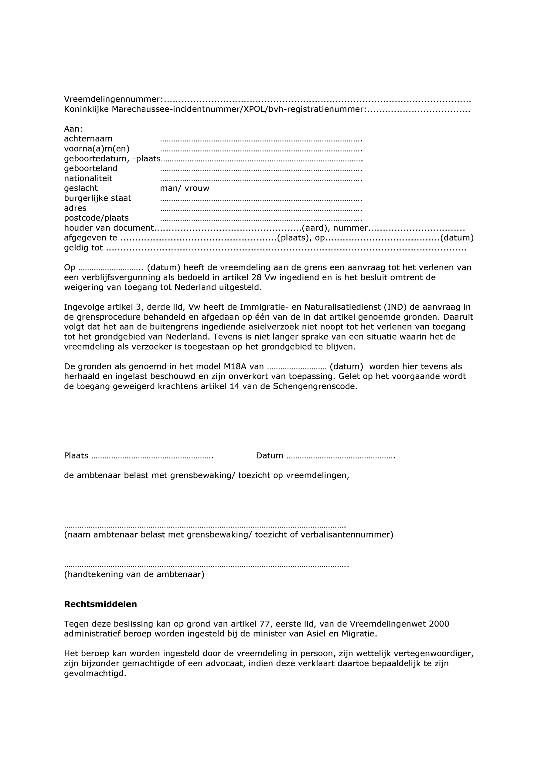 Model M17A: Formulier voor het weigeren van toegang aan de grens aan onderdanen van derde landen na afhandeling van de asielaanvraag in de grensprocedure