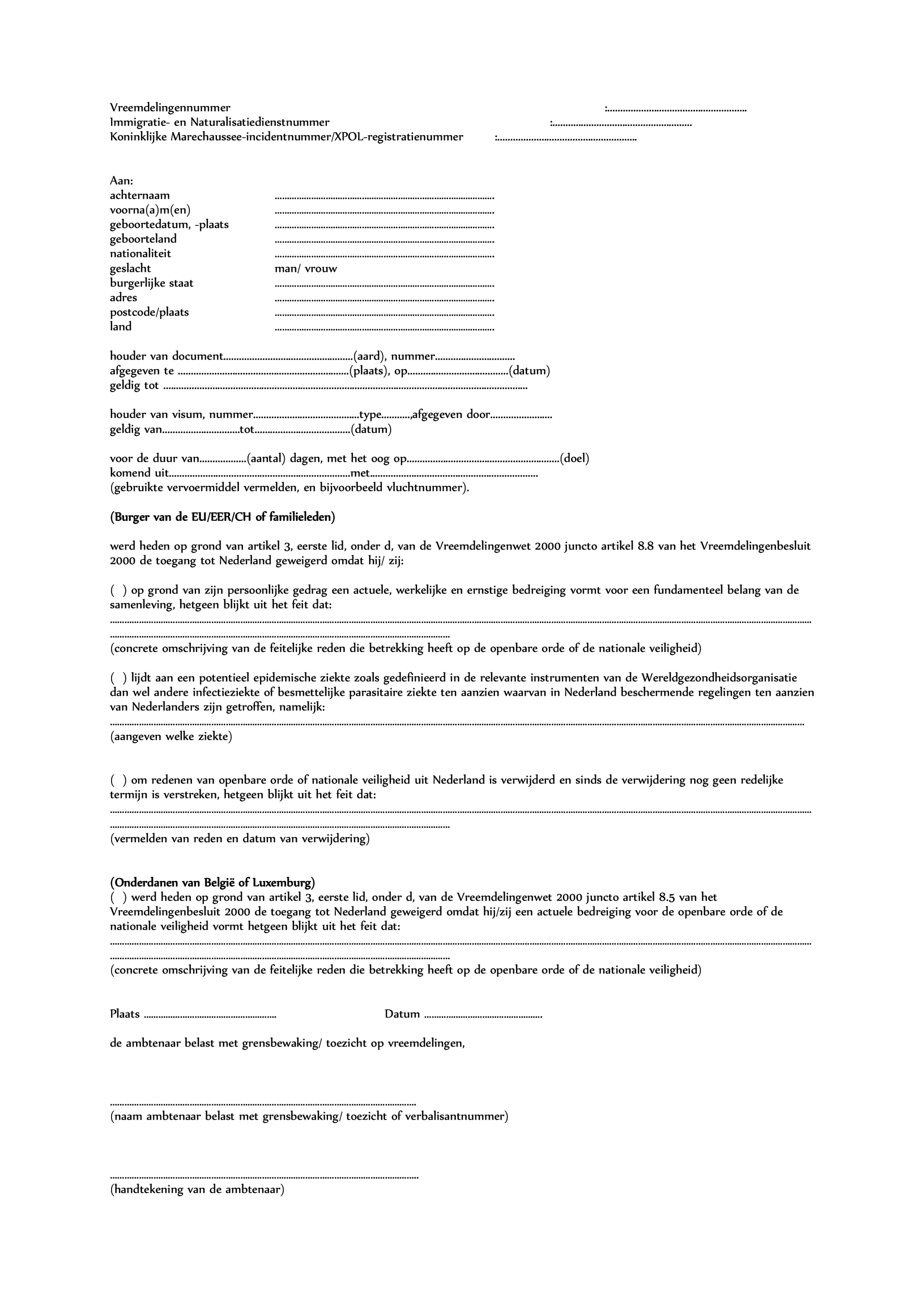 Model M18: Beschikking weigering toegang personen die vallen onder het EU-recht inzake vrij verkeer (artikel 8.8 of 8.5 Vreemdelingenbesluit 2000)