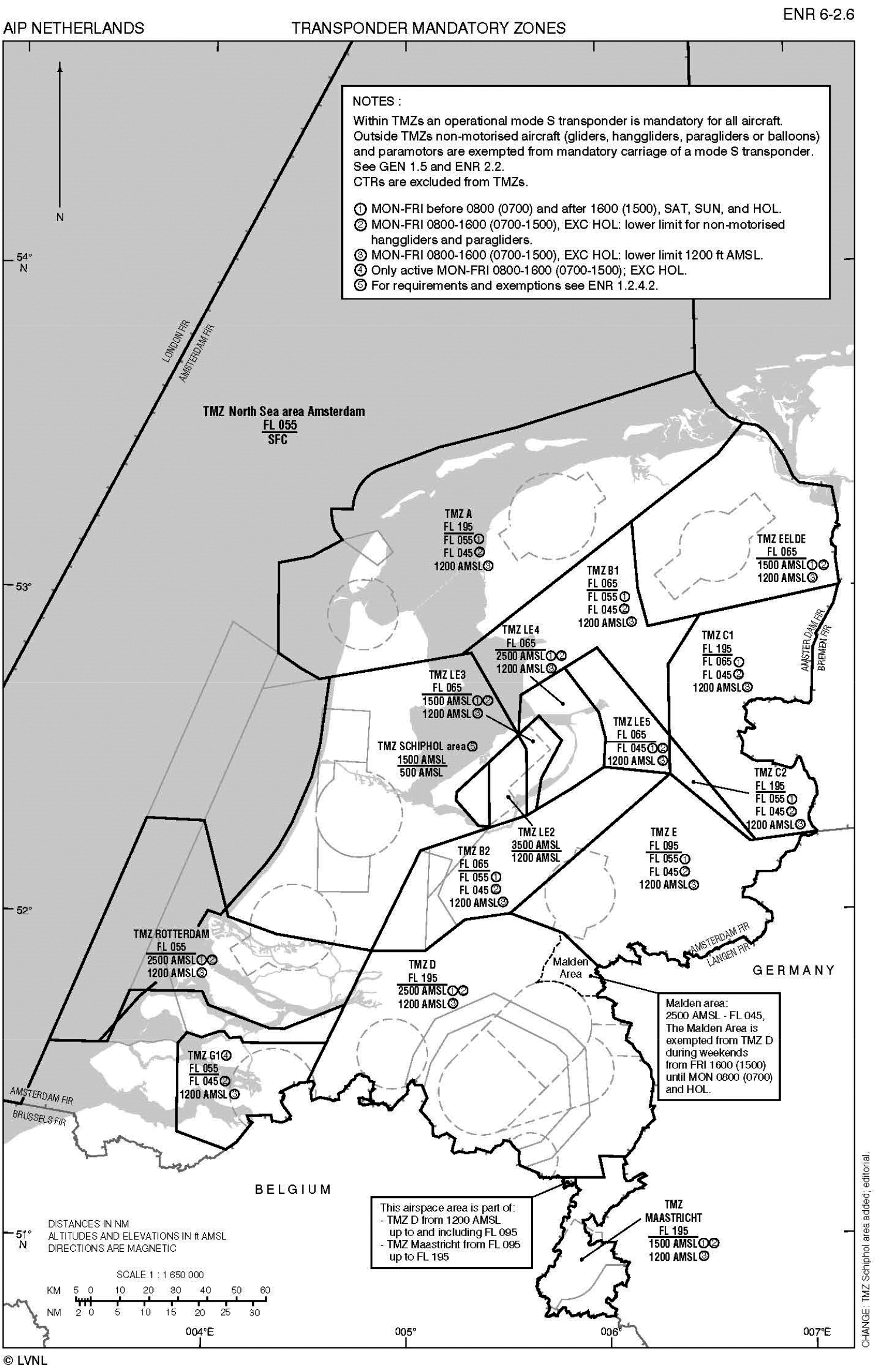 De kaart wordt ook op twee punten gecorrigeerd zodat deze aansluit bij de tabel onder de kaart. Ten aanzien van de TMZ Lelystad 5 wordt de ondergrens aangepast van 2500/1200 AMSL (above mean sea level) naar FL045/1200 AMSL. Voor de TMZ Rotterdam wordt de ondergrens gecorrigeerd van 1500/1200 AMSL naar 2500/1200 AMSL.
