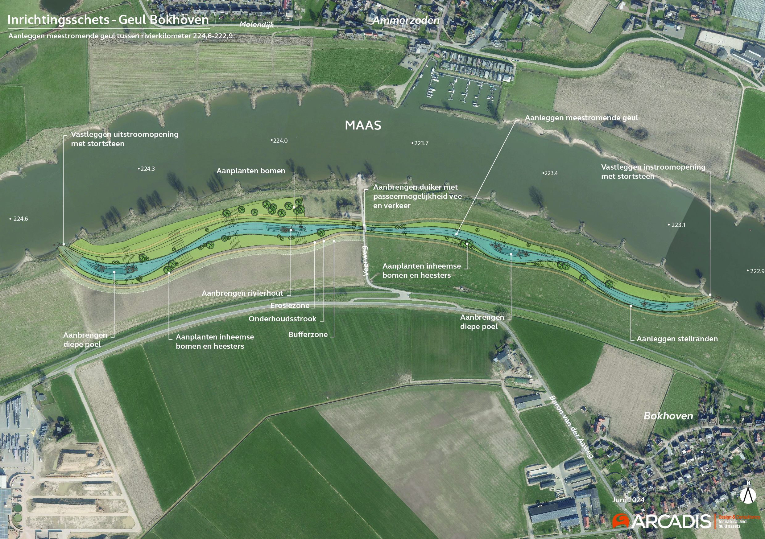 De maatregel Geul Bokhoven bestaat hoofdzakelijk uit de realisatie van een nieuwe meestromende nevengeul van 1,60 kilometer lengte tussen rkm 222,8 en rkm 224,6 in de Bokhovense Uiterwaard.