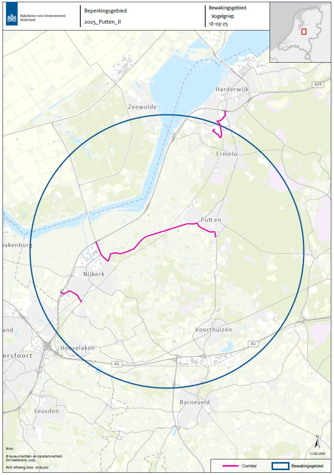 Eén van die maatregelen is het instellen van een beperkingszone die bestaat uit een beschermings- en bewakingszone rond de besmette inrichting in Putten. In deze gebieden gelden diverse maatregelen. De verboden zijn in beide zones gelijk; verordening 2020/687 voorziet voor de bewakingszone in verhoudingsgewijs meer ruimte voor de bevoegde autoriteit om uitzonderingen op de verboden te verlenen in vergelijking met de beschermingszone. Dit vereist maatwerk door middel van ontheffingverlening.