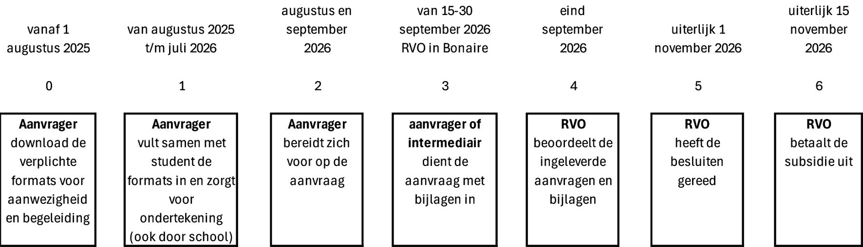 De regeling treedt in werking op 01-09-2025. Dit betekent dat de subsidie beschikbaar is vanaf het studiejaar 2025–2026. De tijdlijn in figuur 1 geeft de zes stappen die door de werkgever moeten worden doorlopen bij het indienen van een aanvraag weer. De aanvraag vindt schriftelijk plaats. Op de websites van de RVO kunnen werkgevers in Caribisch Nederland uitgebreide informatie over de regeling en de aanvraagprocedure in Caribisch Nederland vinden. De websites van Raad Onderwijs Arbeidsmarkt Caribisch Nederland (ROA) en de Rijksdienst Caribisch Nederland worden gebruikt om de regeling bij werkgevers onder de aandacht te brengen en zullen voor verdere informatie verwijzen naar RVO.