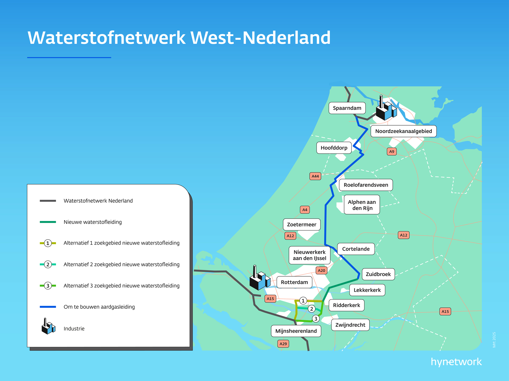 Het project Waterstofnetwerk West-Nederland gaat over de realisatie van een ondergrondse waterstofleiding tussen de industriële regio’s Noordzeekanaalgebied en Rotterdam. De leiding loopt van Spaarndam in Noord-Holland naar Mijnsheerenland in Zuid-Holland. Voor de leiding wordt deels gebruik gemaakt van een bestaande aardgasleiding die geschikt gemaakt wordt voor waterstof. Waar dat niet kan, wordt een nieuwe leiding aangelegd. De verwachting is dat de aanleg van de waterstofleiding in West-Nederland tussen 2029 en 2031 plaatsvindt.