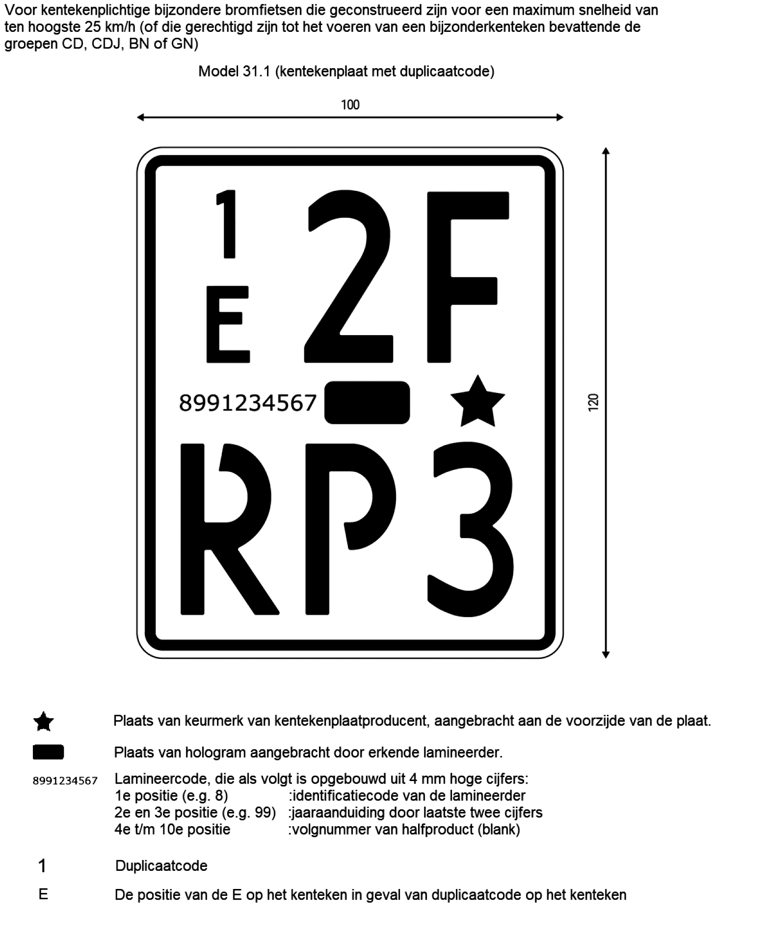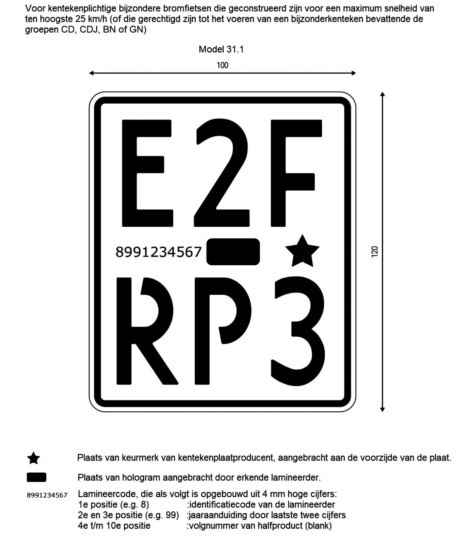 De RDW geeft voor aangewezen bijzondere bromfietsen telkens een kenteken af dat de vaste beginletter ‘E’ heeft. Ook dat is zonder aanpassing mogelijk op basis van artikel 3 van de Regeling kentekens en kentekenplaten.