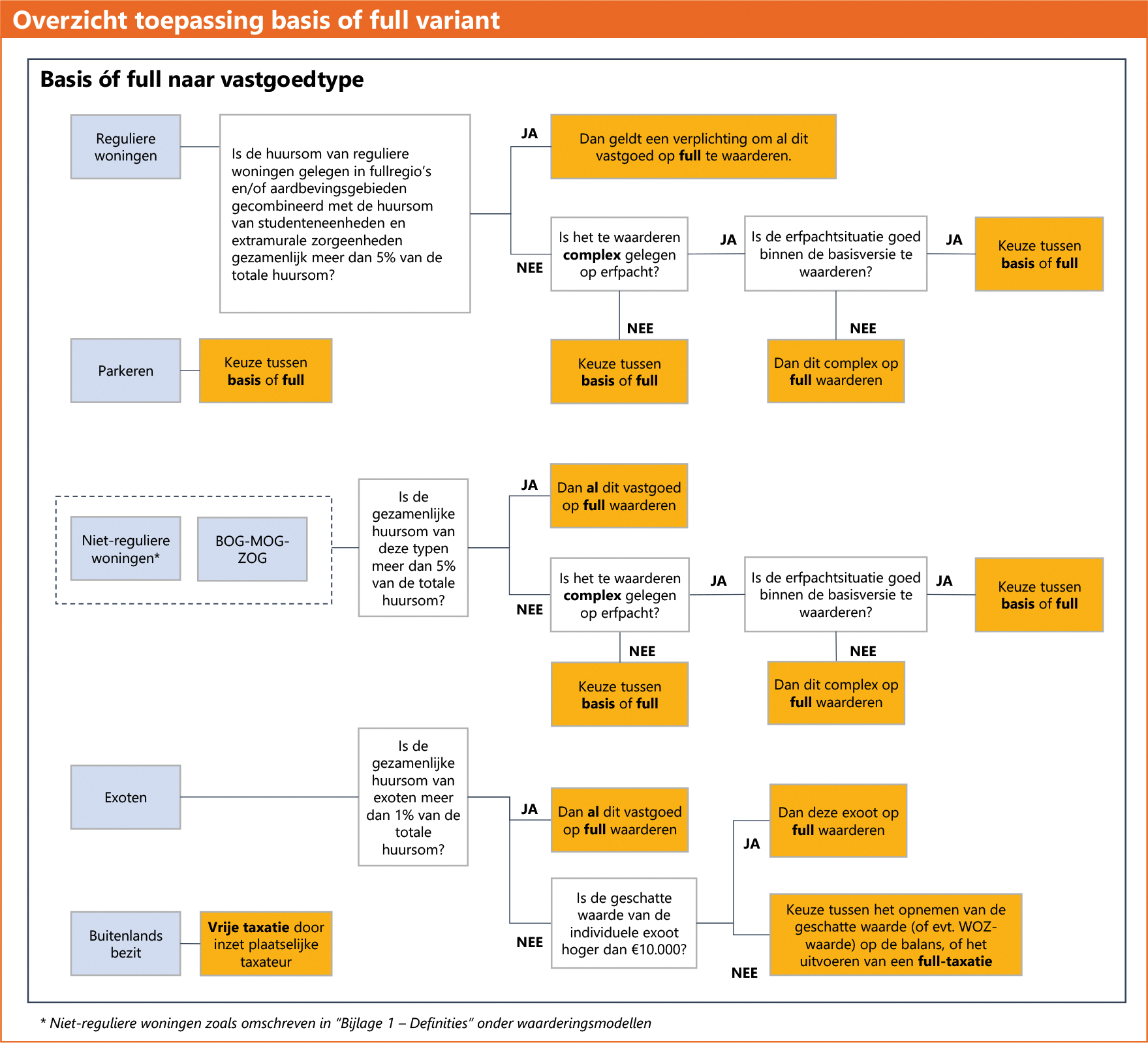 Let op: het is in alle gevallen mogelijk om een taxatie in de full-variant te maken, ook als er geen directe verplichting is. U kunt daarbij de keuze maken om een aantal complexen, deelportefeuille(s) of vastgoedtype(s) op full te waarderen.