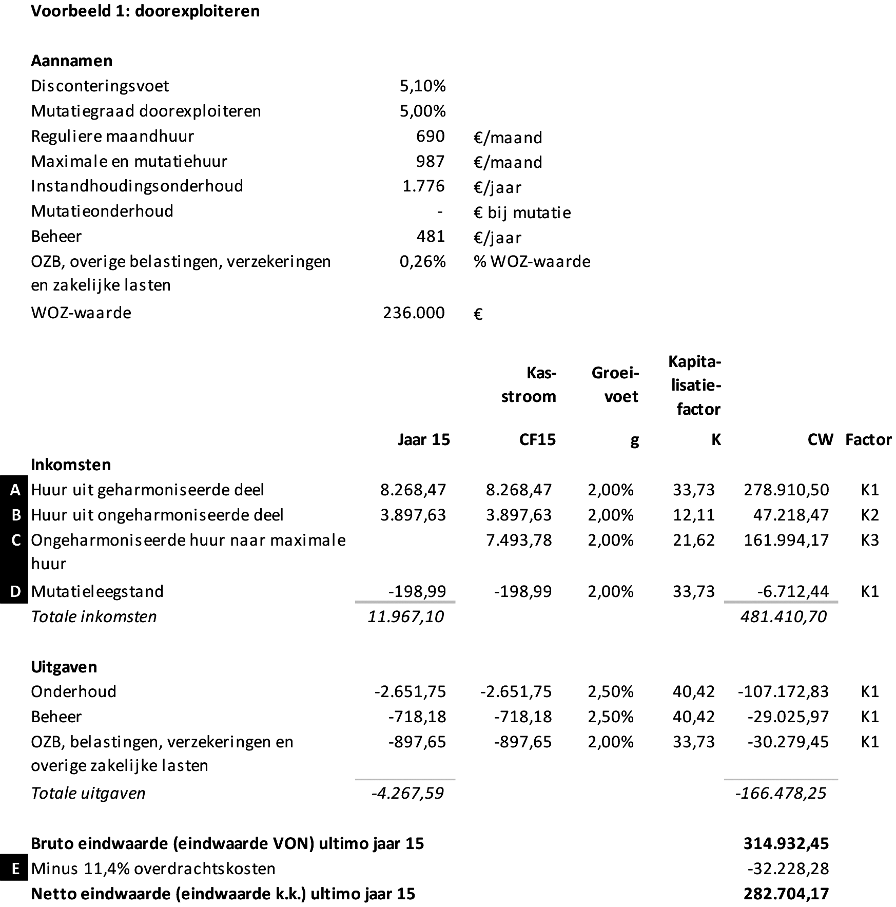 Voor alle overige posten geldt dat deze niet afnemen als gevolg van harmonisatie. De woningen blijven immers in exploitatie. Voor al deze posten is daarmee de kapitalisatiefactor K1 van toepassing toegepast op de kasstroom medio jaar 15 en met een kapitalisatiefactor die mogelijk verschilt als gevolg van de groeifactor g.