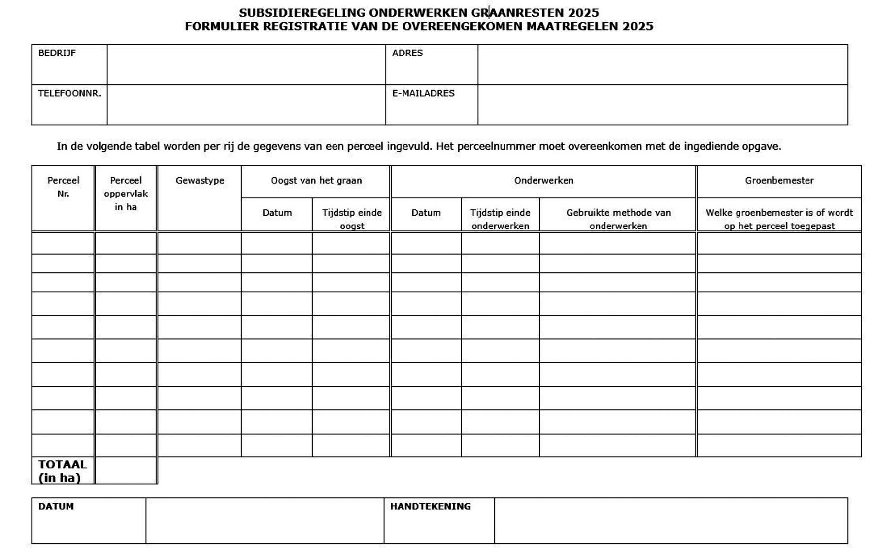 1. Een eigenaar of pachter die zijn percelen heeft ondergewerkt, zendt uiterlijk drie weken na de afronding van het onderwerken een volledig ingevuld en ondertekend registratieformulier naar het e-mailadres graanregeling@trifolium-bv.nl.