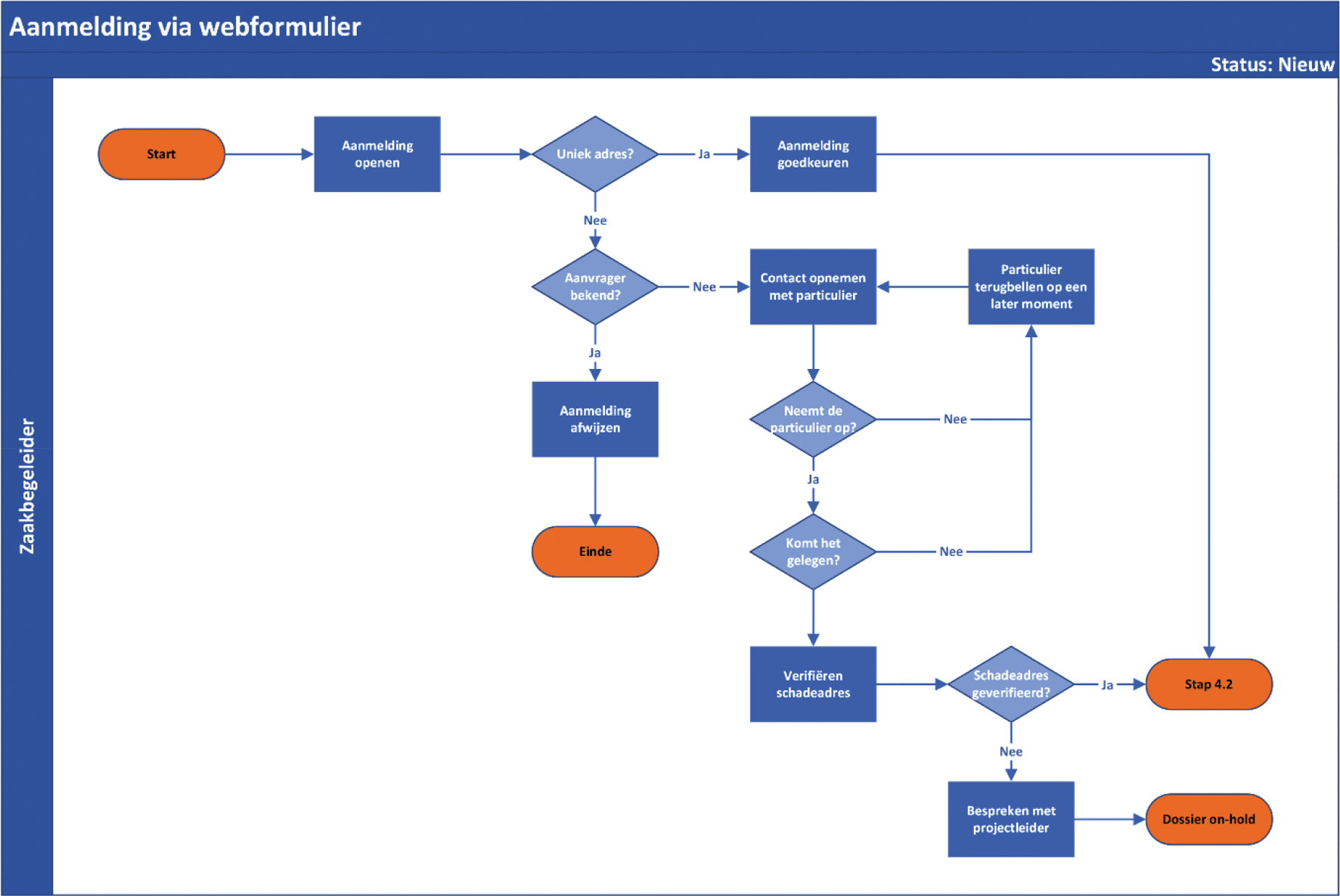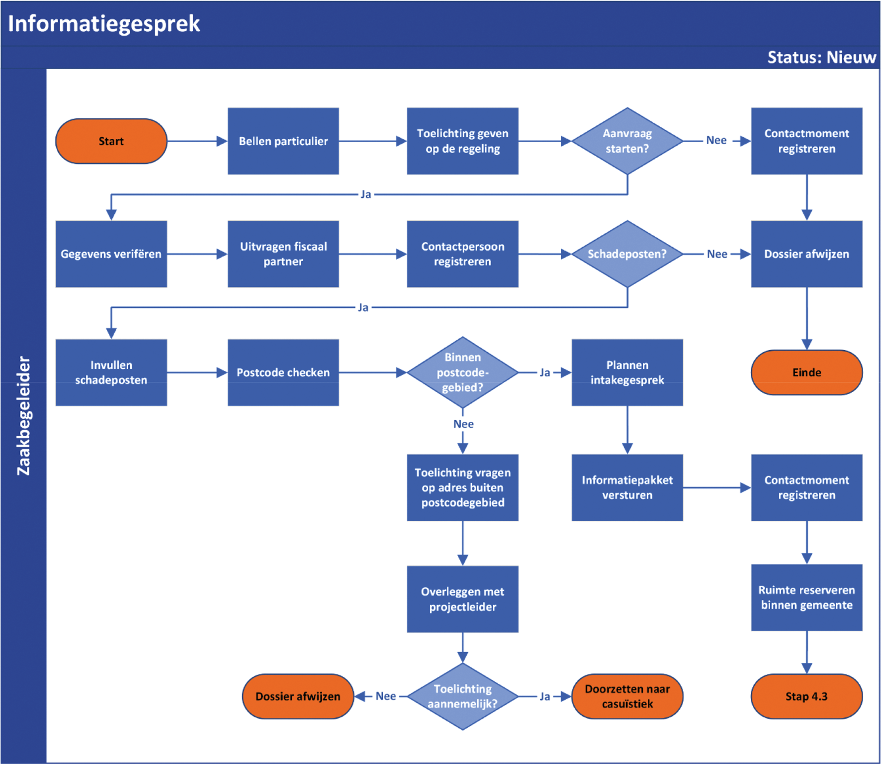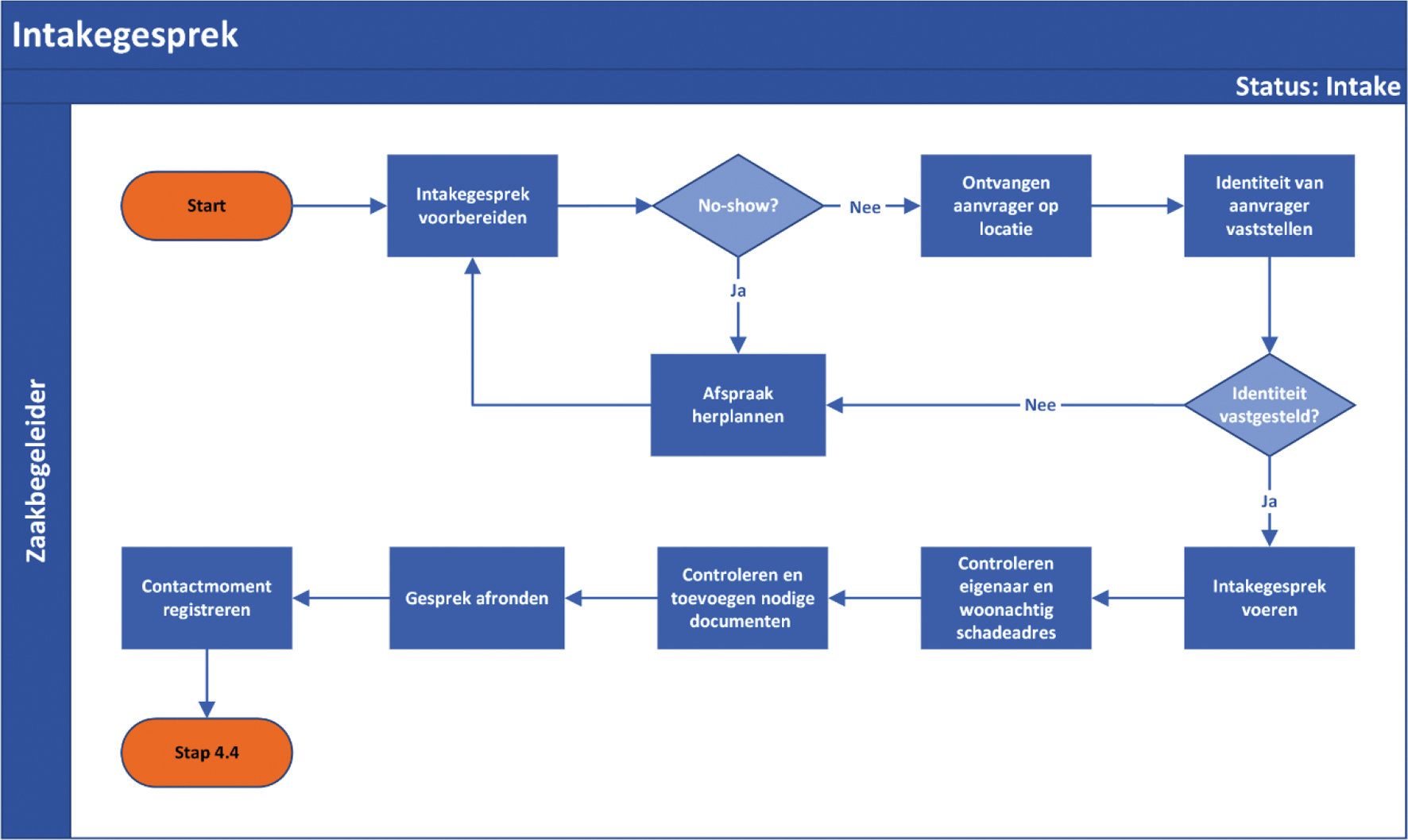 De fysieke afspraak op een van de gemeentehuizen in de regio tussen de zaakbegeleider en de aanvrager. Vind het intakegesprek, om wat voor reden dan ook, online of telefonisch plaats, selecteer dan ook deze optie. Dit is van belang voor de verzending van het juiste emailbericht en voor managementinformatie. Zie paragraaf 4.2 Intakemoment (fysiek) |