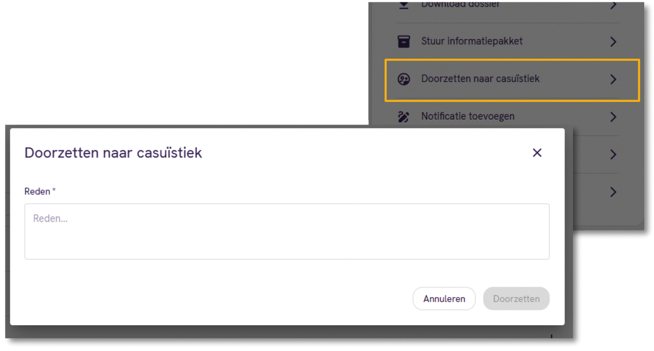 Vervolgens kan het dossier aangemeld worden voor casuïstiek, via de actieknop links in het menu. Er verschijnt een pop up waarin beknopt de reden in wordt gevuld waarom het dossiers wordt ingediend. Op dat moment is het dossier direct beschikbaar in het systeem voor de casuïstiektafel.