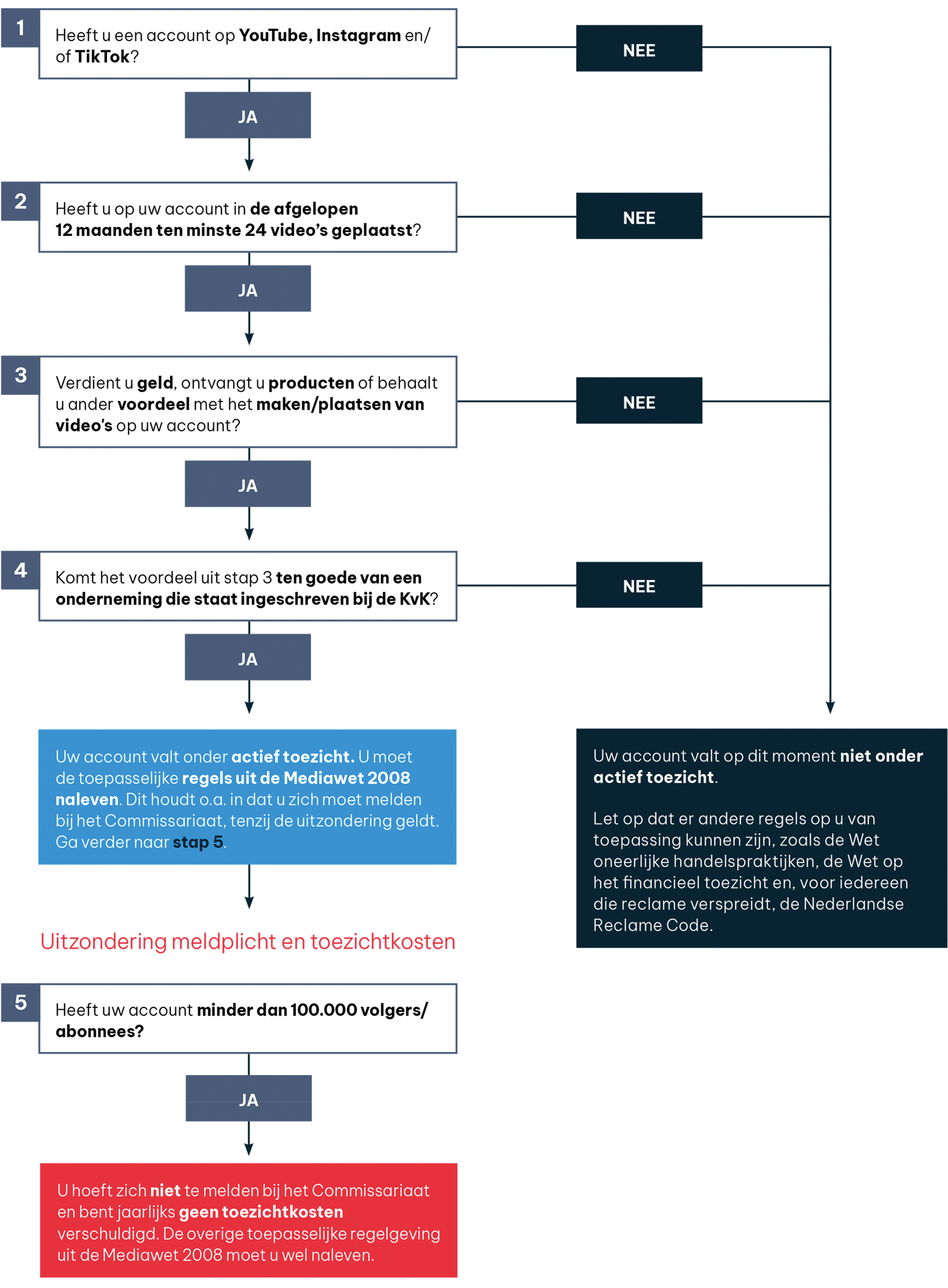 Ten derde, na het positief doorlopen van de stappen 1 tot en met 4 komt de video-uploader toe aan stap 5. Dit onderdeel van de beslisboom zondert de meldplicht en de verplichting tot het jaarlijks betalen van toezichtkosten uit voor video-uploaders met minder dan 100.000 volgers of abonnees op hun account. Als hiervan sprake is hoeft de video-uploader zich niet te melden en worden er geen toezichtkosten in rekening gebracht. Indien een video-uploader met zijn account onder actief toezicht valt en hij hierop minimaal 100.000 volgers of abonnees heeft, moet hij zich wél melden bij het Commissariaat en is hij jaarlijks toezichtkosten verschuldigd. Op de naleving van deze verplichtingen ziet het Commissariaat ook toe. Dit betekent dat als de video-uploader hier niet aan voldoet, het Commissariaat hier handhavend tegen kan optreden.
