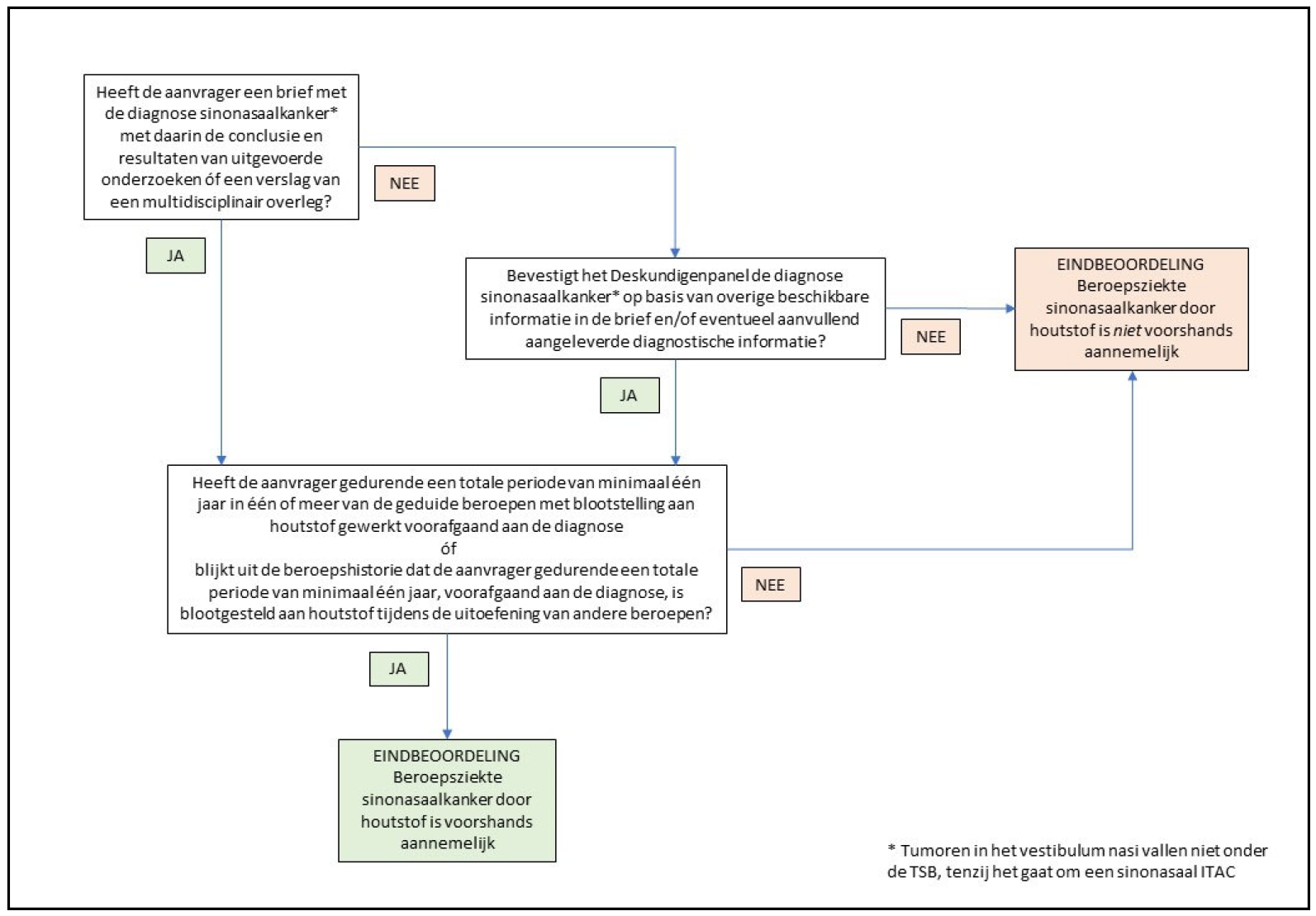 Het Deskundigenpanel beoordeelt in het kader van de TSB het voorshands aannemelijk is dat sprake is van sinonasaalkanker door houtstof. Het oordeel van het Deskundigenpanel is gebaseerd op de diagnose van de ziekte in combinatie met beroepsmatige blootstelling aan houtstof gedurende een totale periode van minimaal één jaar voorafgaand aan de diagnose. In dit hoofdstuk wordt het afwegingskader gegeven om tot deze eindbeoordeling te komen.
