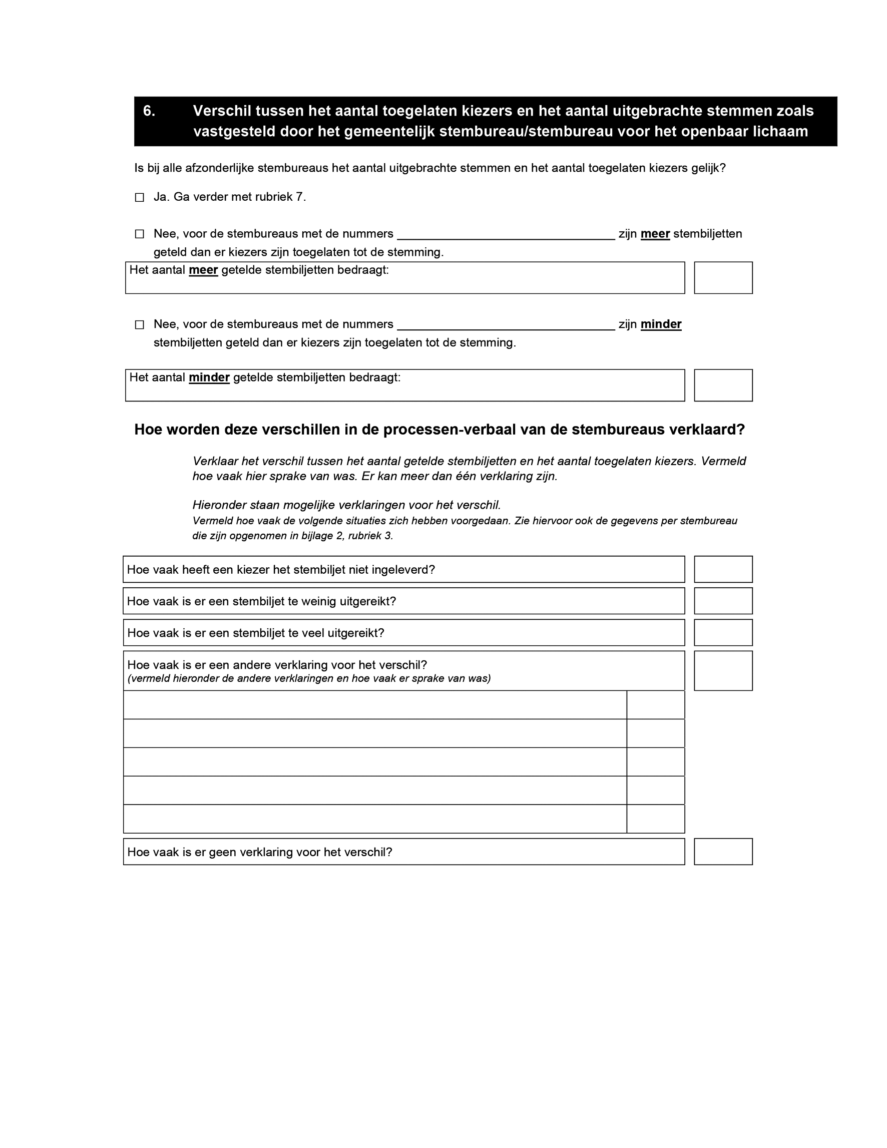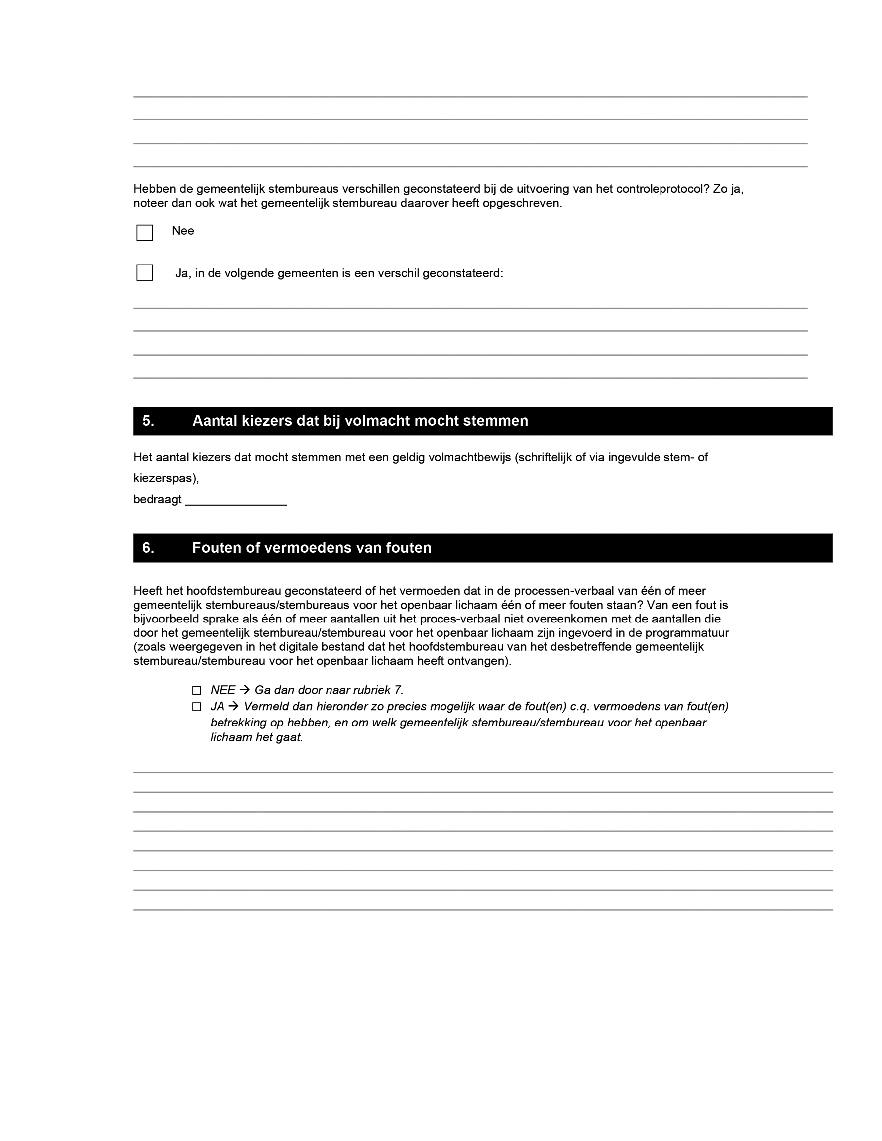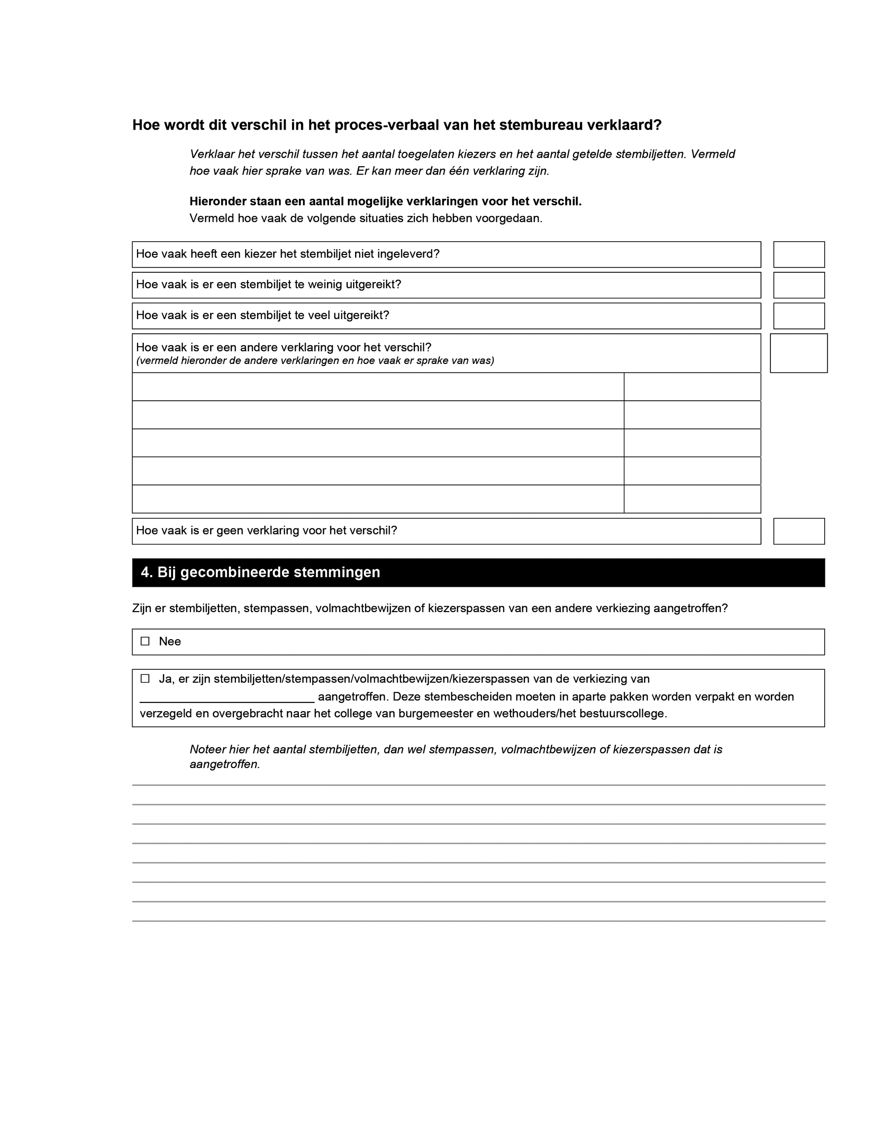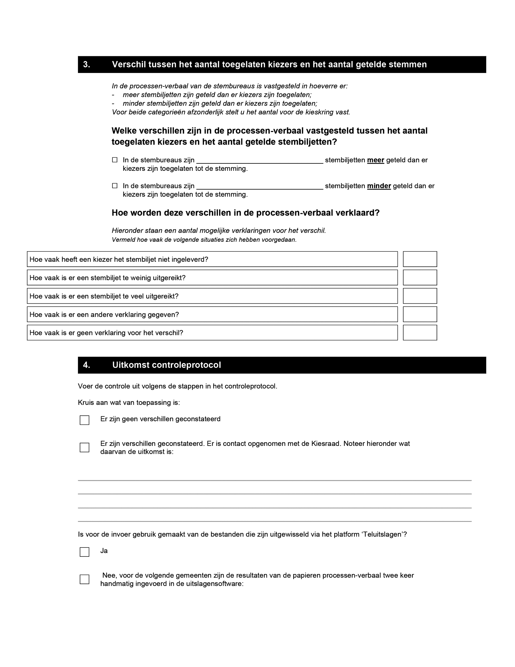 Bij het model voor het hoofdstembureau is bij rubriek 4 het vak voor de uitkomst van de controle toegevoegd. Er moet hier worden aangekruist of er wel of geen verschillen zijn geconstateerd na het uitvoeren van de controle. Indien er verschillen zijn geconstateerd moet er contact worden opgenomen met de Kiesraad. De uitkomst van het contact met de Kiesraad moet worden genoteerd op het proces-verbaal. Hierna moet worden aangekruist of er voor de invoer van de uitslagen van de gemeentelijk stembureaus gebruik is gemaakt van bestanden die zijn uitgewisseld via het platform ‘Teluitslagen’. Indien hier geen gebruik van is gemaakt moet worden genoteerd voor welke gemeenten de resultaten van de papieren processen-verbaal twee keer handmatig zijn ingevoerd in de uitslagensoftware. Vervolgens moet worden genoteerd of gemeentelijk stembureaus verschillen hebben geconstateerd bij de uitvoering van de controle, in welke gemeenten dit geconstateerd is en wat de gemeentelijk stembureaus hierover hebben opgeschreven.