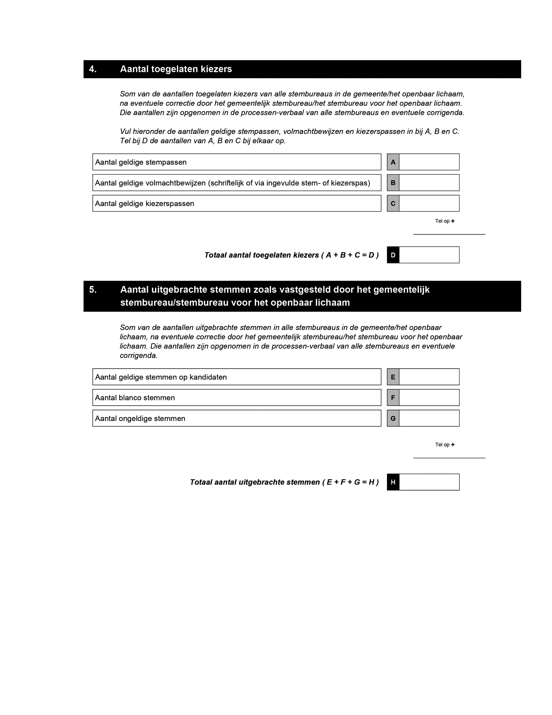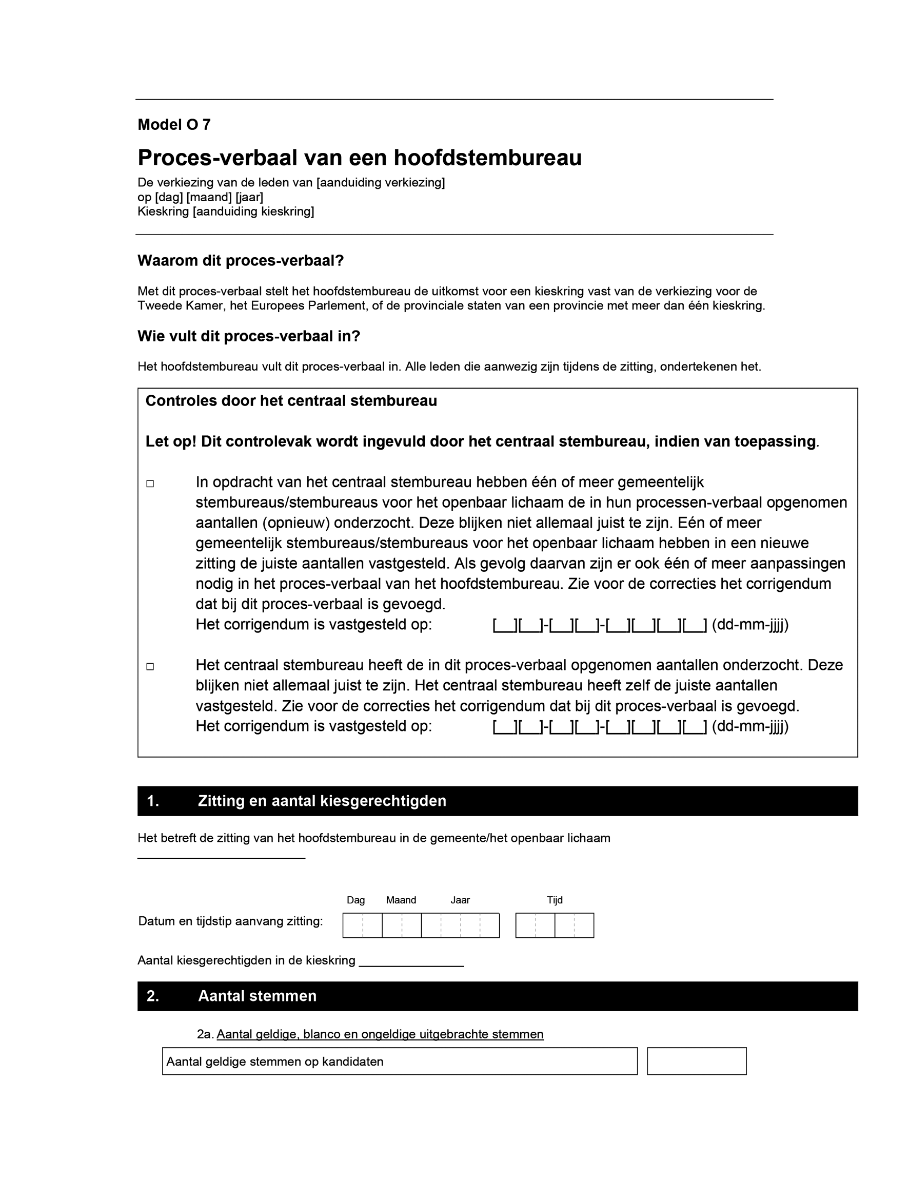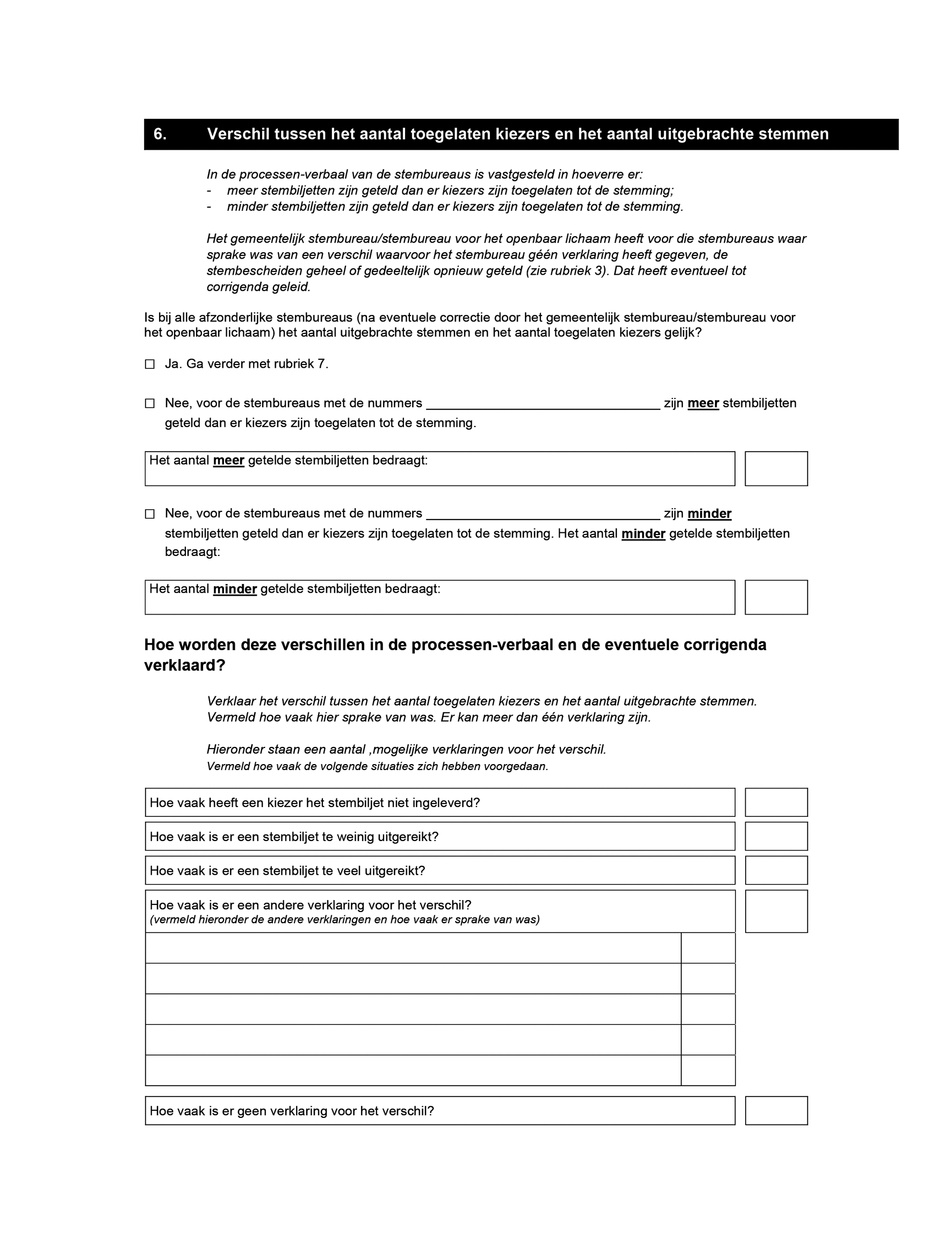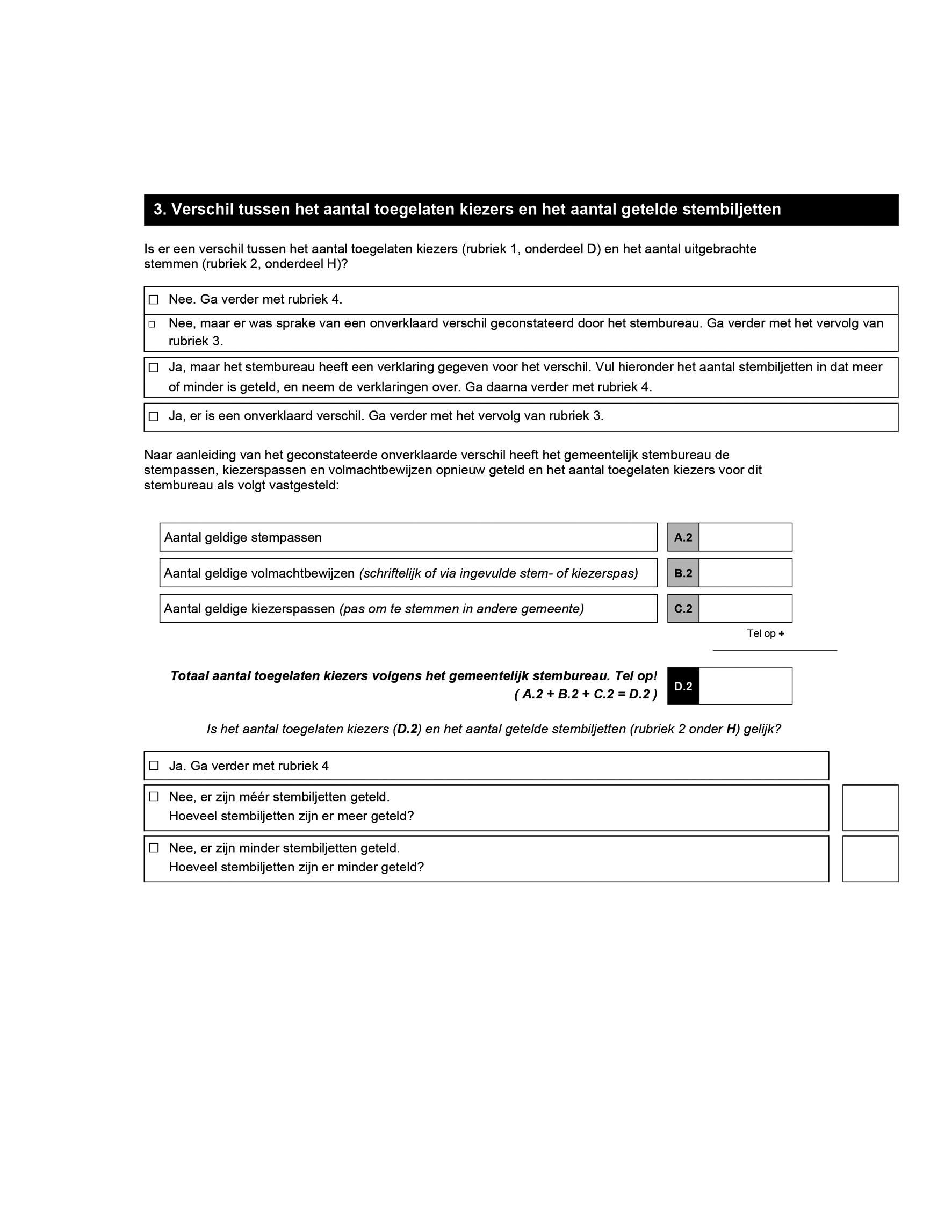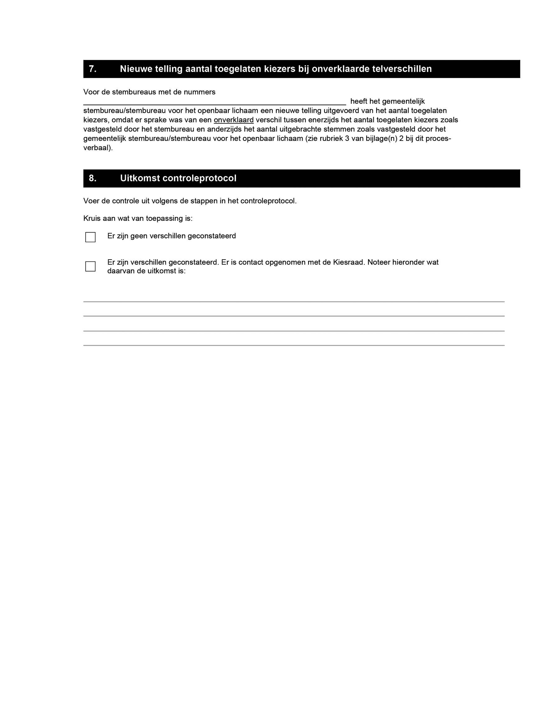 Bij het model voor het hoofdstembureau is bij rubriek 4 het vak voor de uitkomst van de controle toegevoegd. Er moet hier worden aangekruist of er wel of geen verschillen zijn geconstateerd na het uitvoeren van de controle. Indien er verschillen zijn geconstateerd moet er contact worden opgenomen met de Kiesraad. De uitkomst van het contact met de Kiesraad moet worden genoteerd op het proces-verbaal. Hierna moet worden aangekruist of er voor de invoer van de uitslagen van de gemeentelijk stembureaus gebruik is gemaakt van bestanden die zijn uitgewisseld via het platform ‘Teluitslagen’. Indien hier geen gebruik van is gemaakt moet worden genoteerd voor welke gemeenten de resultaten van de papieren processen-verbaal twee keer handmatig zijn ingevoerd in de uitslagensoftware. Vervolgens moet worden genoteerd of gemeentelijk stembureaus verschillen hebben geconstateerd bij de uitvoering van de controle, in welke gemeenten dit geconstateerd is en wat de gemeentelijk stembureaus hierover hebben opgeschreven.