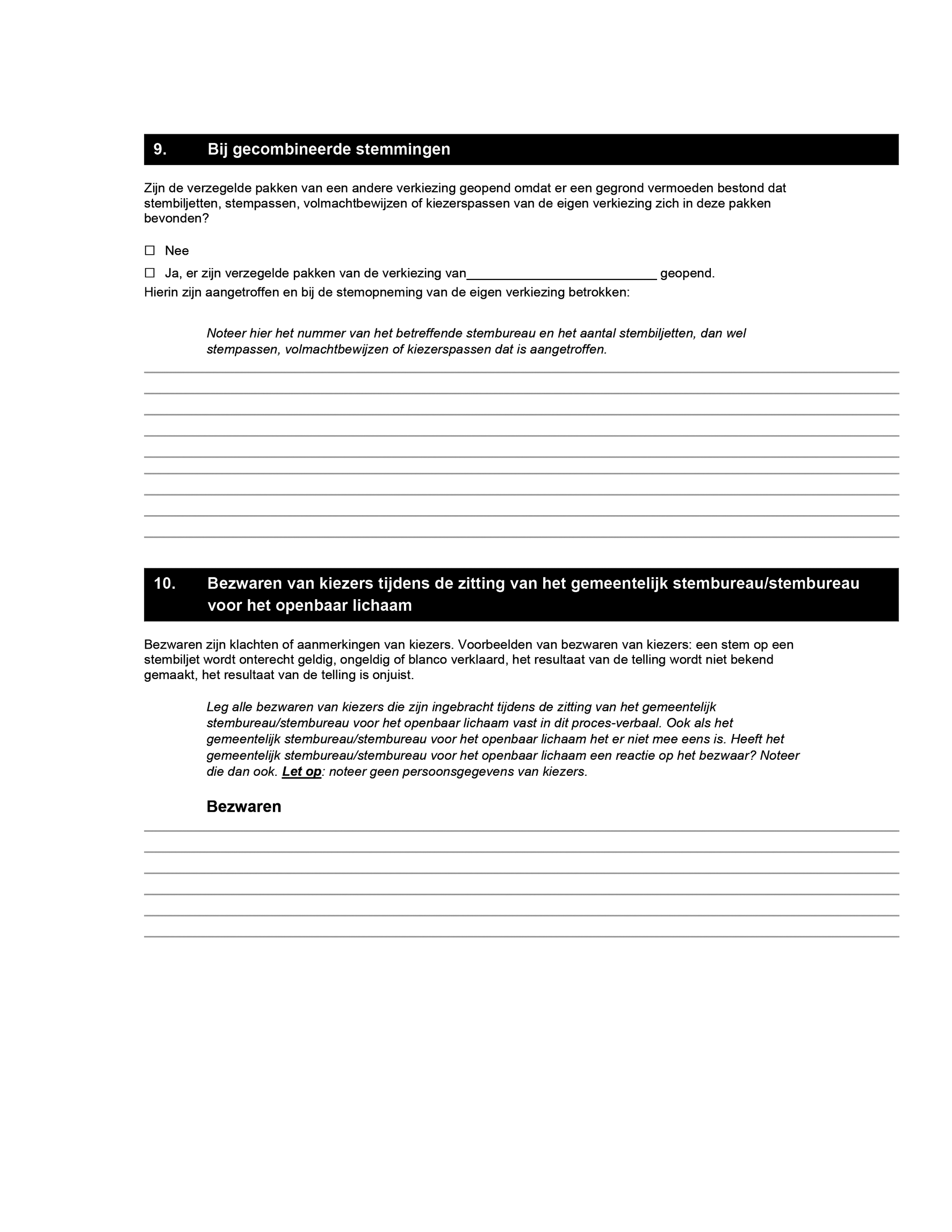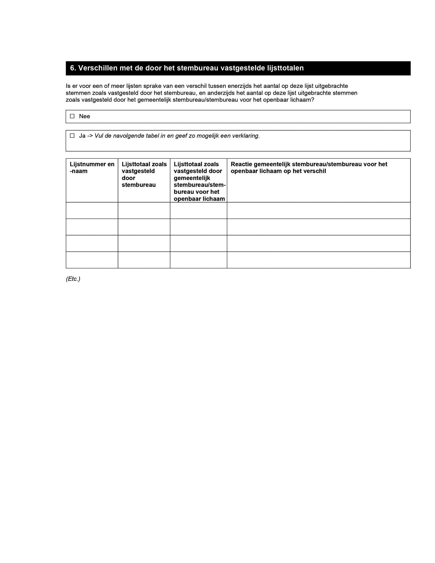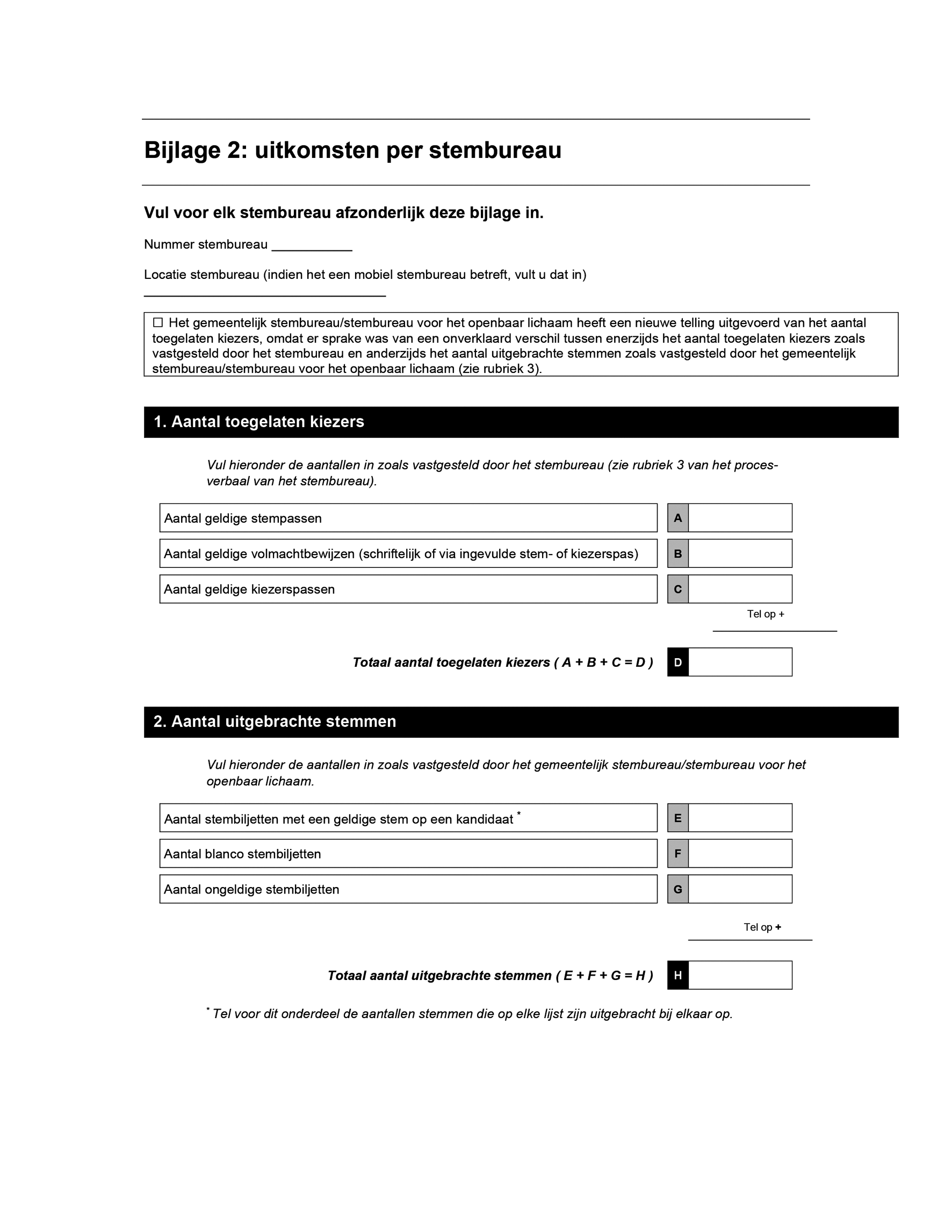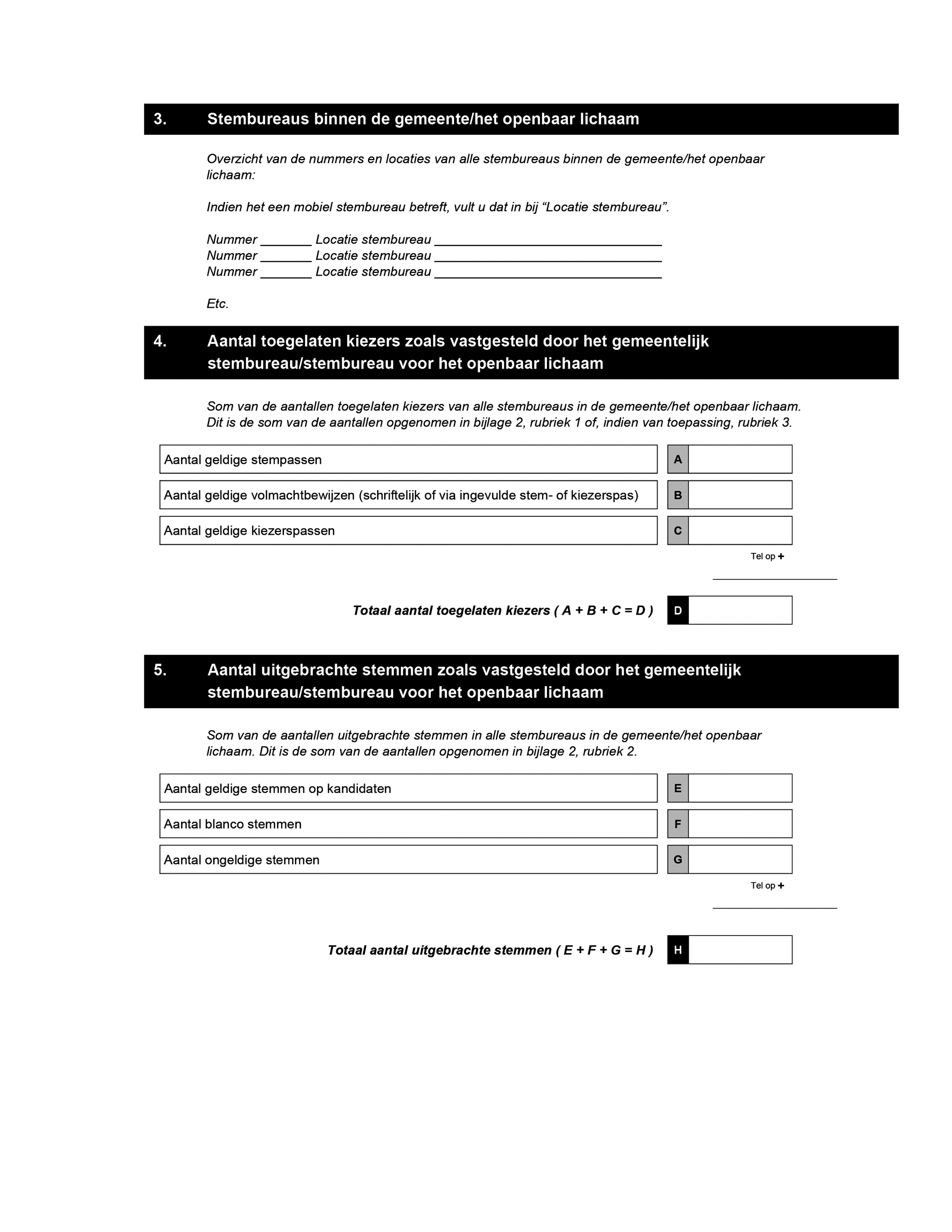 Bij het model voor het hoofdstembureau is bij rubriek 4 het vak voor de uitkomst van de controle toegevoegd. Er moet hier worden aangekruist of er wel of geen verschillen zijn geconstateerd na het uitvoeren van de controle. Indien er verschillen zijn geconstateerd moet er contact worden opgenomen met de Kiesraad. De uitkomst van het contact met de Kiesraad moet worden genoteerd op het proces-verbaal. Hierna moet worden aangekruist of er voor de invoer van de uitslagen van de gemeentelijk stembureaus gebruik is gemaakt van bestanden die zijn uitgewisseld via het platform ‘Teluitslagen’. Indien hier geen gebruik van is gemaakt moet worden genoteerd voor welke gemeenten de resultaten van de papieren processen-verbaal twee keer handmatig zijn ingevoerd in de uitslagensoftware. Vervolgens moet worden genoteerd of gemeentelijk stembureaus verschillen hebben geconstateerd bij de uitvoering van de controle, in welke gemeenten dit geconstateerd is en wat de gemeentelijk stembureaus hierover hebben opgeschreven.