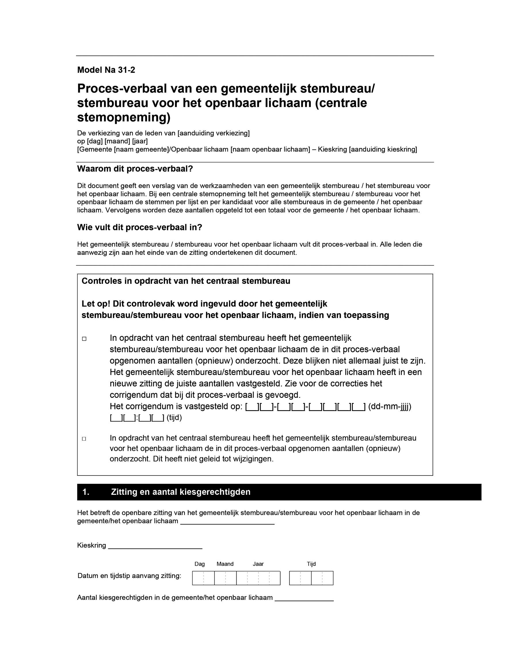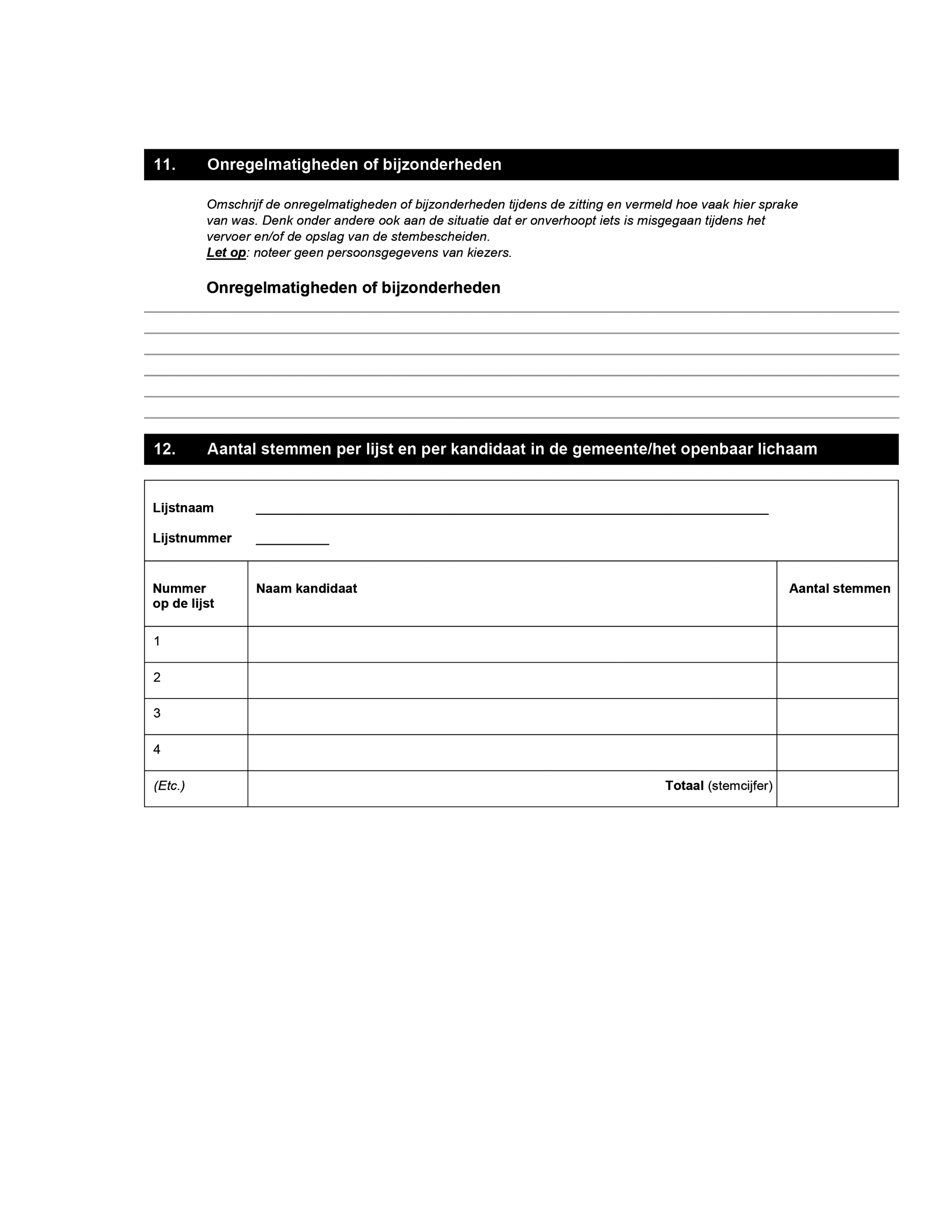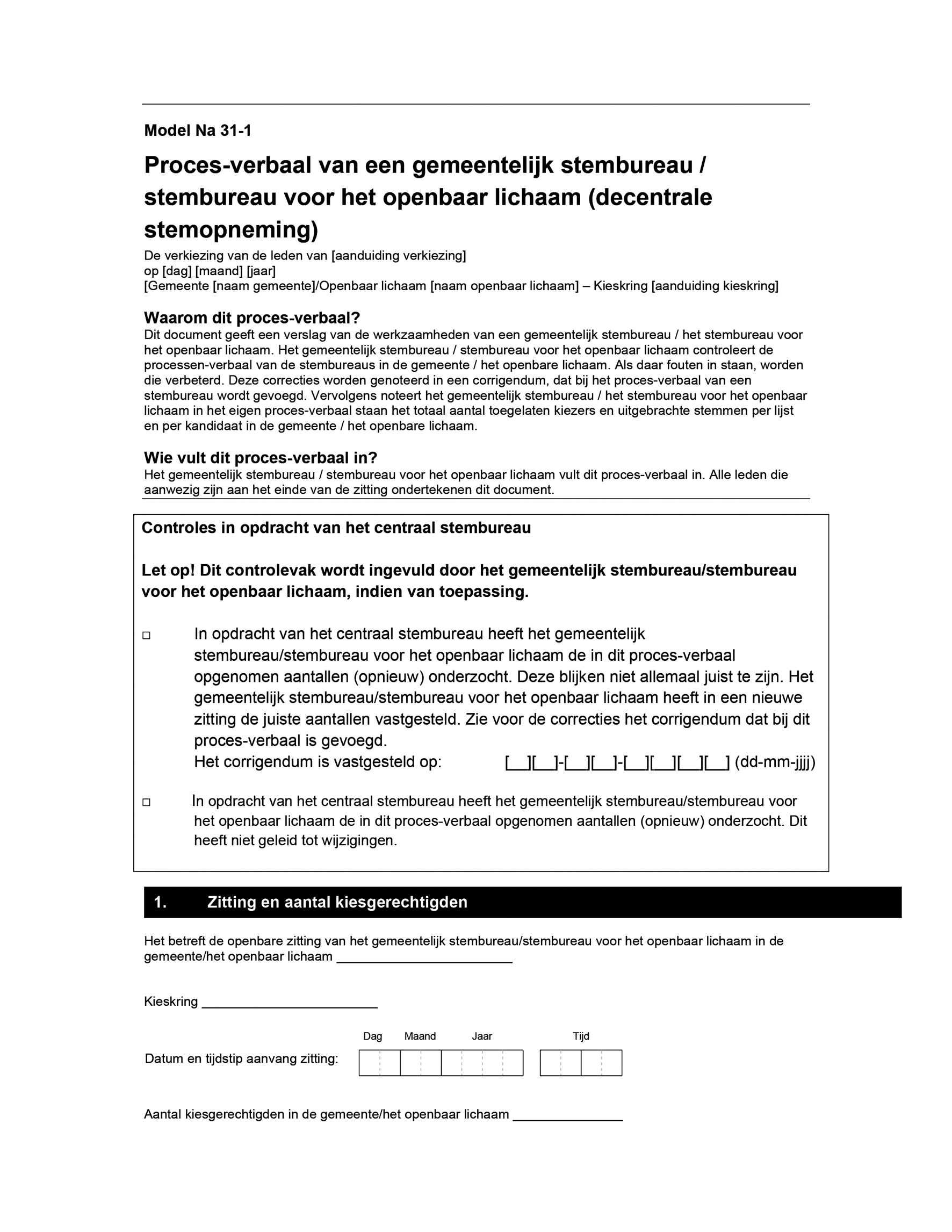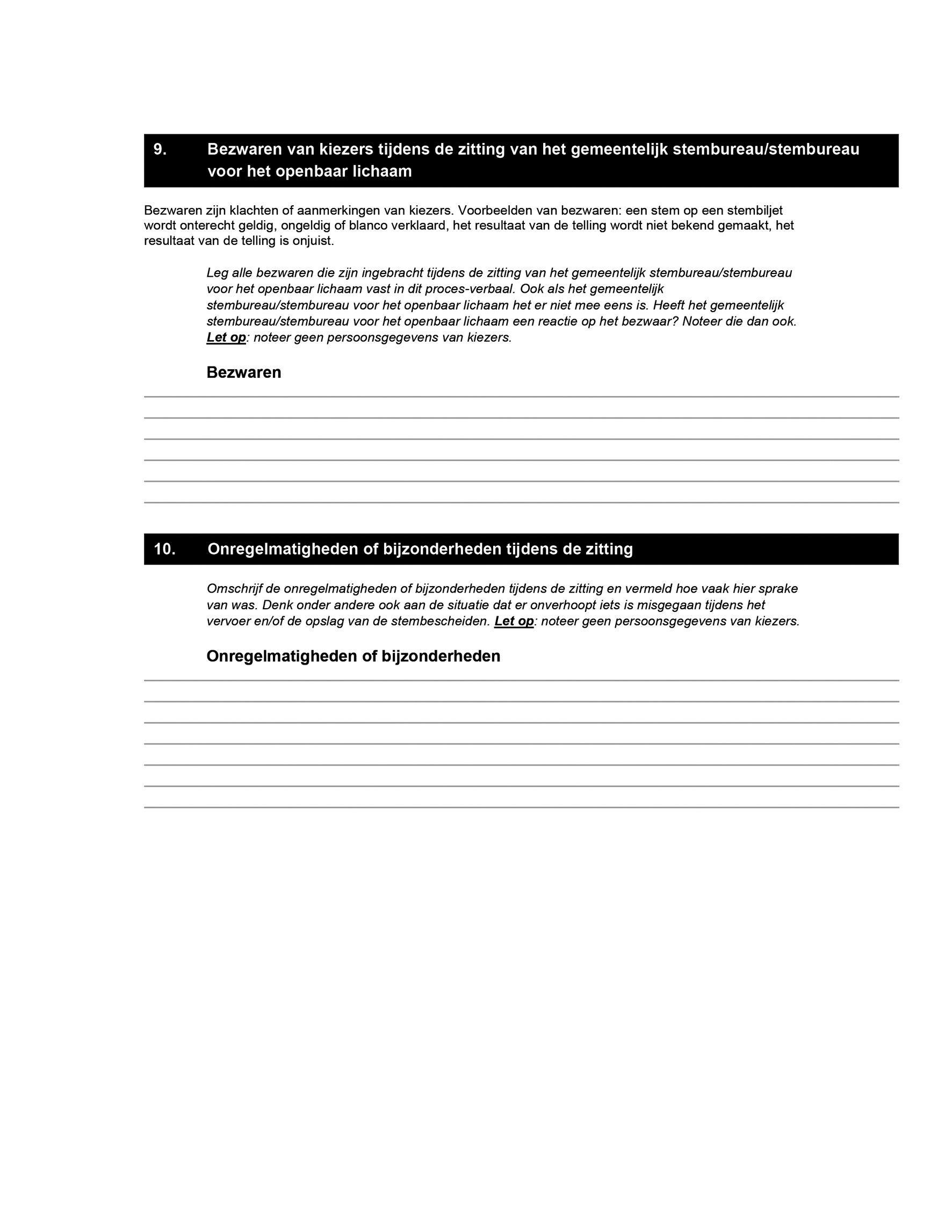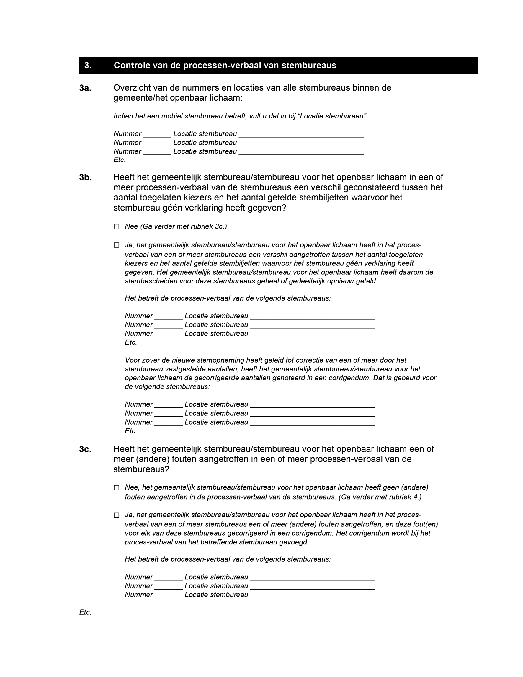 Bij het model voor het hoofdstembureau is bij rubriek 4 het vak voor de uitkomst van de controle toegevoegd. Er moet hier worden aangekruist of er wel of geen verschillen zijn geconstateerd na het uitvoeren van de controle. Indien er verschillen zijn geconstateerd moet er contact worden opgenomen met de Kiesraad. De uitkomst van het contact met de Kiesraad moet worden genoteerd op het proces-verbaal. Hierna moet worden aangekruist of er voor de invoer van de uitslagen van de gemeentelijk stembureaus gebruik is gemaakt van bestanden die zijn uitgewisseld via het platform ‘Teluitslagen’. Indien hier geen gebruik van is gemaakt moet worden genoteerd voor welke gemeenten de resultaten van de papieren processen-verbaal twee keer handmatig zijn ingevoerd in de uitslagensoftware. Vervolgens moet worden genoteerd of gemeentelijk stembureaus verschillen hebben geconstateerd bij de uitvoering van de controle, in welke gemeenten dit geconstateerd is en wat de gemeentelijk stembureaus hierover hebben opgeschreven.