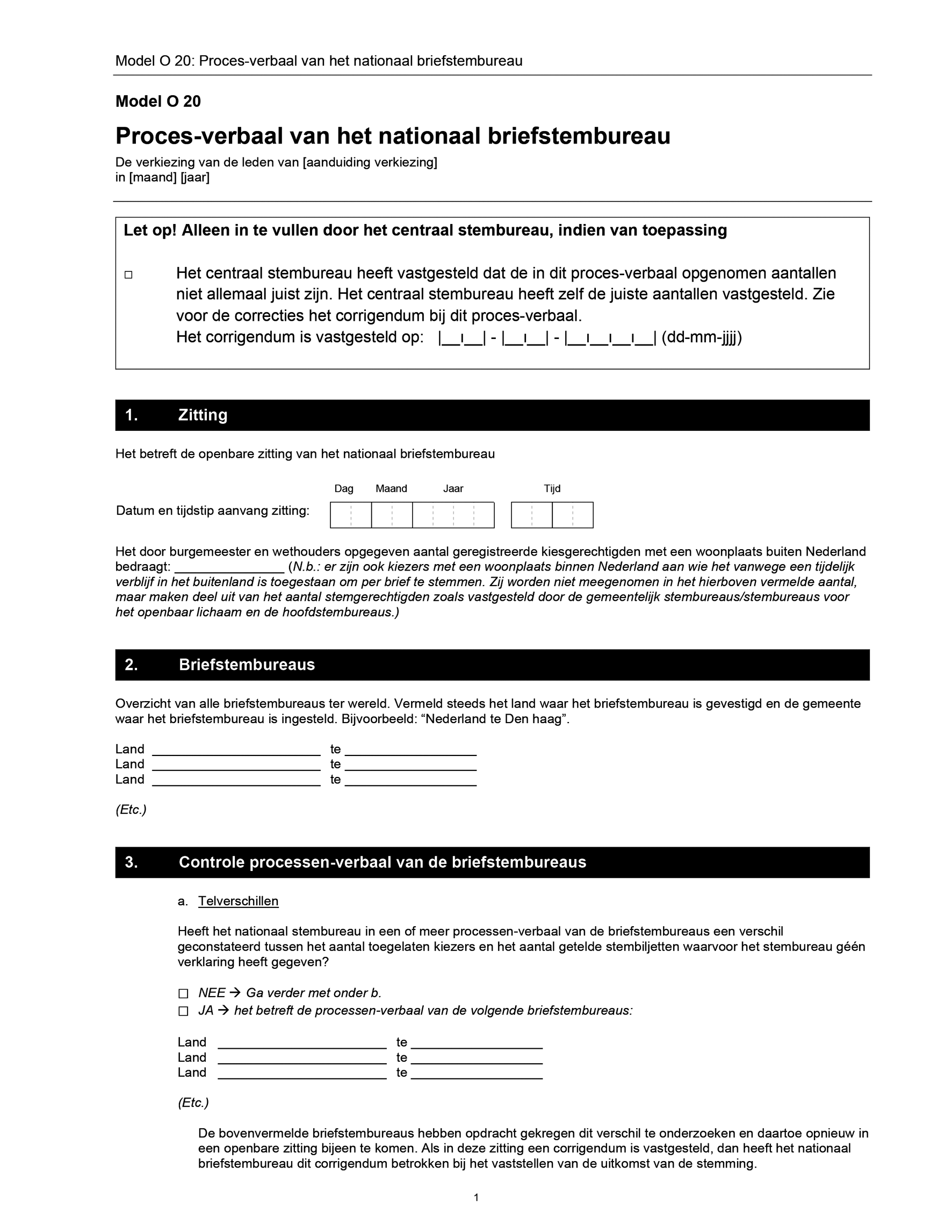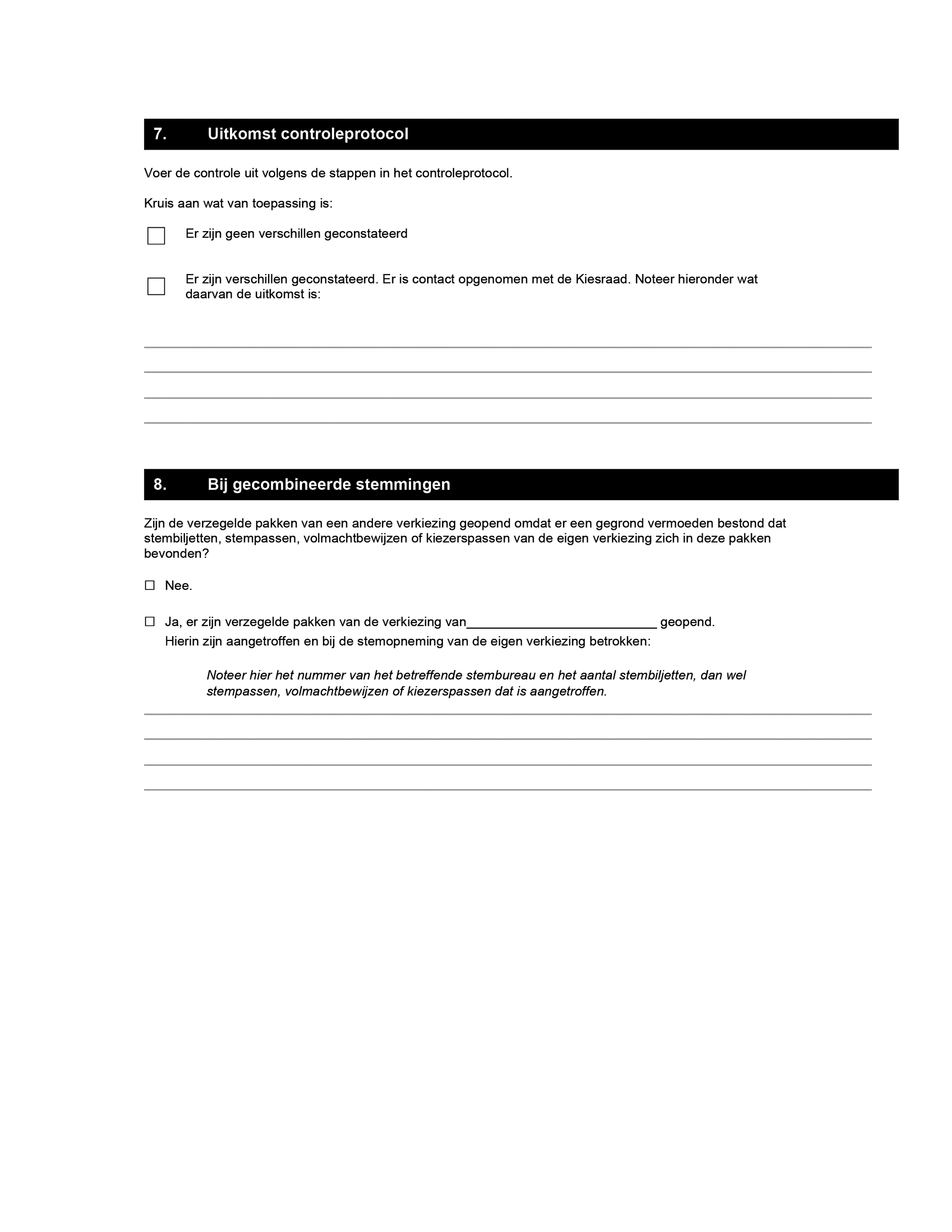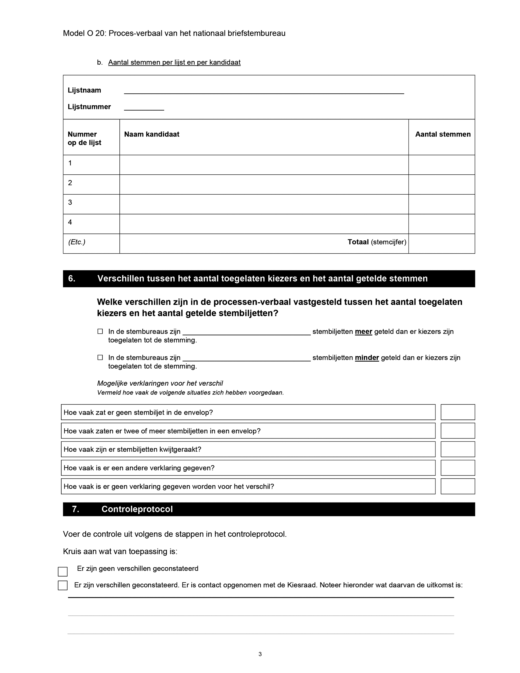 Bij het model voor het nationaal briefstembureau is bij rubriek 7 het vak voor de uitkomst van de controle toegevoegd. Er moet hier worden aangekruist of er wel of geen verschillen zijn geconstateerd na het uitvoeren van de controle. Indien er verschillen zijn geconstateerd moet er contact worden opgenomen met de Kiesraad. De uitkomst van het contact met de Kiesraad moet worden genoteerd op het proces-verbaal.